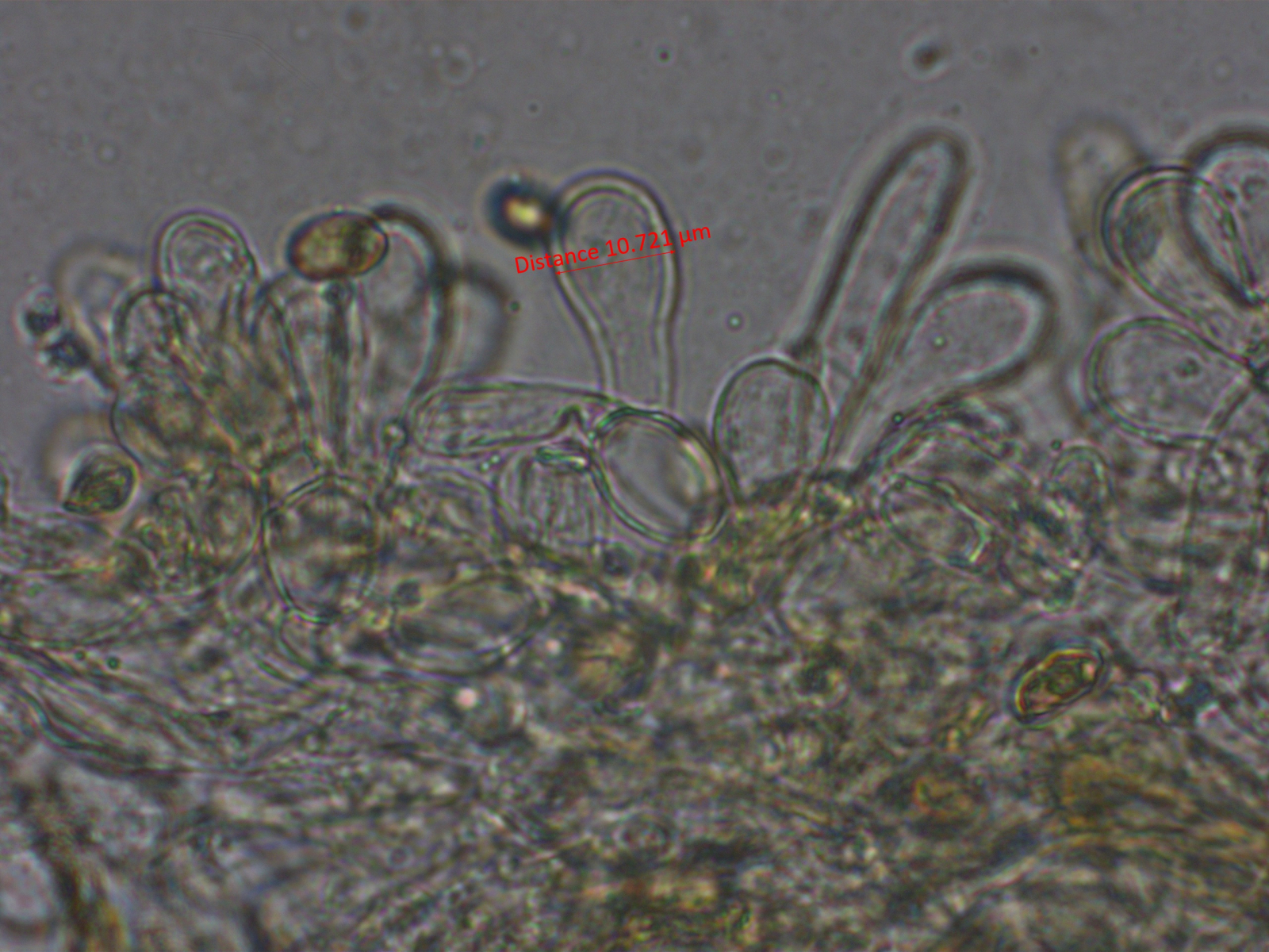 25-40 x 3-6 mm, gelbocker, bräunend, heller als der Hut. Auf ganzer Länge bräunlich bis gelbocker faserig.