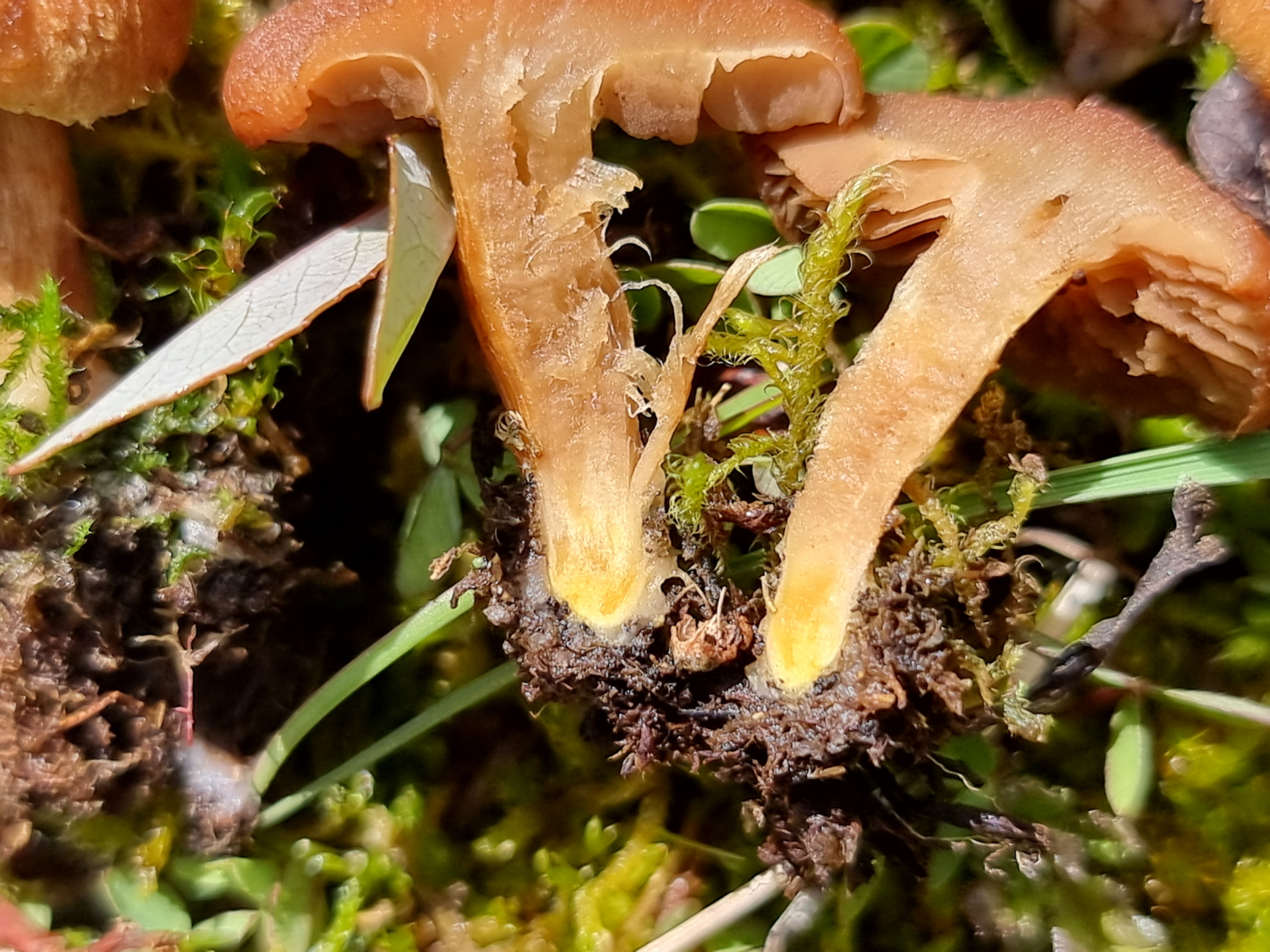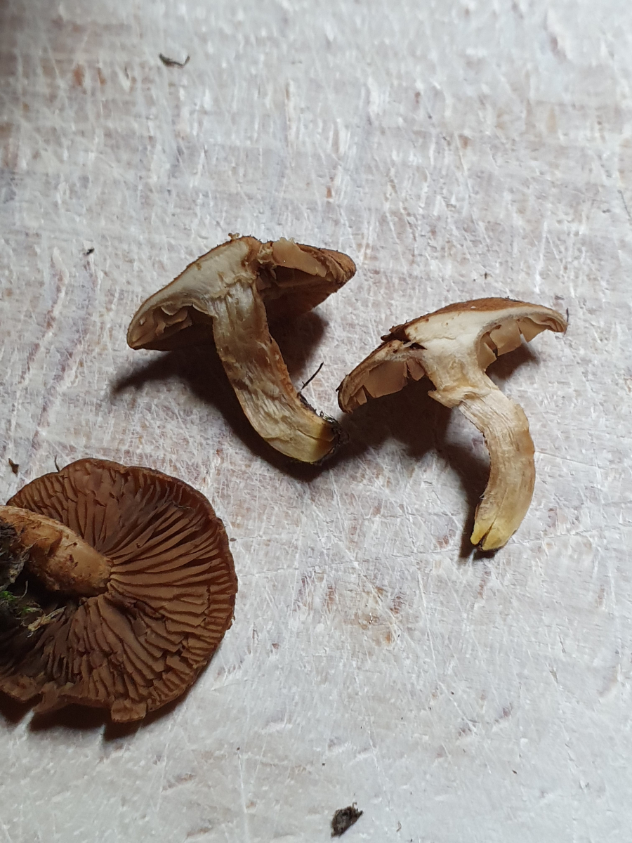 Gelblich bis hellbraun, in der Stielbasis vor allem bei jungen Exemplaren auffallend gelb.