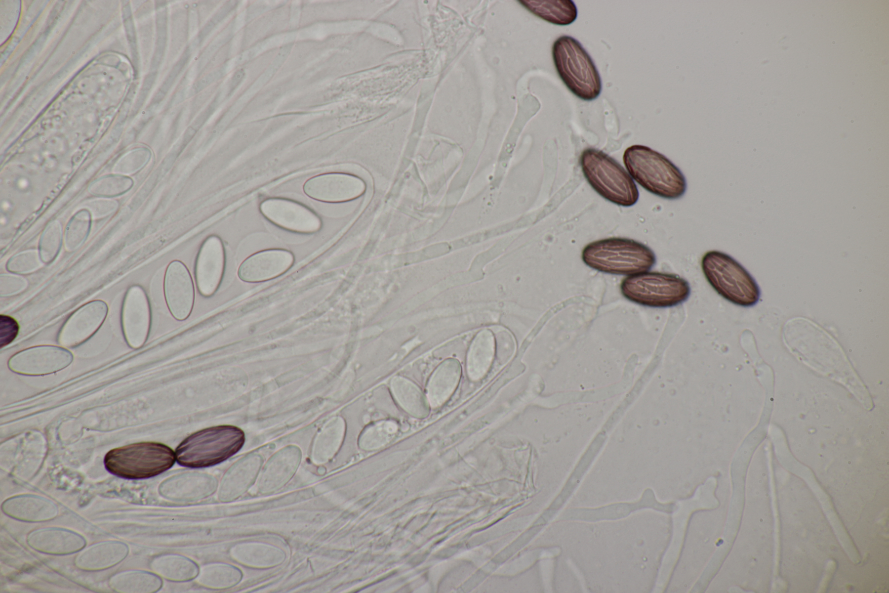 5. Ein Ascozonus mit Sporen von (12.1+-0.8) µm x (3.8+-0.2) µm, Q=3.2+-0.2, (10.9-14.1) µm x (3.3-4.2) µm, Q=2.8-3.6. Die genau Zahl von Sporen im Ascus konnte ich leider nicht ermitteln. Es scheinen aber mehr als 32 Sporen zu sein. Für Ascozonus woolhopensis scheinen die Sporen etwas klein zu sein, wenn man die Angaben im Doveri nimmt. Oder paßt das trotzdem noch? Das wäre ja offenbar die mit Abstand häufigste Art der Gattung bei uns.