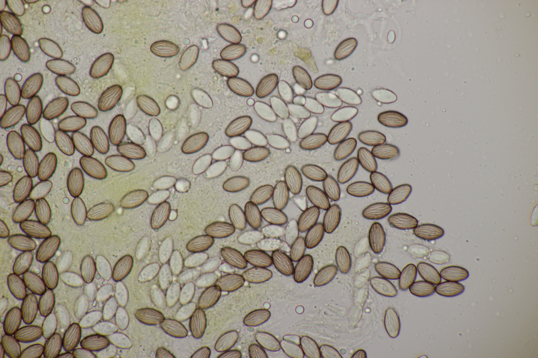 Die Sporen sind deutlich schlanker, 18-24 x 10-13 µm. Hier 18-21 x 10 µm.