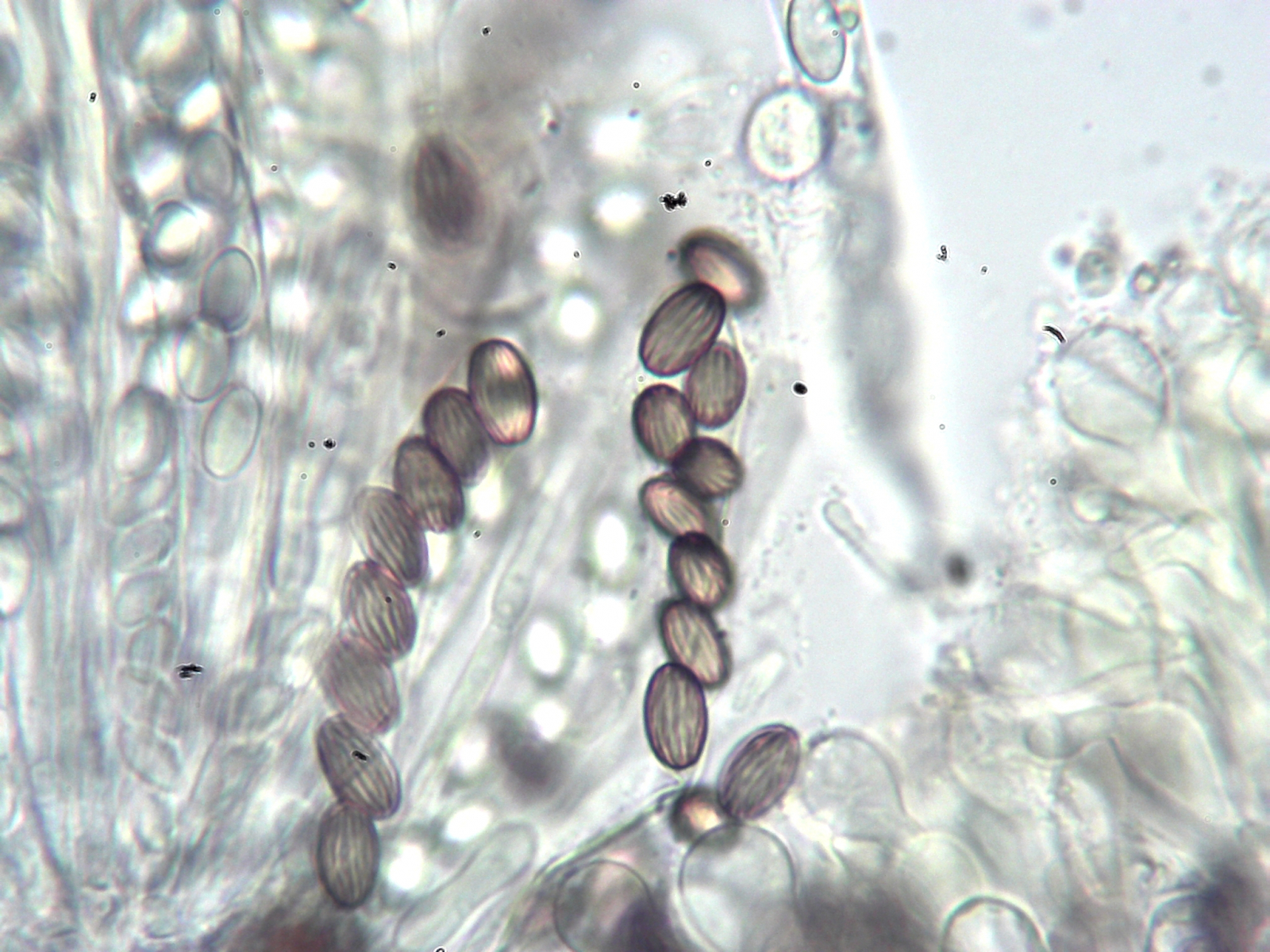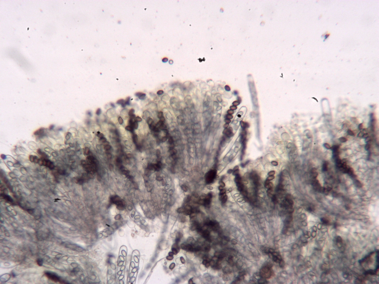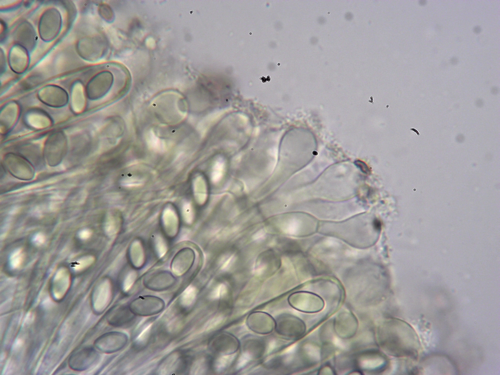 Heute fand ich ein ca. 2 mm großes gelblichgrünes kissenförmiges Apothecium. Unter dem Mikroskop war die Gattung sofort klar - ein Ascobolus. Sie Sporen haben ein linienförmiges Ornament und messen 11,5-12,5 x 7-7,5 µm. Der gelbgrüne Fasrbstoff steckt in den Paraphysen, die an den Enden auffällig angeschwollen sind.