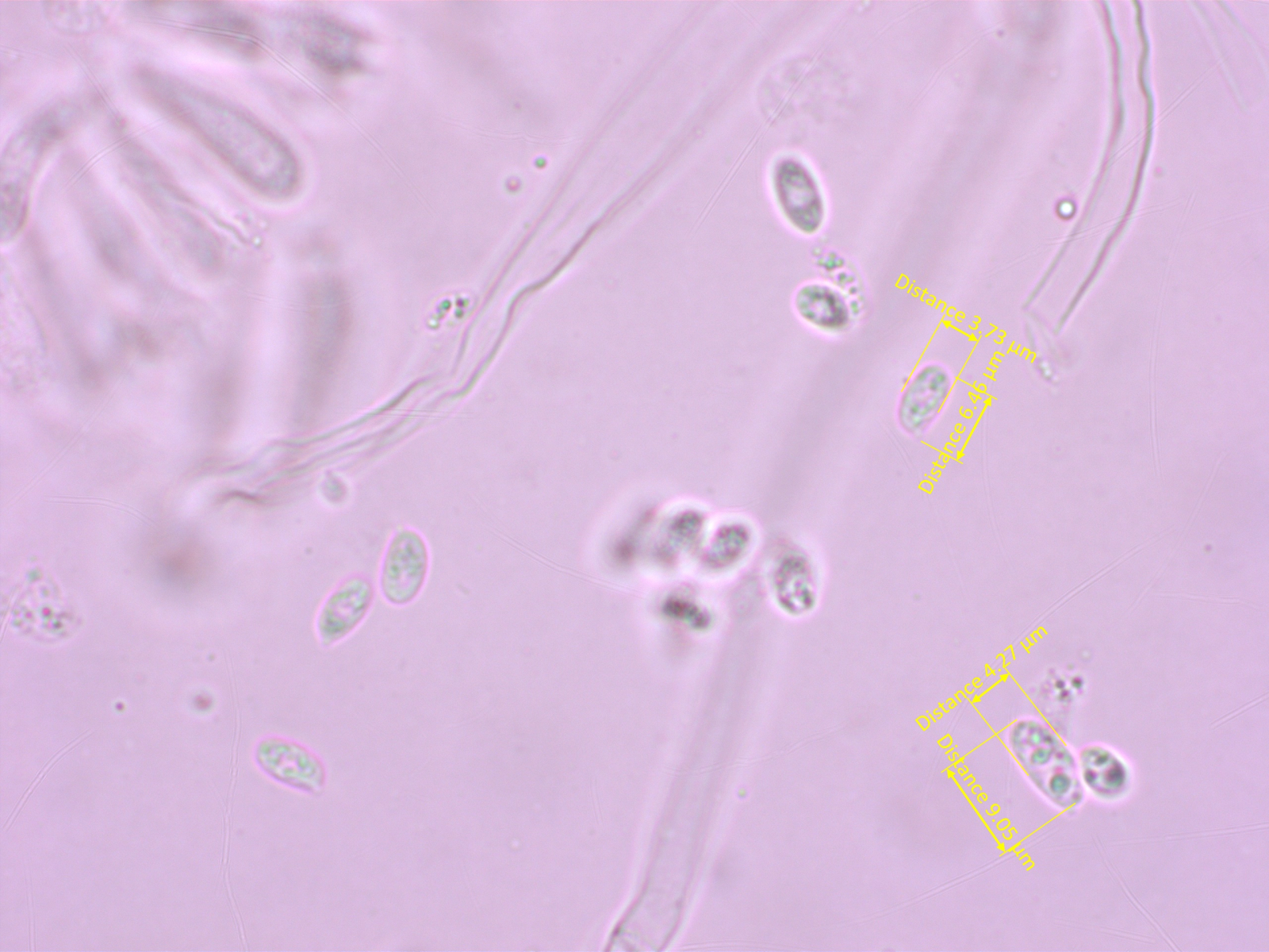 Der Schwimmbad-Geruch in Verbindung mit den schlanken, in Seitenansicht etwas asymetrisch geformten Sporen (die Zeichnung von Lamoure zeigt exakt die Sporenform meiner Kollektion!) deutet sehr auf diese Art hin. In meinen Notizen hatte ich mir vermerkt, dass die Pilze nicht nur so riechen wie Entoloma nidorosum, sondern auch so aussehen, abgesehen vom größeren Braunanteil in den Hutfarben. Ich kann zwar leider kein Französisch, aber mit etwas Italienisch und einem französischen Wörterbuch bewaffnet habe ich mir die Originalbeschreibung von C. harmajae durchgelesen. Die Hutoberfläche beschreibt Lamoure als einfarbig graubraun und feucht-fettig, was gut passt. Von einer Ixocutis schreibt er zwar nichts, er hat aber offenbar auch nur einen Skalpschnitt angeschaut.