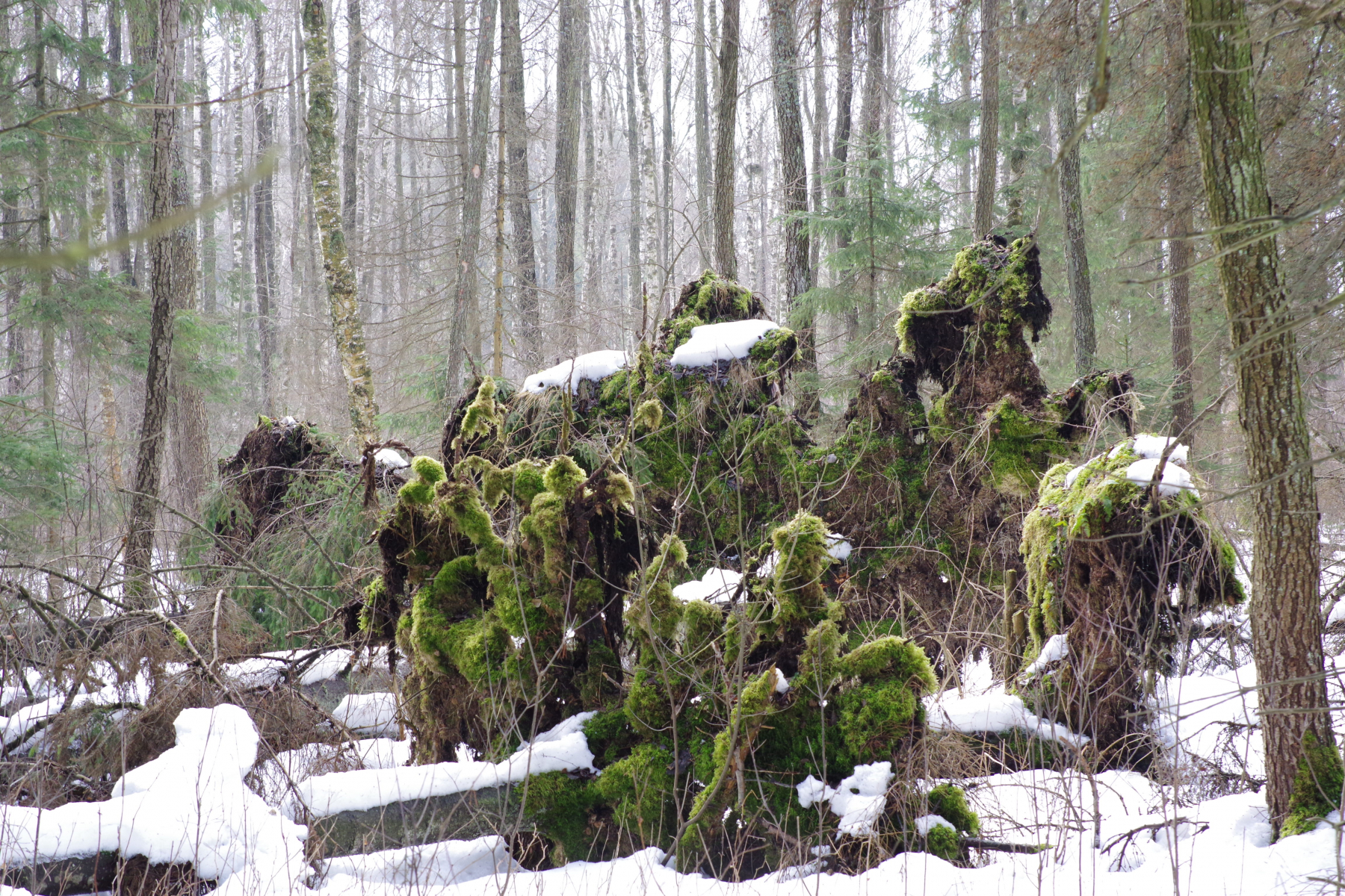5) der linke Stummel hat oben ein Nest drinnen, deswegen Moose und Zweige