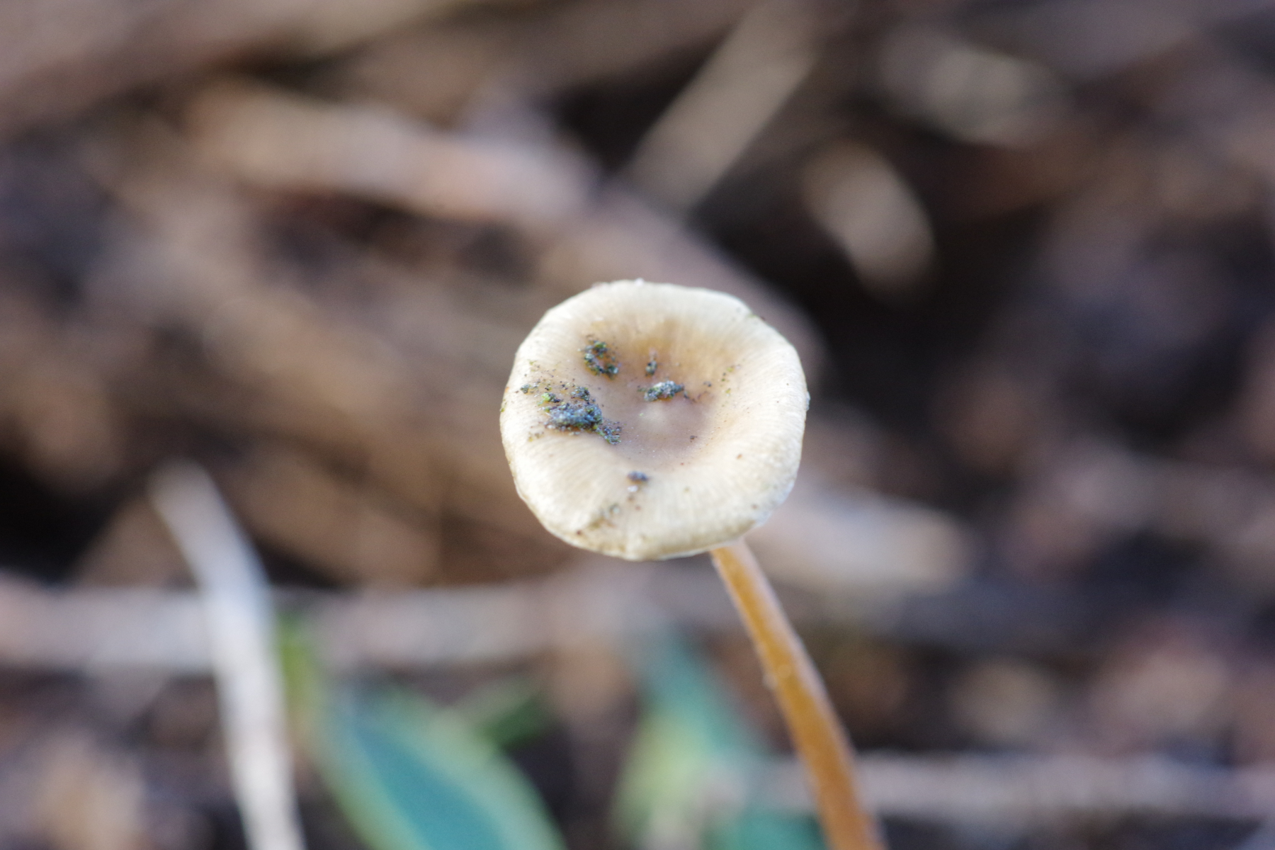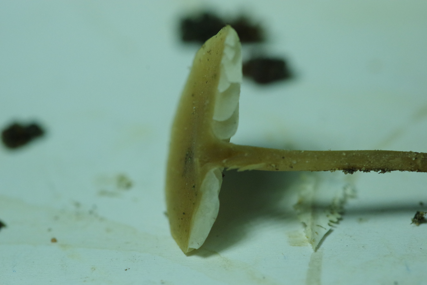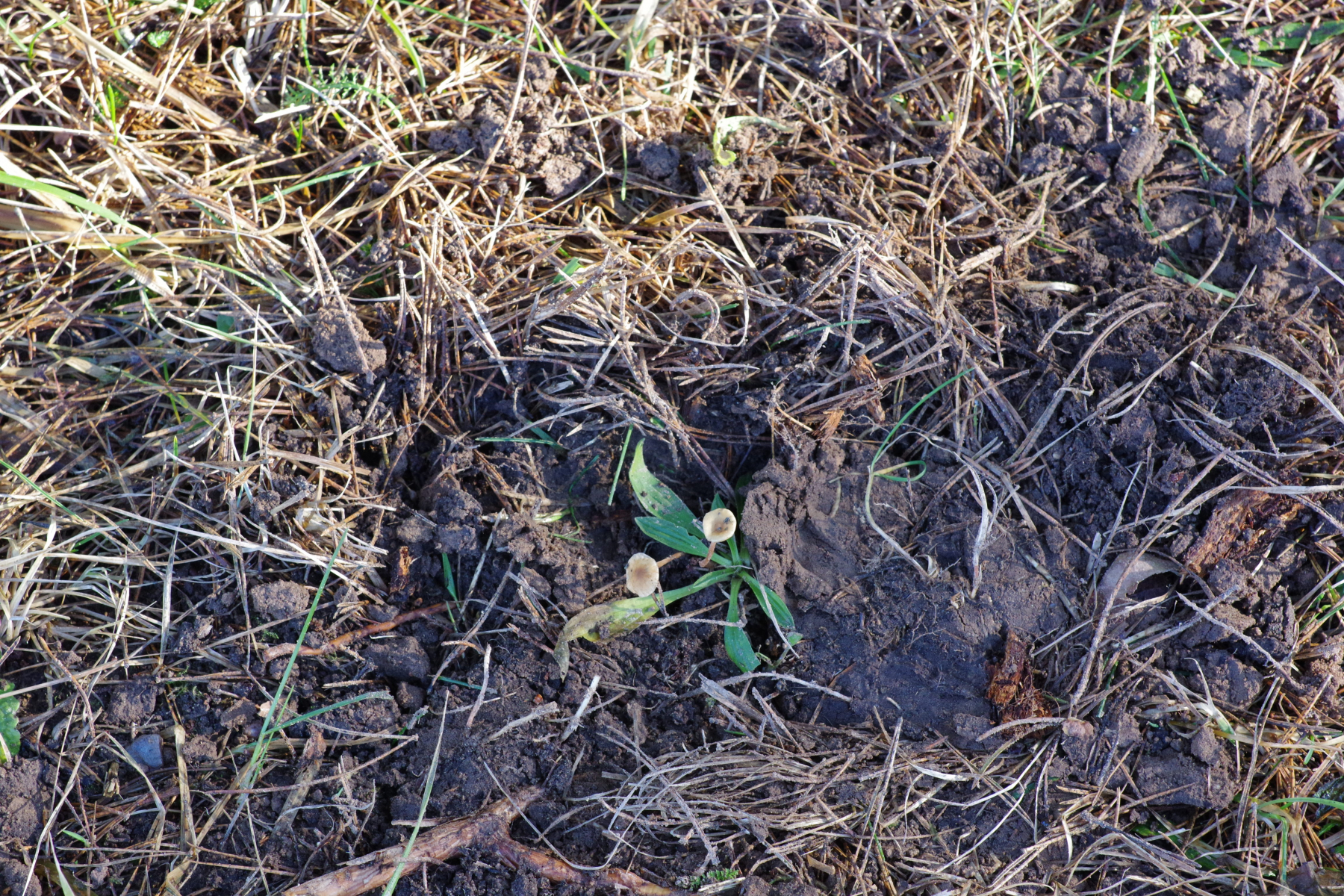 Spannender ist Nr. 2, unter Kiefer, da liegt der Verdacht nah, dass es ein Zapfenrübling sein könnte, zur Not auch der FiZaRü, denn bei hunderten Kiefernzapfen unter der Hoflinde ist klar, dass die Spechtdichte groß genug ist, hier etwas zu mischen. Aber ich bin der Sache, ganz im Wortsinne, auf den Grund gegangen - spatentief ist kein Zapfen vorhanden, weder noch, auch nicht in alt. Vielleicht ein Helmling? Geruch unauffällig, Geschmack leicht fad. Soviel sollte ja um die Jahreszeit nicht in Frage kommen.