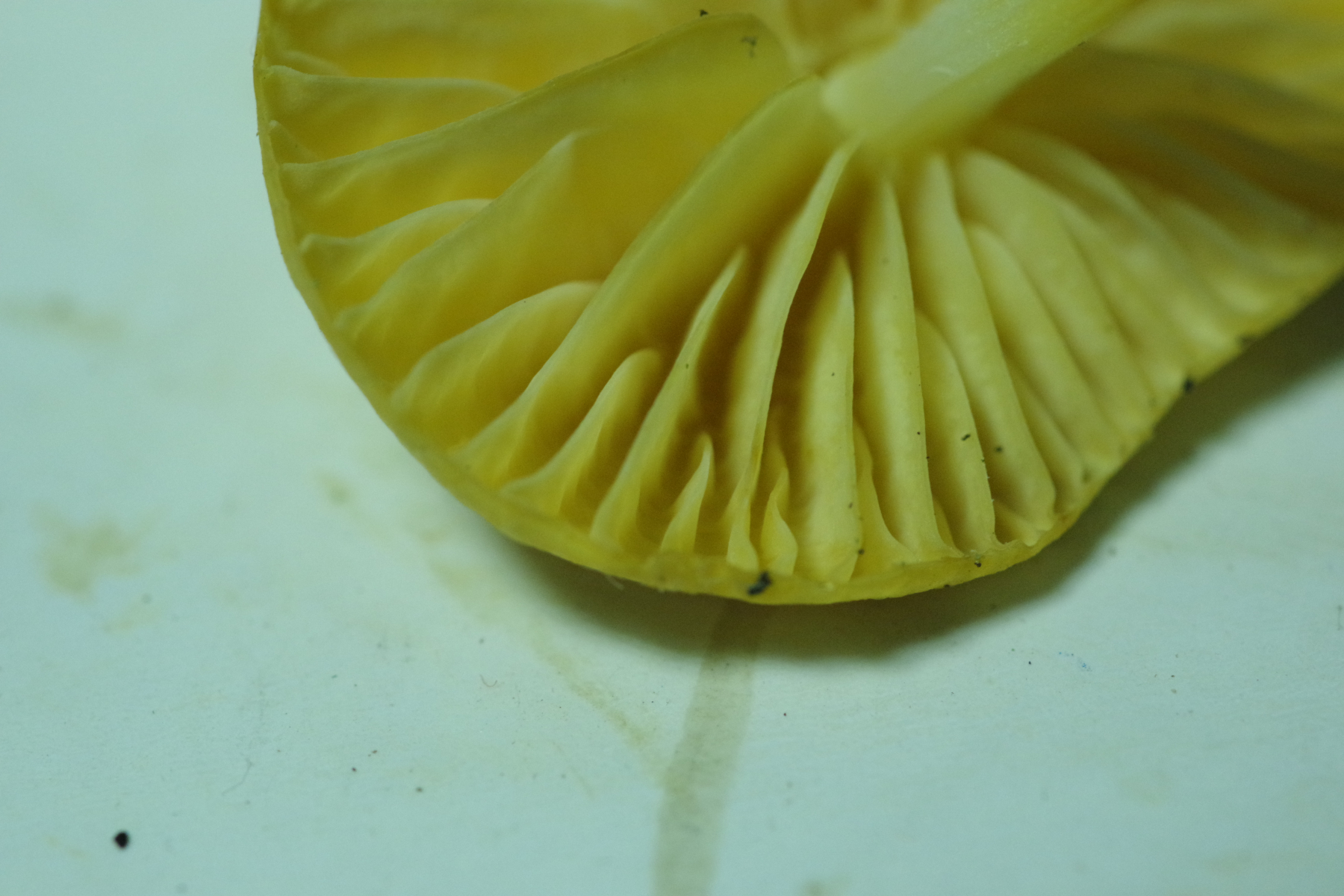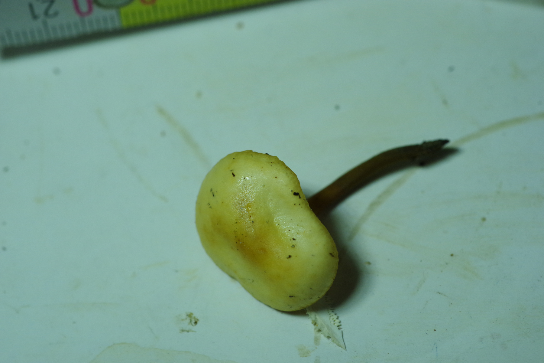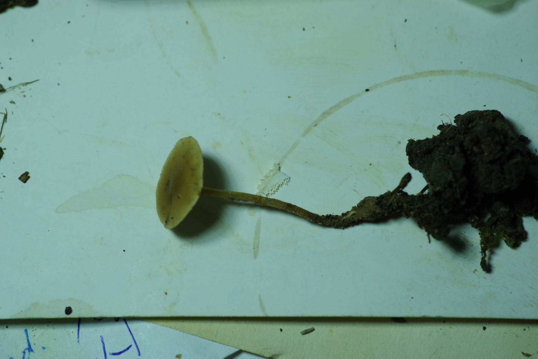 Spannender ist Nr. 2, unter Kiefer, da liegt der Verdacht nah, dass es ein Zapfenrübling sein könnte, zur Not auch der FiZaRü, denn bei hunderten Kiefernzapfen unter der Hoflinde ist klar, dass die Spechtdichte groß genug ist, hier etwas zu mischen. Aber ich bin der Sache, ganz im Wortsinne, auf den Grund gegangen - spatentief ist kein Zapfen vorhanden, weder noch, auch nicht in alt. Vielleicht ein Helmling? Geruch unauffällig, Geschmack leicht fad. Soviel sollte ja um die Jahreszeit nicht in Frage kommen.