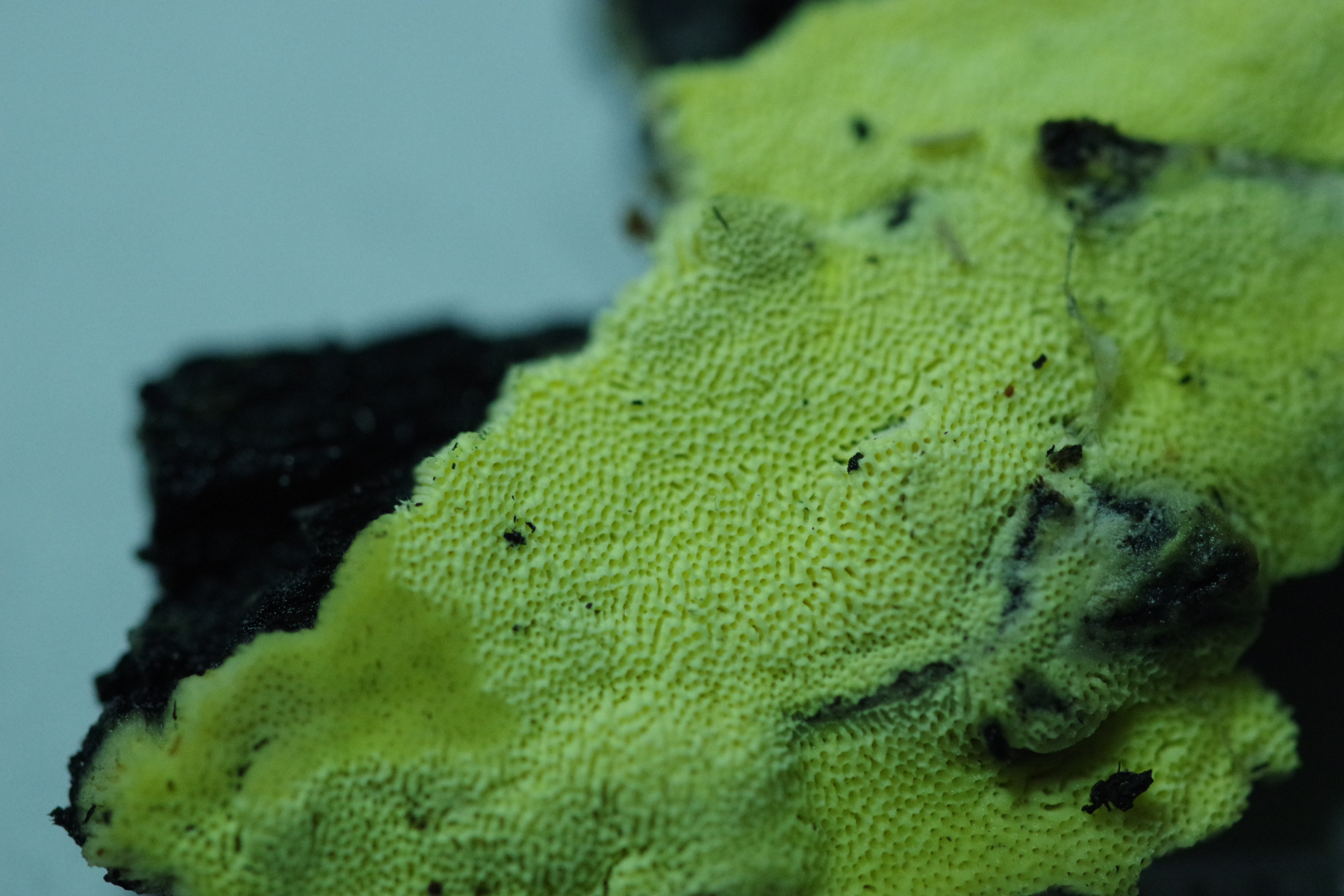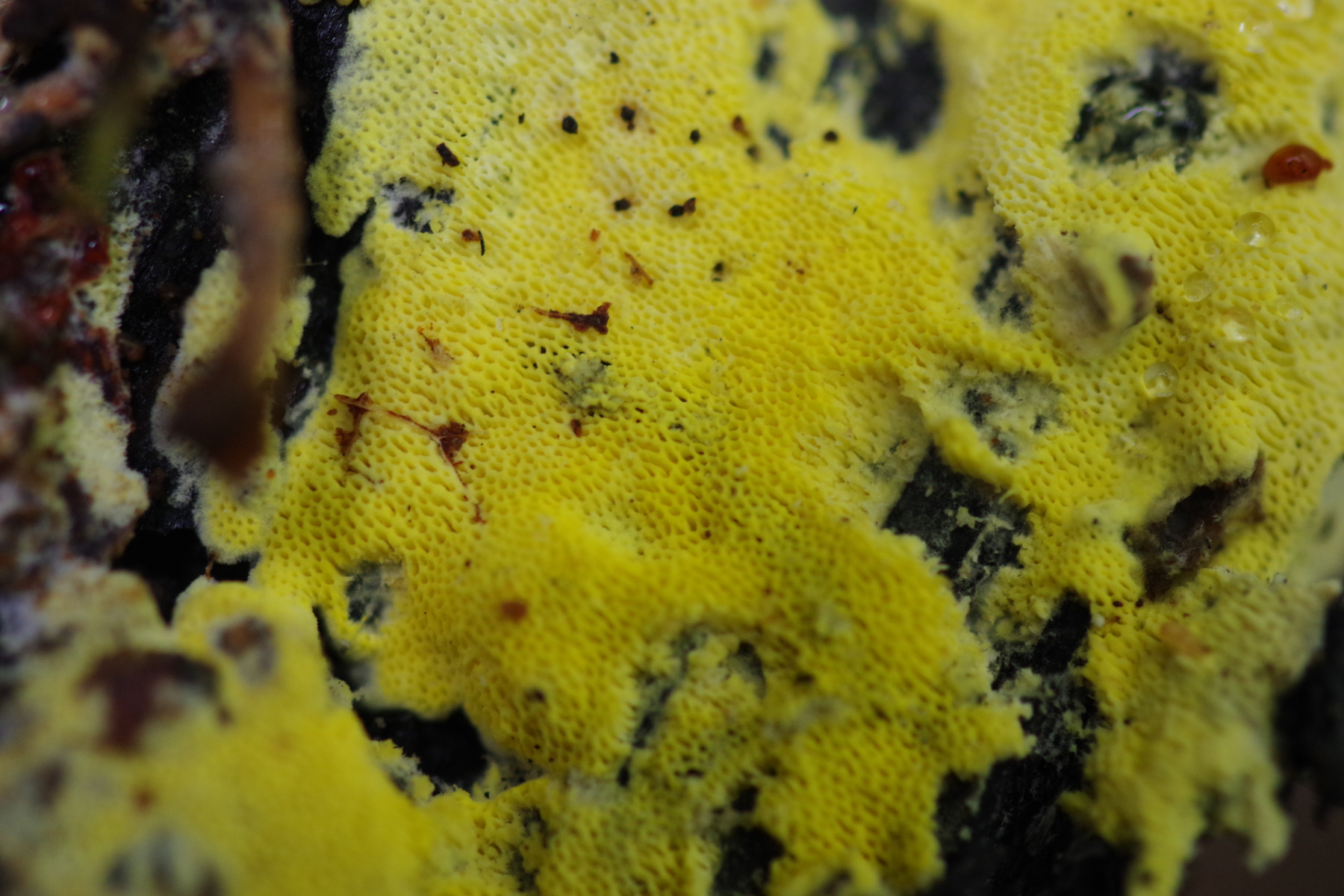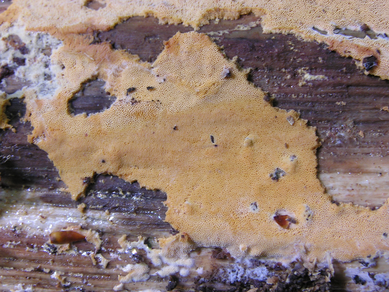 makroskopisch käme Ceriporia gut hin. Ich hab aber nicht geschaut, obs da tatsächlich so gelbe gibt, mir ist auf jeden Fall keine bekannt. Die Gattung wäre aber unschwer rauszubekommen (monomitisch, keine Schnallen, keine Zystiden).