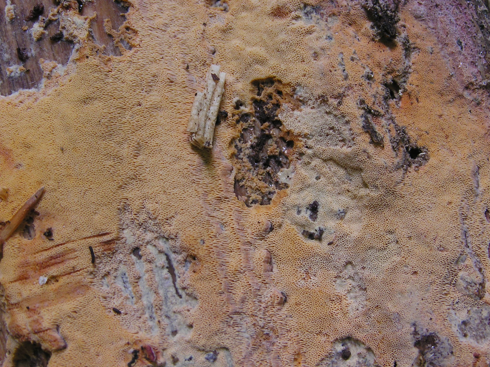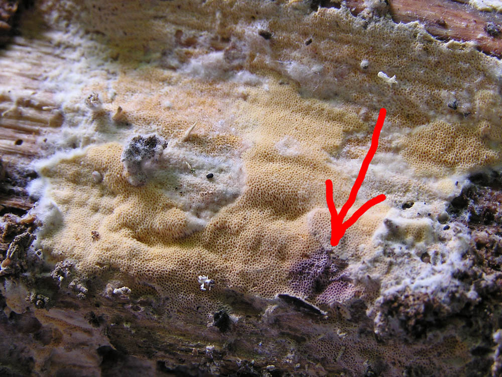 Die hat auch keine so gelben Poren (dafür gelbe Rhizomorphen). Eine Fibroporia mit gelben Poren gibt es aber auch, müsste ich aber nachgucken, da gab's irgendwie noch ein taxonomisches Probleem, ob die noch saxonica heißen kann oder jetzt einen anderen Namen hat...