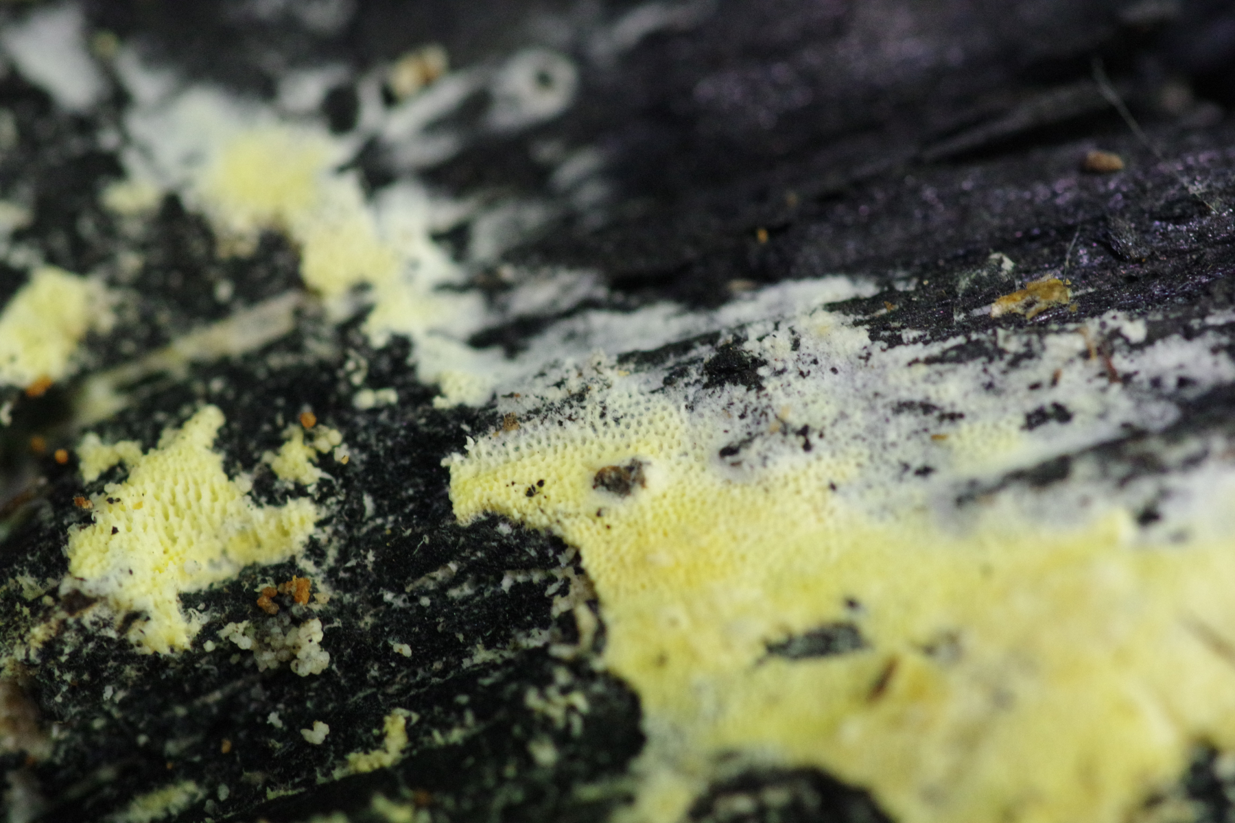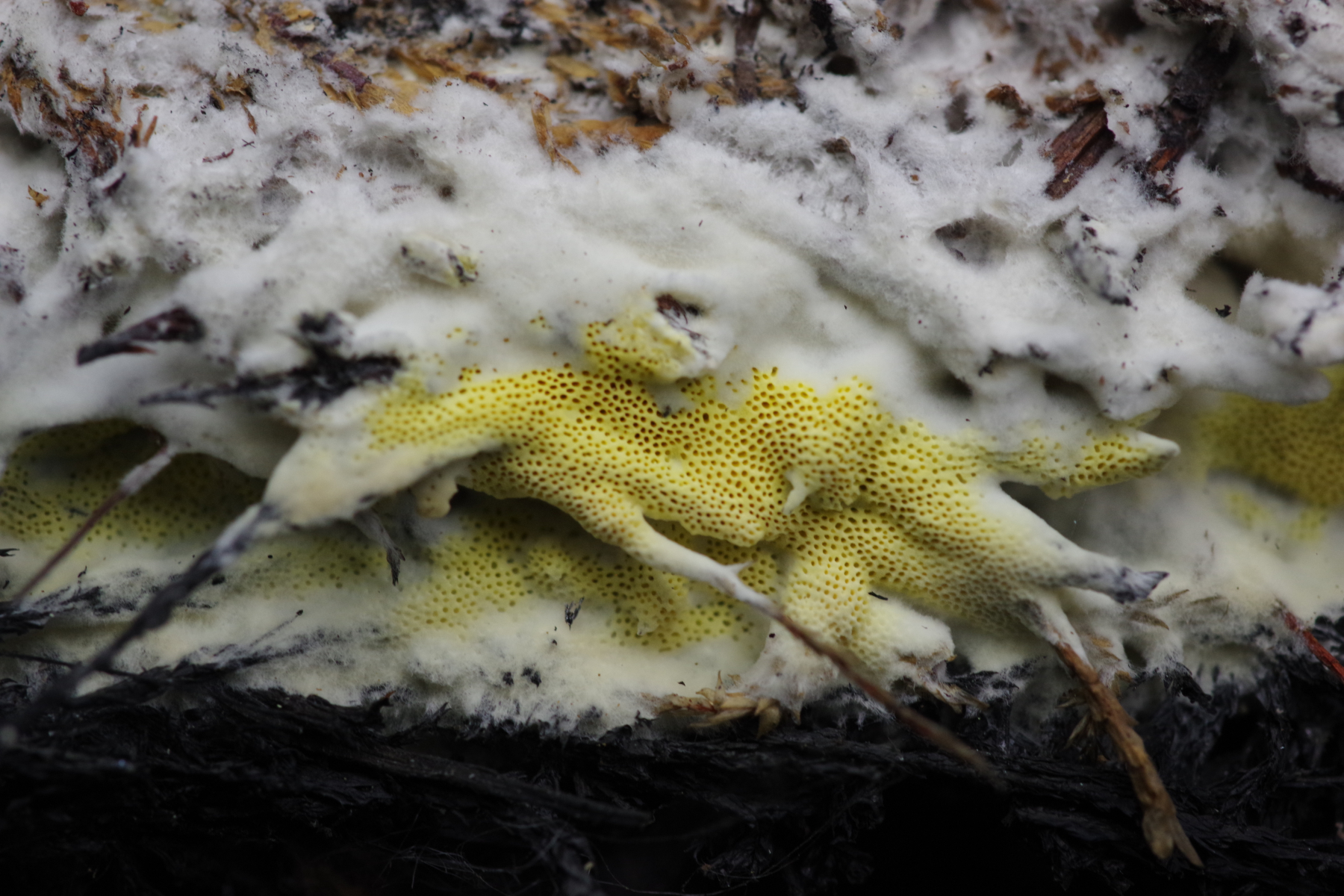 • Hallo allerseits, dieses Rätsel ist gelöst. Frank (tomentella) hat es als Antrodia xantha bestimmt. Die Annahme, dass die weiße und gelbe Form zusammengehören und je nach Dunkelheit, Feuchtigkeit und Wachstumsphase eher gelb werden, hat sich dabei bestätigt.