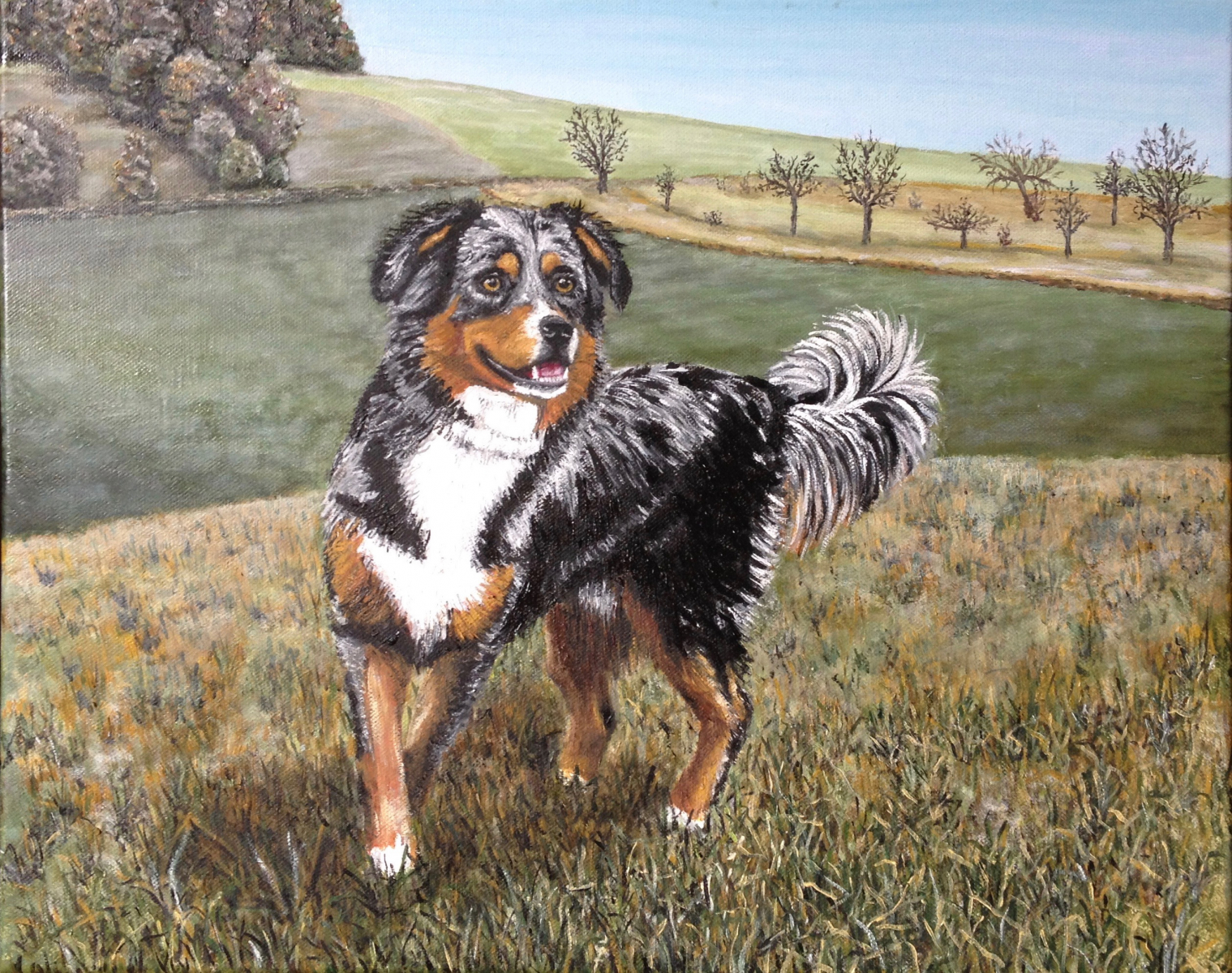 Den hab ich vorletzten Winter gemalt und dafür unendlich oft angeschaut und mit den beiden Ursprungsrassen verglichen. Der sieht so aus und ist ein tiefenentspannter Rüde, der allerdings ebenso bemüht ist wie die Hera vom Schorsch das Rudel zusammenzuhalten.