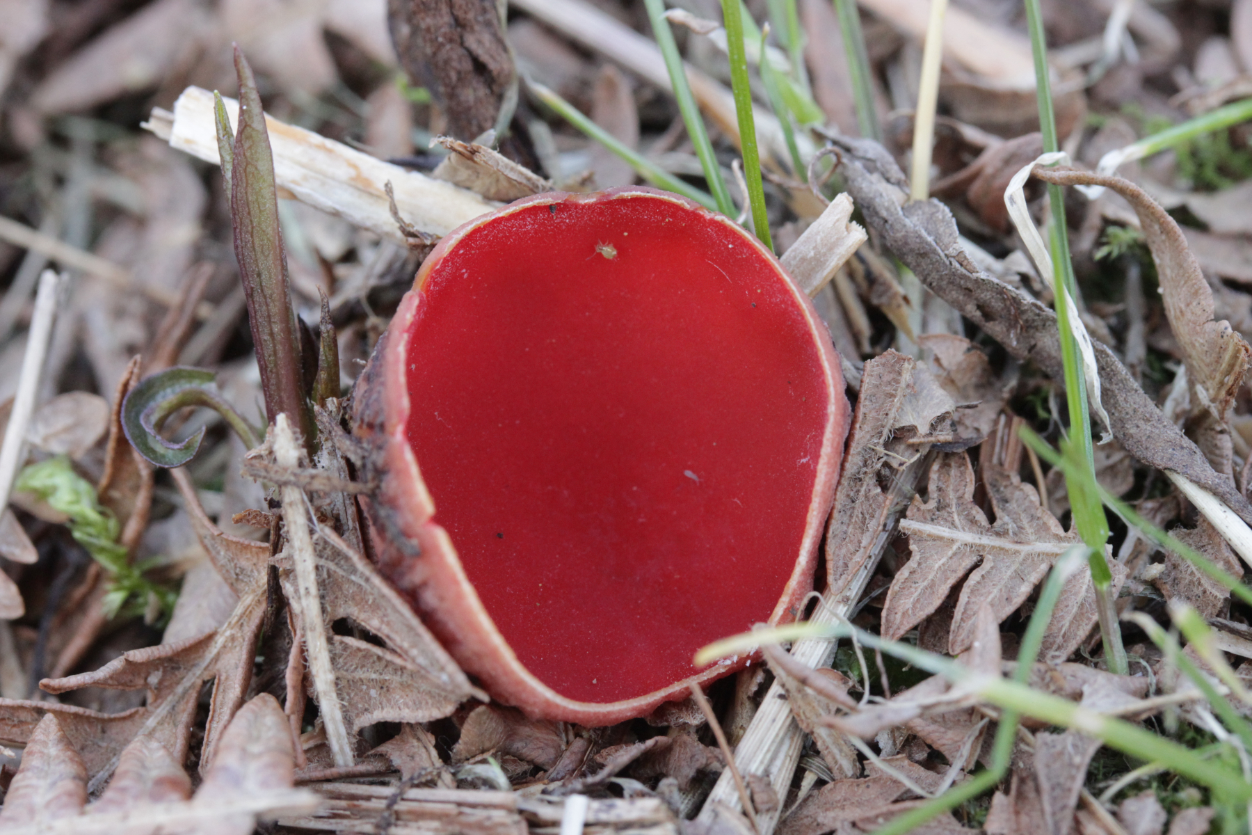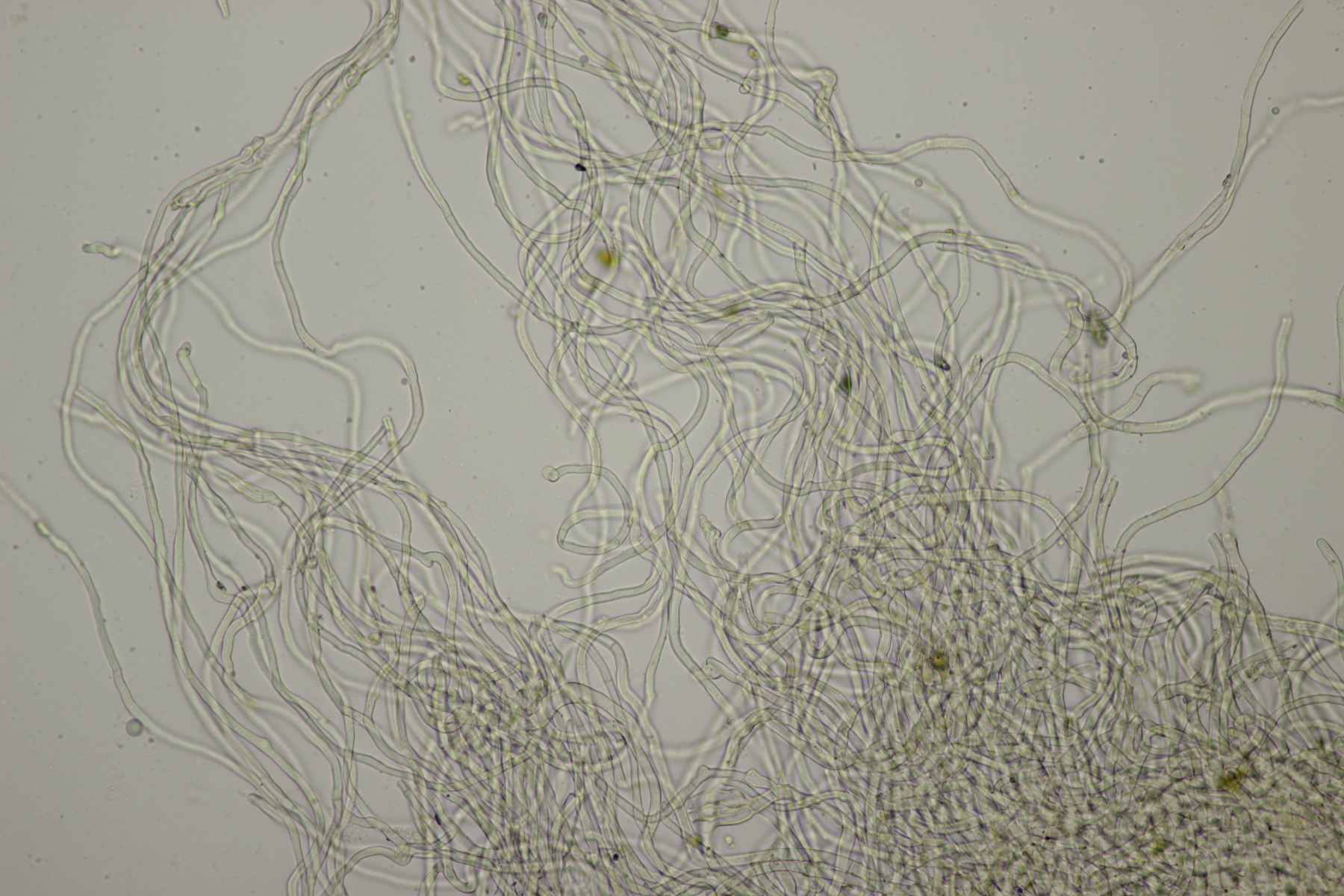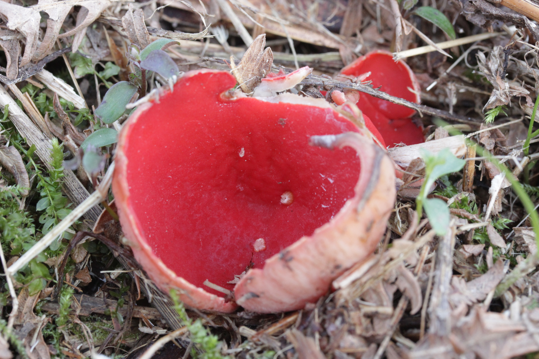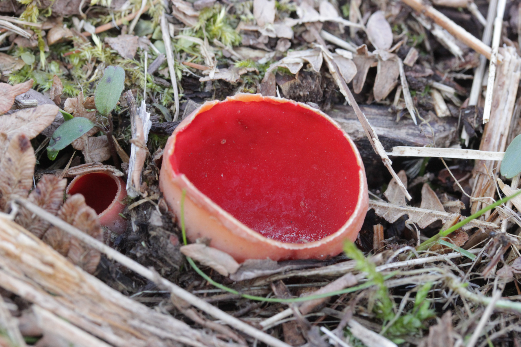 bevor wir hier den großen Kälteeinbruch im Januar hatten, hatte eine Pilzfreundin im Wuppertaler Süden eine riesige Ansammlung von Sarcoscyphas entdeckt. Das erforderte natürlich ein wenig Mikroskopierarbeit. Also habe ich mich am letzten Sonntag auf den Weg gemacht um nach den Fruchtkörpern Ausschau zu halten. Am Standort habe ich dann auch direkt die freigeschlagene Trasse unter einer Hochspannungsleitung entdeckt, wo sich die Pilze befinden sollten. Mein Blick ging also sofort in die Gehölze, die dort links und rechts des Weges standen und wo es zum Teil Totholz gab. Aber von den angeblich hunderten Fruchtkörpern war weit und breit nichts zu sehen. Nachdem ich also gute zwanzig Minuten immer weiter vom Weg entfernt gesucht hatte, erspähte ich oben auf dem Weg eine bekannte Gestalt. Es war Jörg, der den Standort dort kannte und ahnte, daß ich mich dort auf die Suche gemacht hätte. Als ich ihm klagte, daß ich noch keine Pilze gefunden habe, war er sehr erstaunt, da doch angeblich die ganze freigeschlagene Trasse damit voll wäre. Und in der Tat, wieder oben angelangt präsentierten sich die Sarcoscyphas in rauen Mengen. Aber wenn man nicht direkt auf der Freischlagfläche sucht, findet man die natürlich nicht. Insgesamt also ein eher ungewöhnlicher Standort für Sarcoscypha, die ich sonst eher auf Totholz im Wald kenne und nicht auf Holzhäckseln. Scheinbar schmeckt ihm die Weide aber auch in kleiner Form ![]()