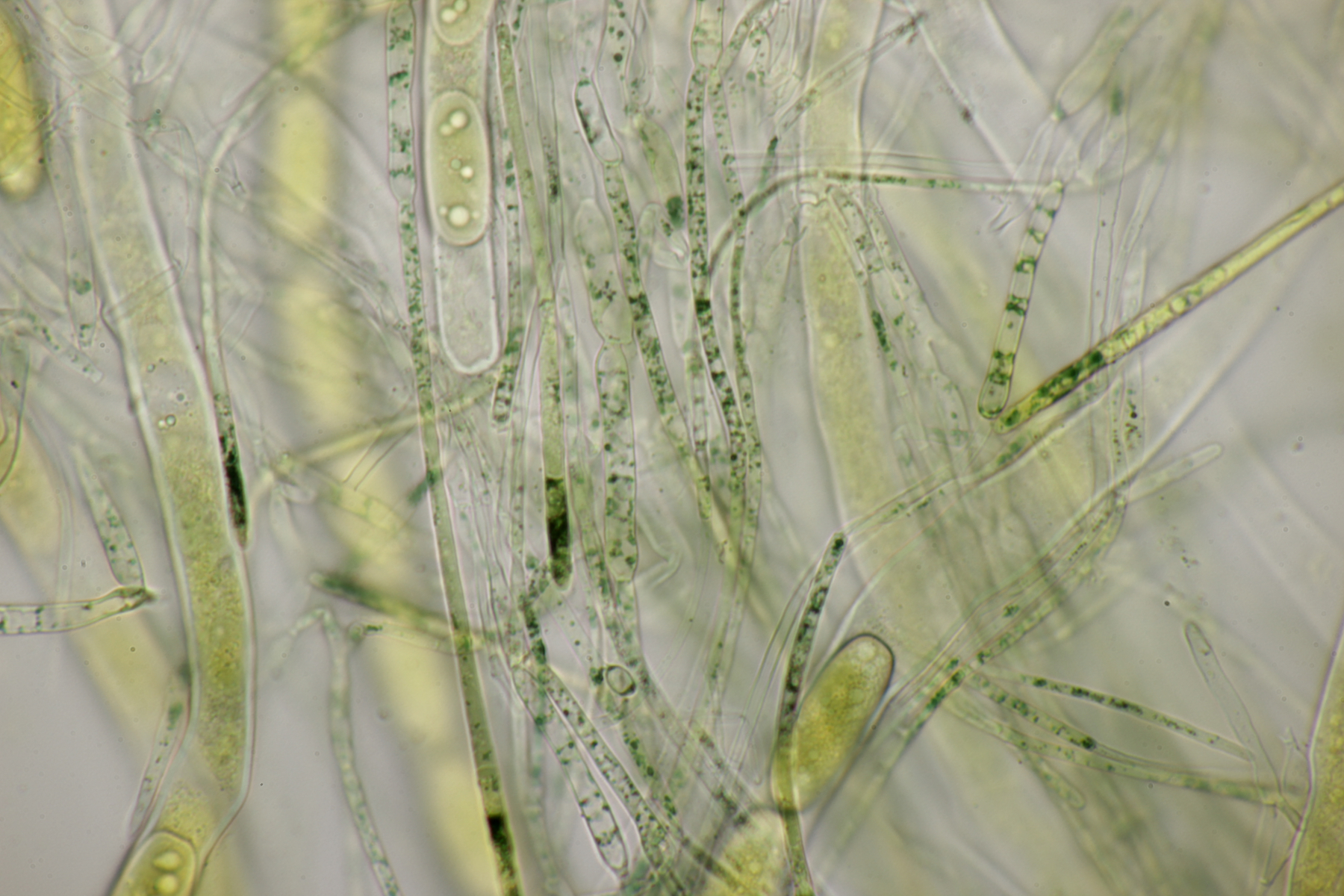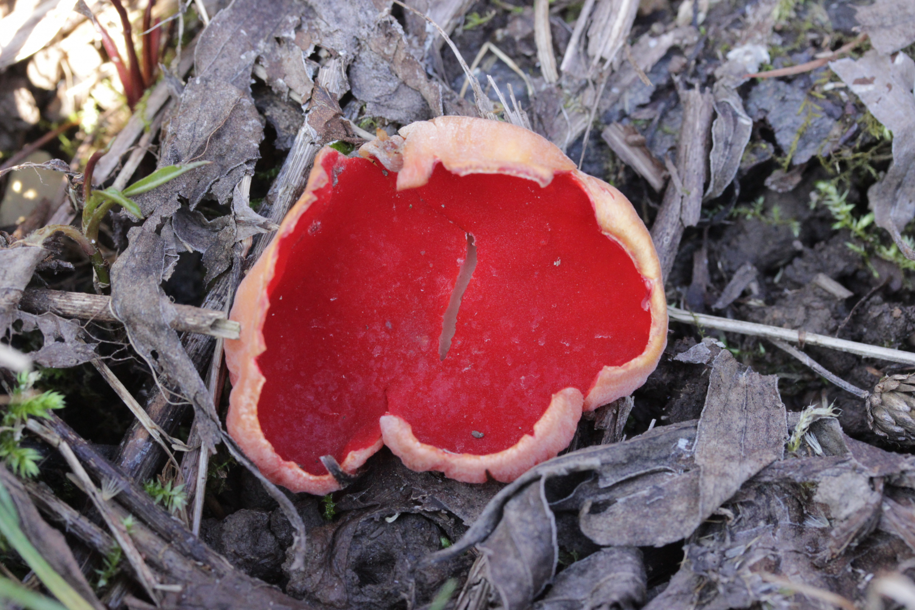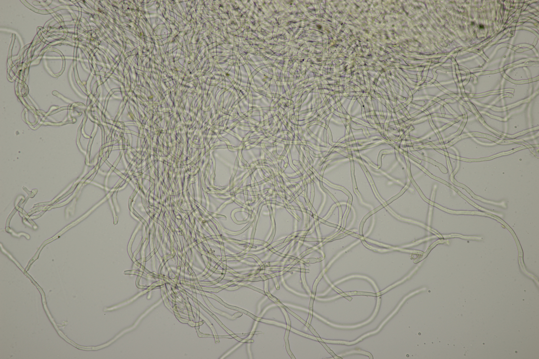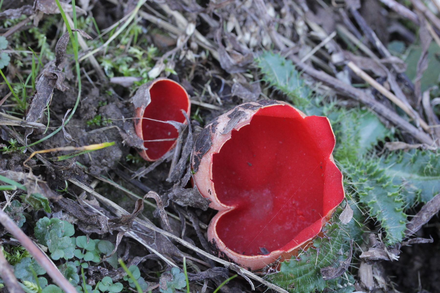 bevor wir hier den großen Kälteeinbruch im Januar hatten, hatte eine Pilzfreundin im Wuppertaler Süden eine riesige Ansammlung von Sarcoscyphas entdeckt. Das erforderte natürlich ein wenig Mikroskopierarbeit. Also habe ich mich am letzten Sonntag auf den Weg gemacht um nach den Fruchtkörpern Ausschau zu halten. Am Standort habe ich dann auch direkt die freigeschlagene Trasse unter einer Hochspannungsleitung entdeckt, wo sich die Pilze befinden sollten. Mein Blick ging also sofort in die Gehölze, die dort links und rechts des Weges standen und wo es zum Teil Totholz gab. Aber von den angeblich hunderten Fruchtkörpern war weit und breit nichts zu sehen. Nachdem ich also gute zwanzig Minuten immer weiter vom Weg entfernt gesucht hatte, erspähte ich oben auf dem Weg eine bekannte Gestalt. Es war Jörg, der den Standort dort kannte und ahnte, daß ich mich dort auf die Suche gemacht hätte. Als ich ihm klagte, daß ich noch keine Pilze gefunden habe, war er sehr erstaunt, da doch angeblich die ganze freigeschlagene Trasse damit voll wäre. Und in der Tat, wieder oben angelangt präsentierten sich die Sarcoscyphas in rauen Mengen. Aber wenn man nicht direkt auf der Freischlagfläche sucht, findet man die natürlich nicht. Insgesamt also ein eher ungewöhnlicher Standort für Sarcoscypha, die ich sonst eher auf Totholz im Wald kenne und nicht auf Holzhäckseln. Scheinbar schmeckt ihm die Weide aber auch in kleiner Form ![]()