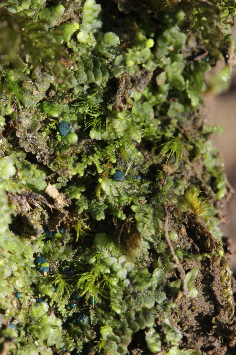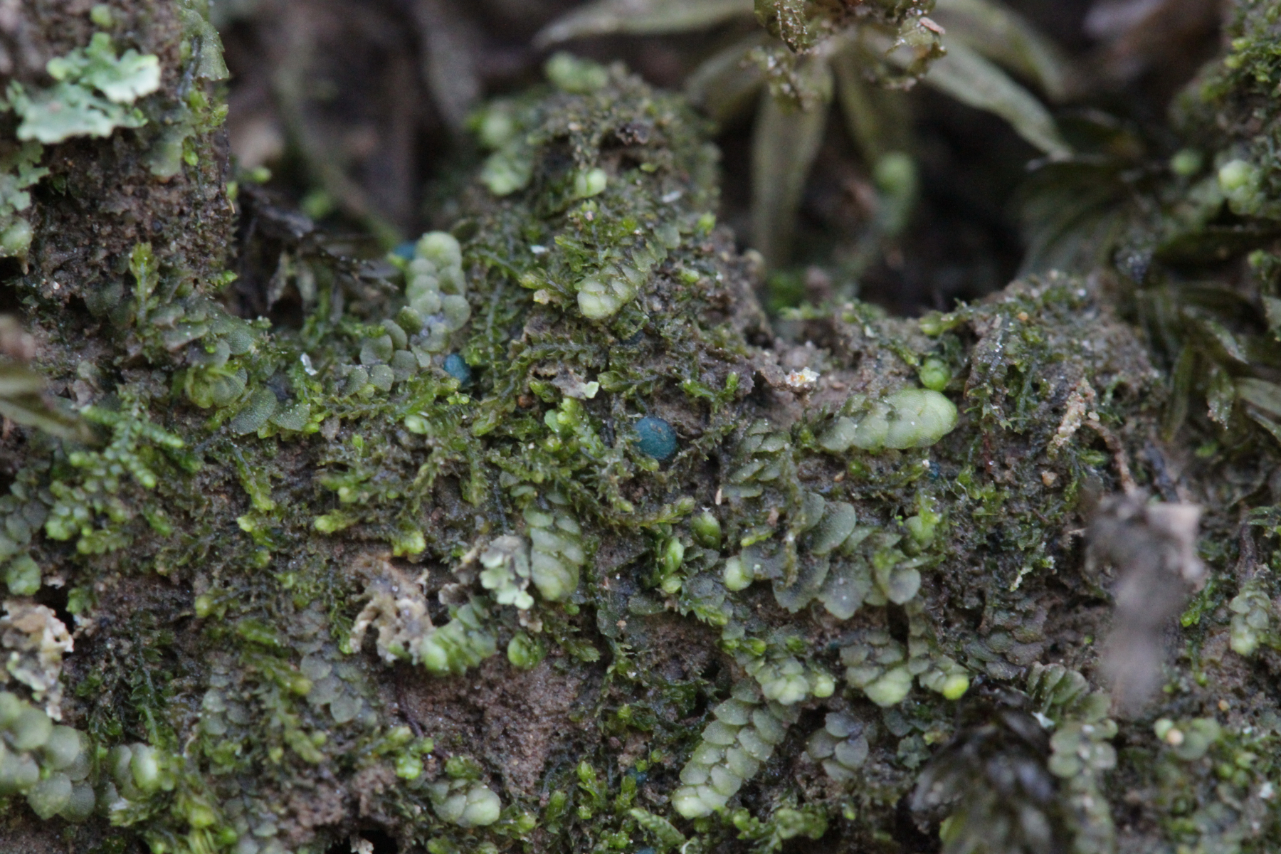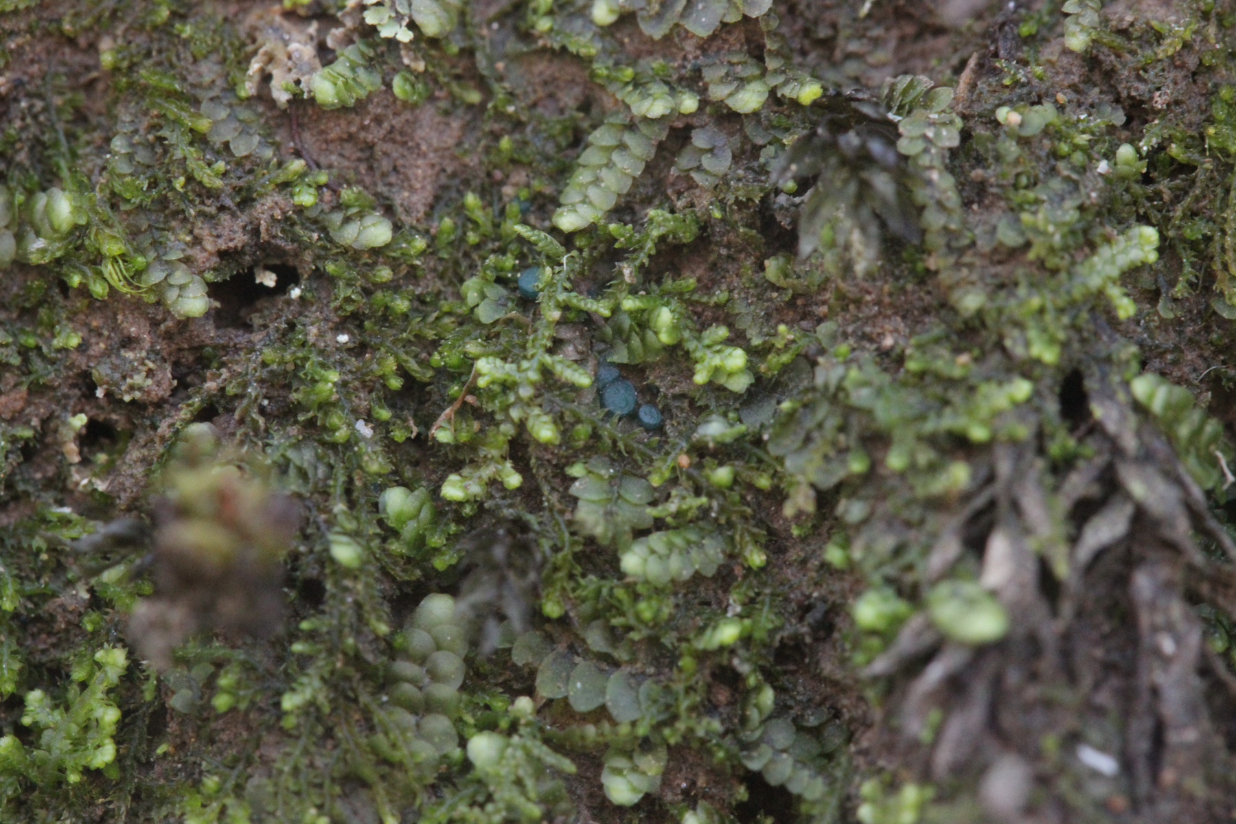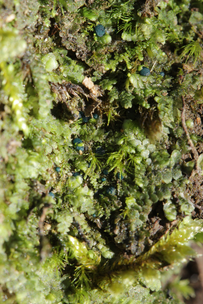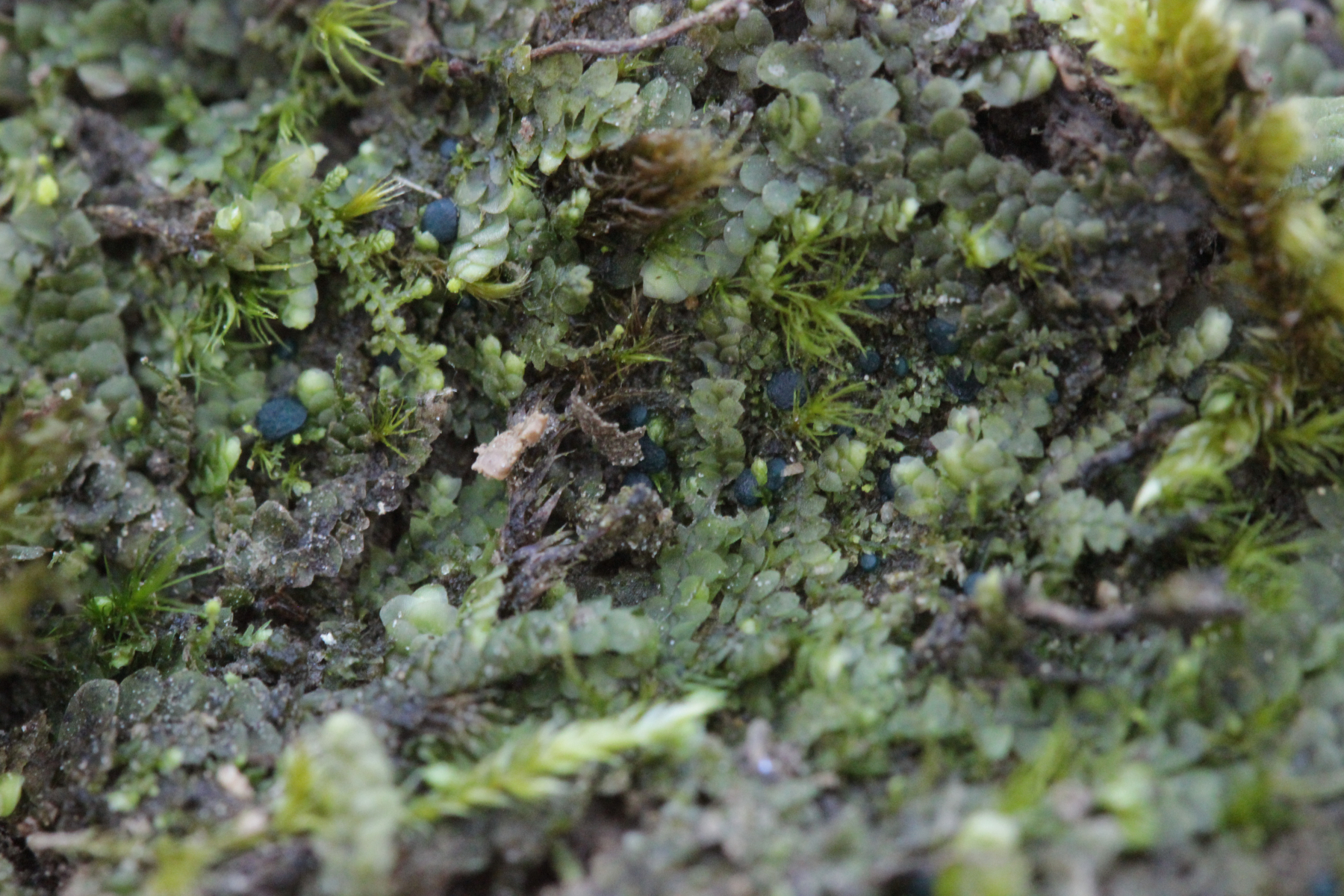 Im Anschluß sind wir dann das Gelpetal hinaufgewandert. Kurz vor Ende des Tales kamen wir an einen Baum, an dem Jörg meinte, dort würden Lebermoose wachsen und man könne ja mal nach Mniaecia jungermanniae schauen, auch wenn es noch recht früh im Jahr war. Nach kurzer Suche hatte Jörg dann auch das Lebermoos ausfindig gemacht. Ich holte also meine 10-fach Lupe heraus, inspizierte das erste Stück Moos und hatte direkt Fundglück. Offenbar sind diese kleinen Pilze für mich deutlich einfacher zu finden, als die großen roten Brocken von oben