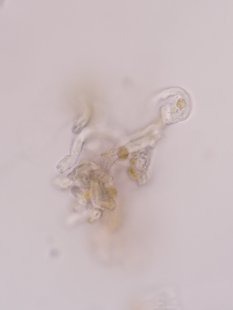 ii) Der Photobiont soll bei Peltigera Nostoc sein: davon fand ich reichlich Bilder im Netz. Kurzbeschrieben: Perlenkette. Problem: im Thallusschnitt gibt es zwar eine deutliche grüne Schicht mit den Photobionten, aber auch im Quetschpräparat habe ich keine Perlenketten finden können. Liegen die dort einfach "einzeln" vor oder ist der Photobiont in dem Fall doch was anderes (weil das gute Stück doch keine Peltigera ist??