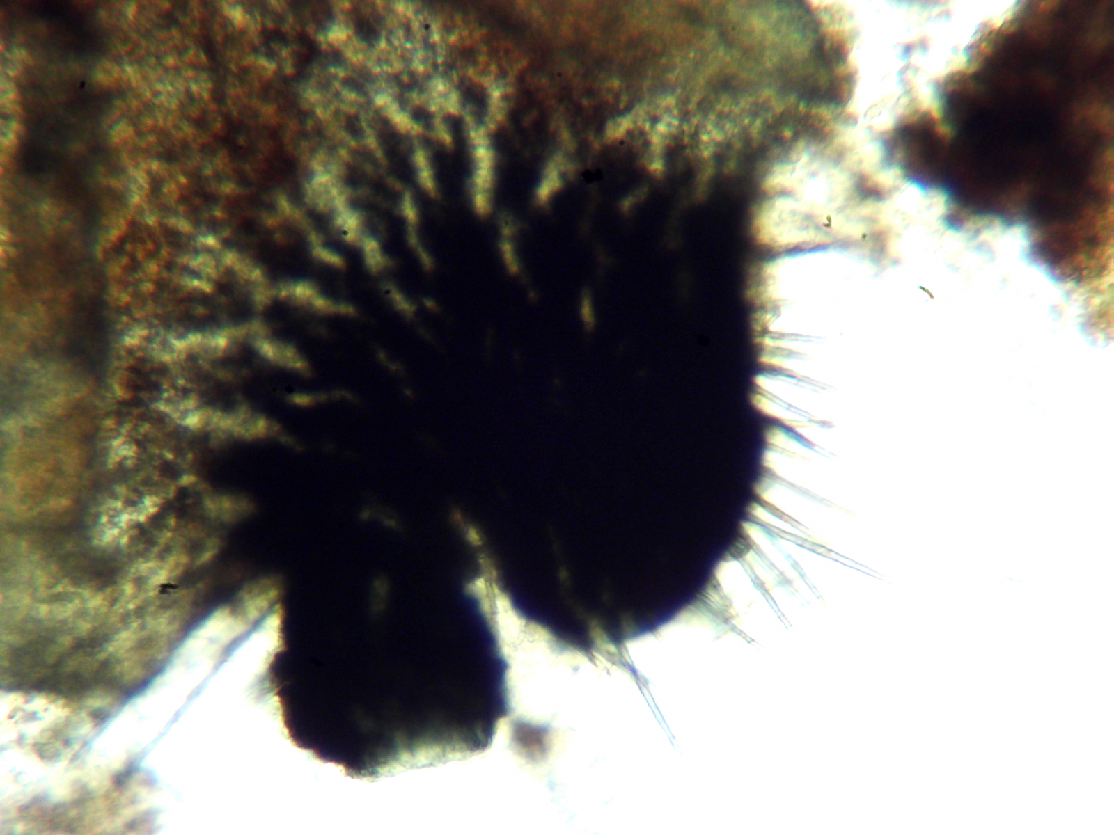 Unter dem Mikroskop fand ich leider keinen auszählbaren Ascus, es ist aber von deutlich (!) mehr als 64 Sporen auszugehen. Die Sporenköpfe messen 22-23 x 13-14 µm. Der Clou sind aber die Anhängsel: Das Pedicel ist 10-12 µm und ist am Ende etwas verbreitet. Dazu kommen noch lange gelatinöse Caudae, die granuliert sind. Diese finden sich an der Sporenspitze und z.T. auch am Pedicel.