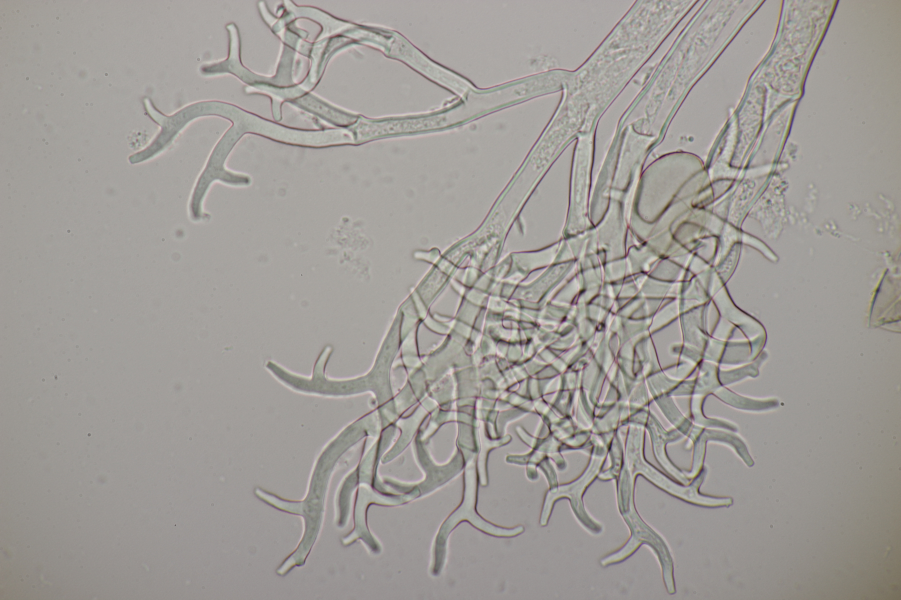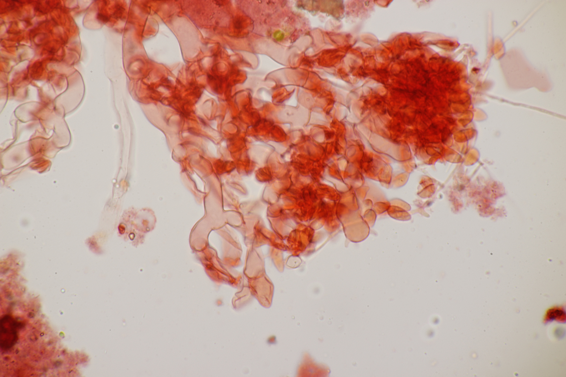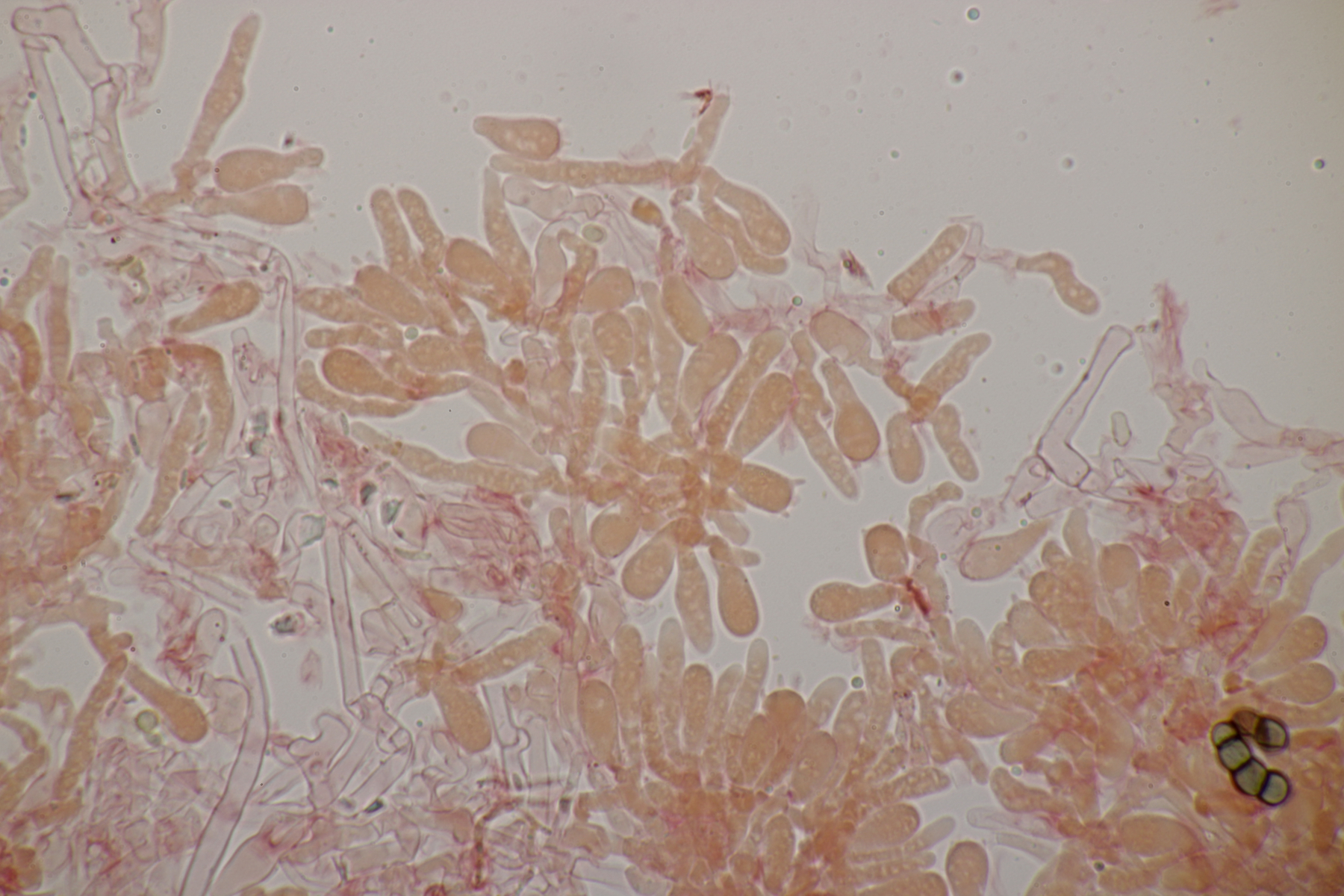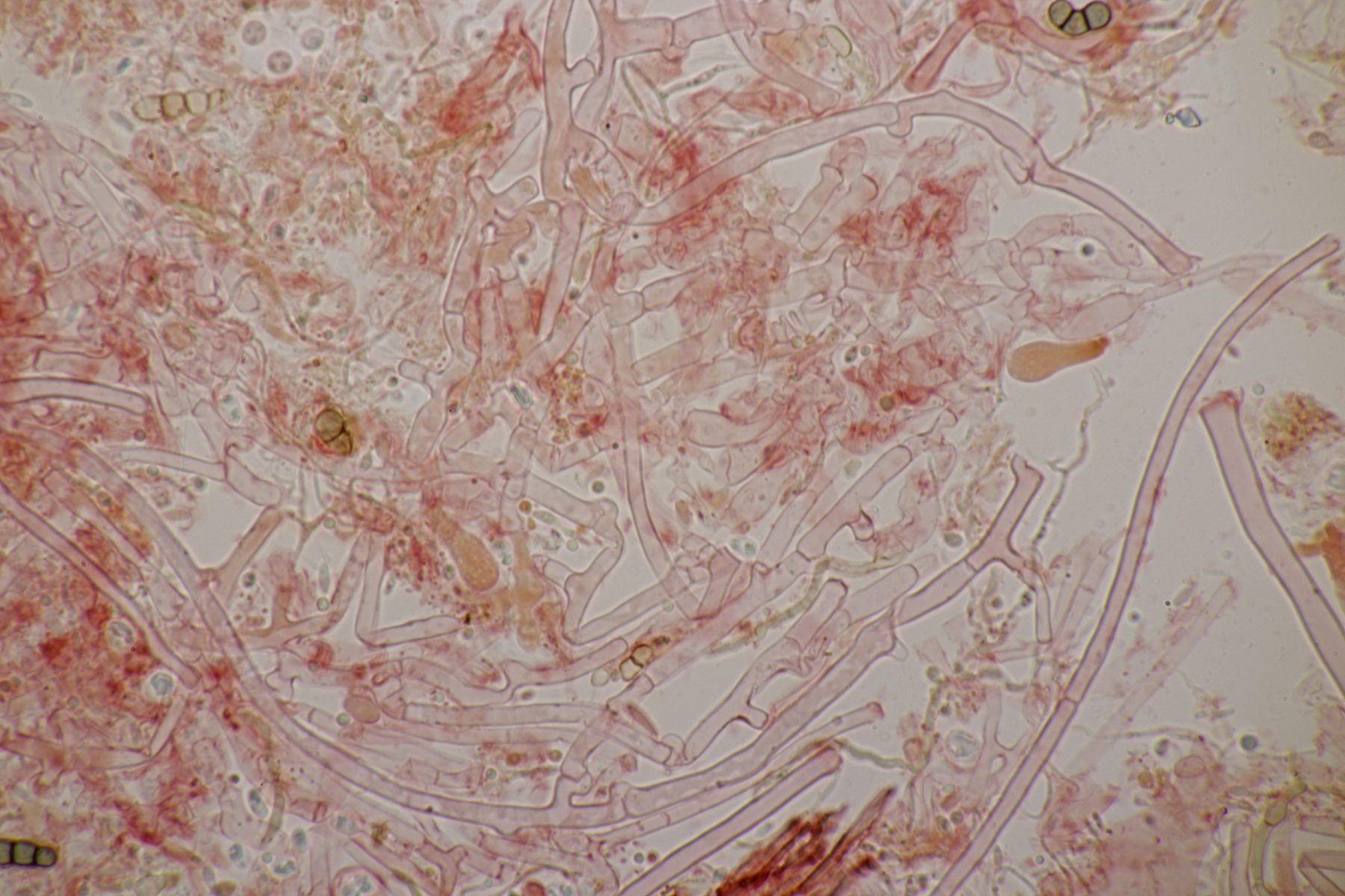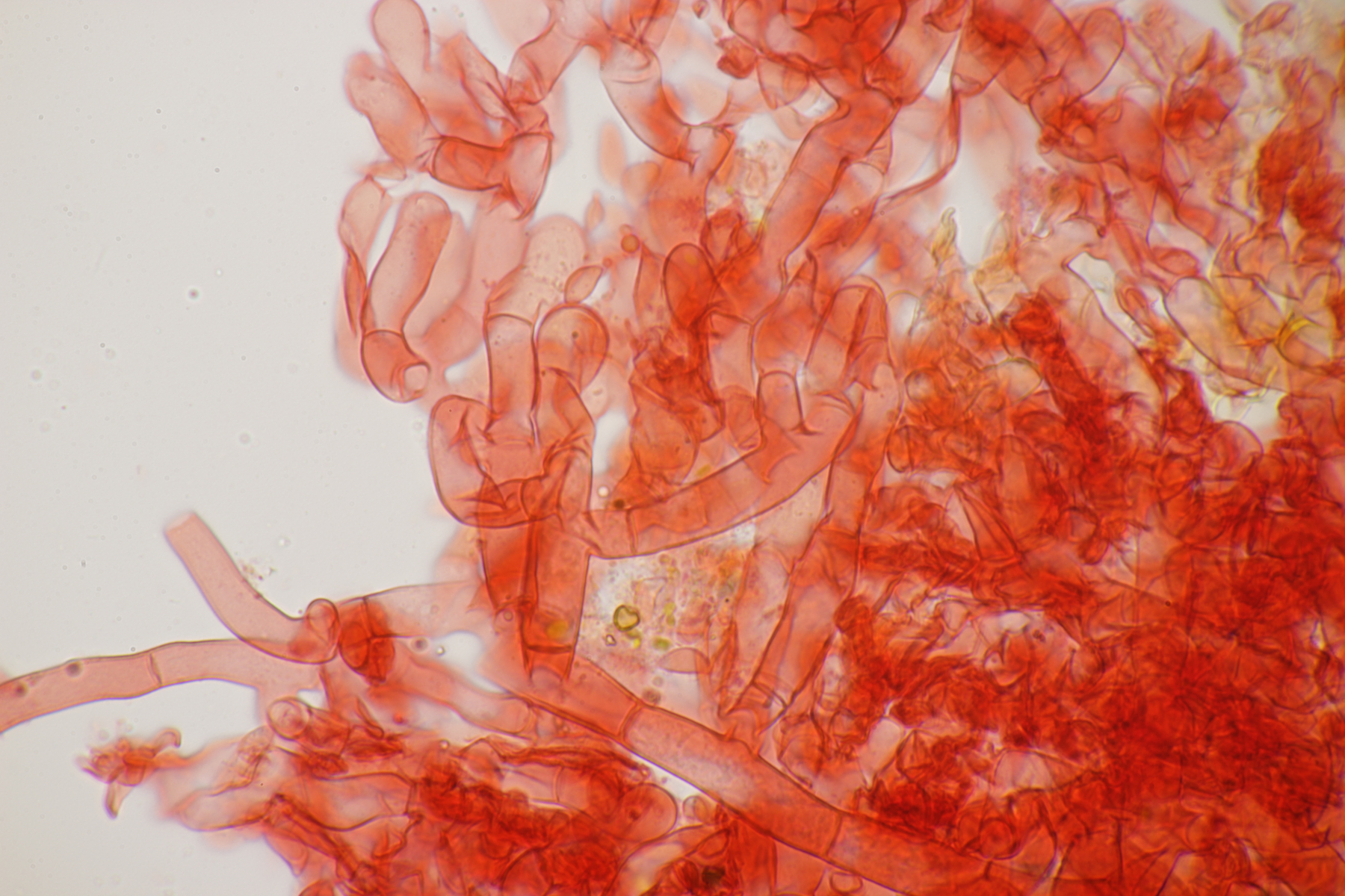 2. Ein Rindepilz auf Kiefer. Leider waren keine Sporen zu sehen. Schnallen waren vorhanden, Basidien viersporig mit Basalschnalle. Gewisse Strukturen würde ich als Zystiden interpretieren, die septiert wirkten (allerdings ohne Schnalle). Aber so ohne Sporen fehlt mir da jegliche Idee.
