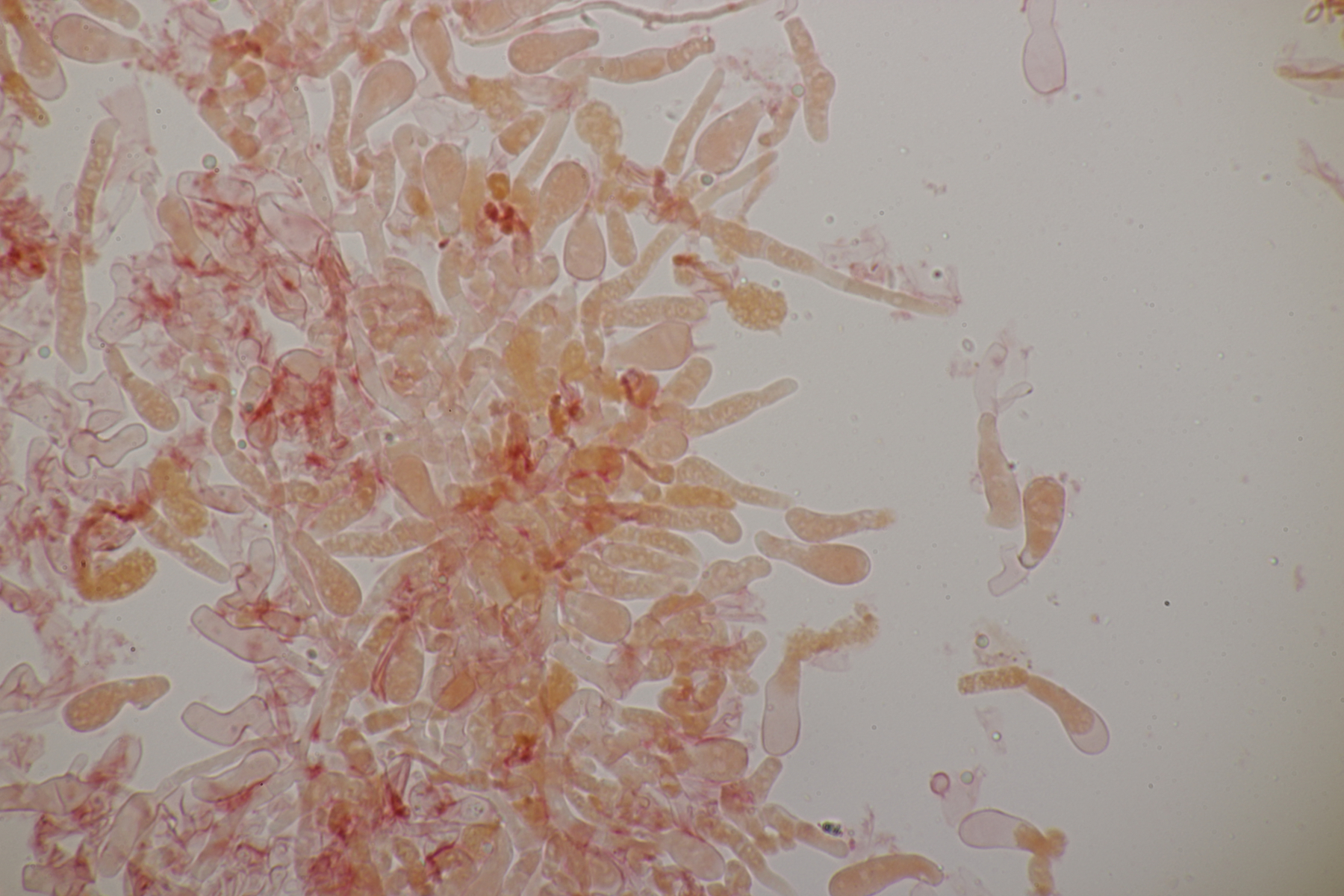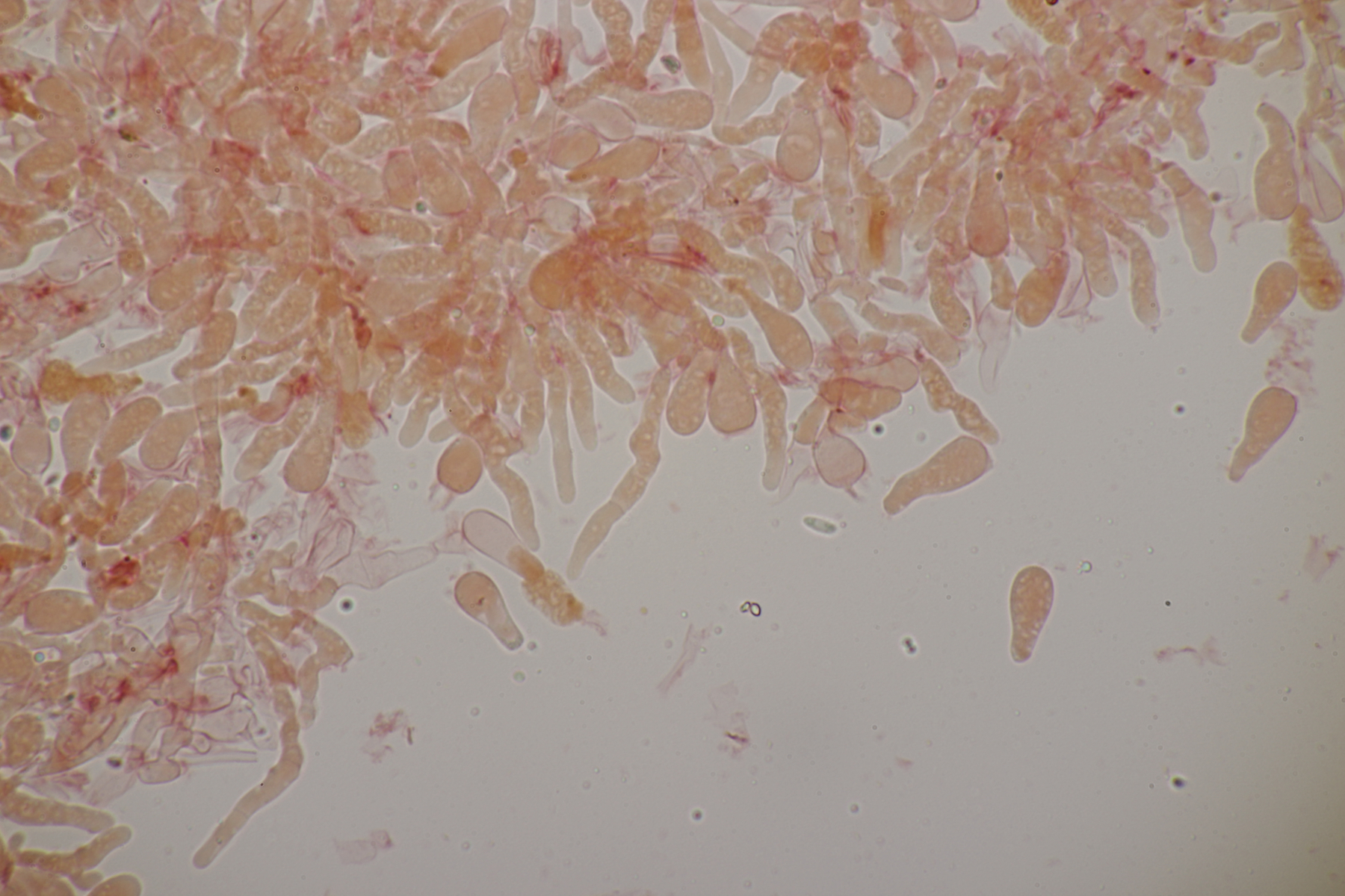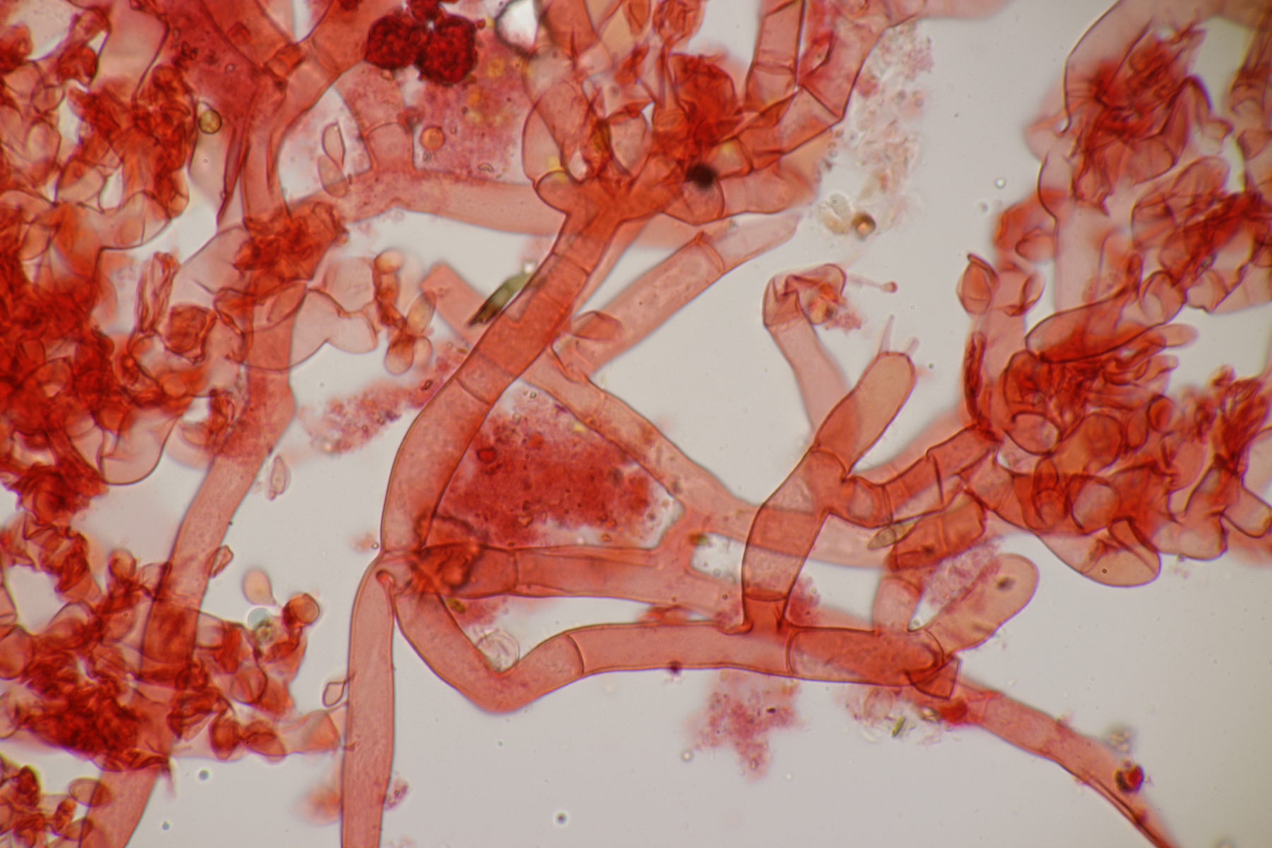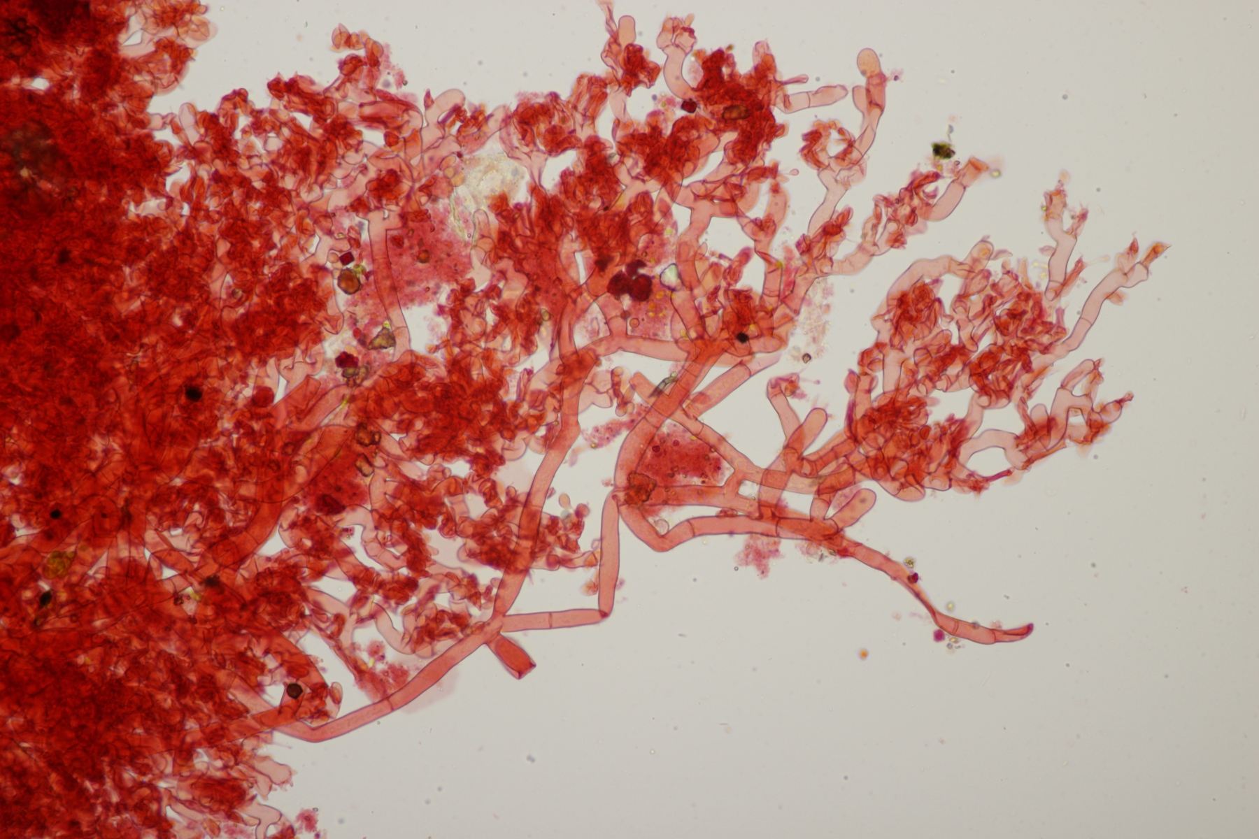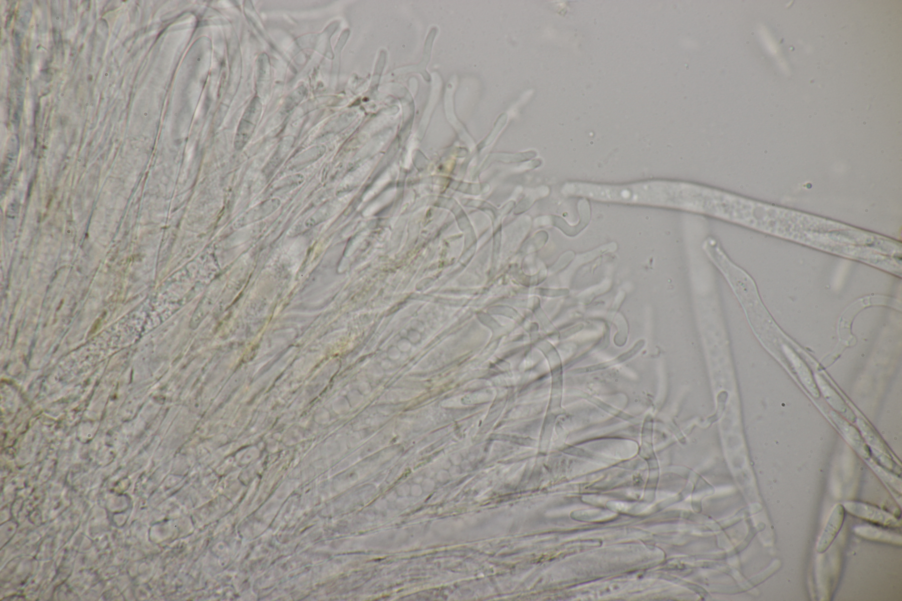 2. Ein Rindepilz auf Kiefer. Leider waren keine Sporen zu sehen. Schnallen waren vorhanden, Basidien viersporig mit Basalschnalle. Gewisse Strukturen würde ich als Zystiden interpretieren, die septiert wirkten (allerdings ohne Schnalle). Aber so ohne Sporen fehlt mir da jegliche Idee.