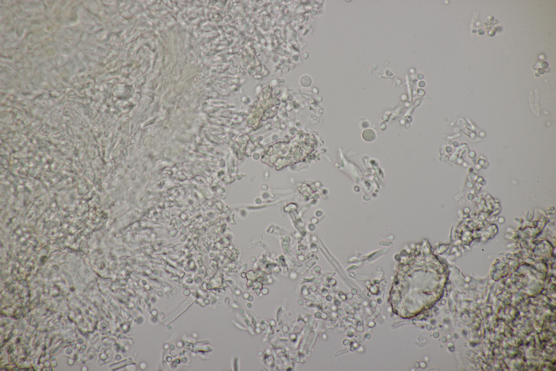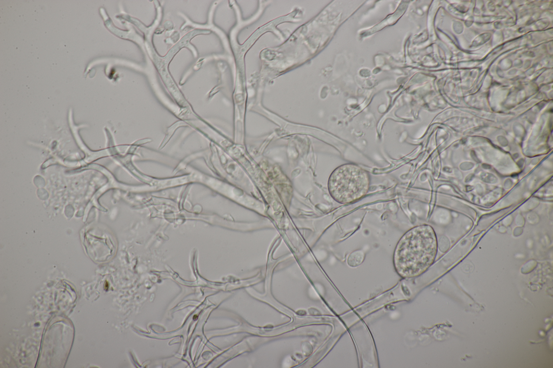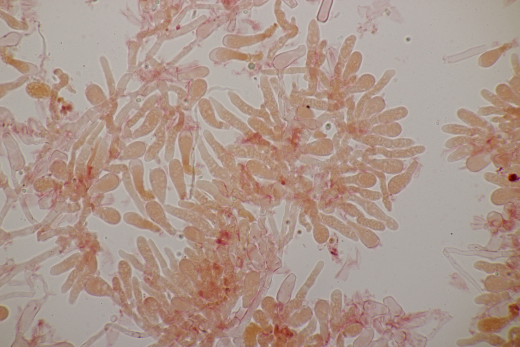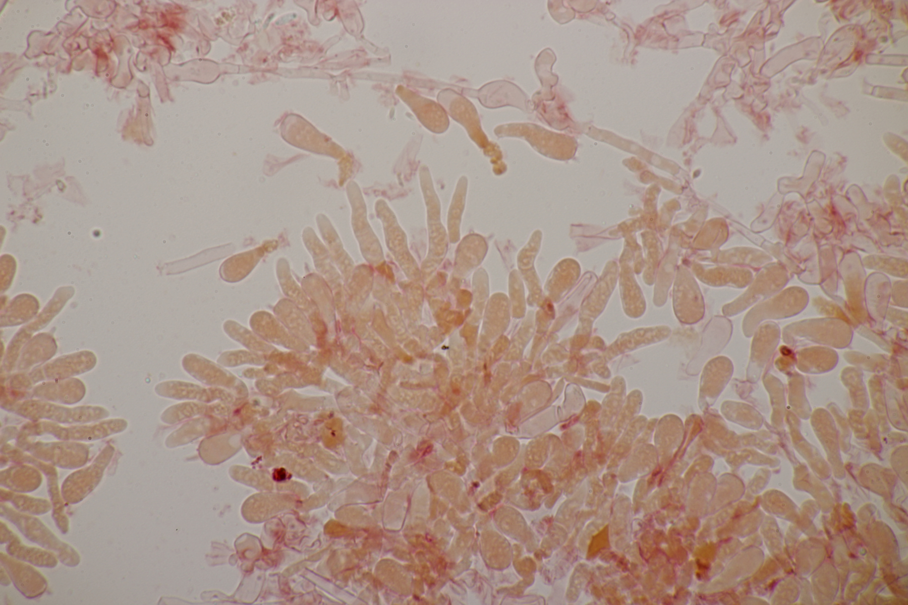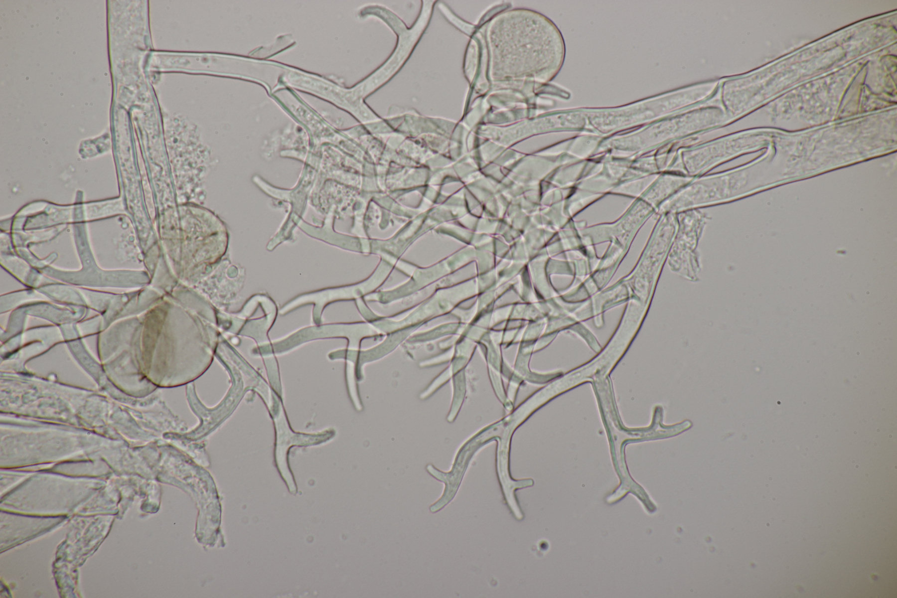 2. Ein Rindepilz auf Kiefer. Leider waren keine Sporen zu sehen. Schnallen waren vorhanden, Basidien viersporig mit Basalschnalle. Gewisse Strukturen würde ich als Zystiden interpretieren, die septiert wirkten (allerdings ohne Schnalle). Aber so ohne Sporen fehlt mir da jegliche Idee.