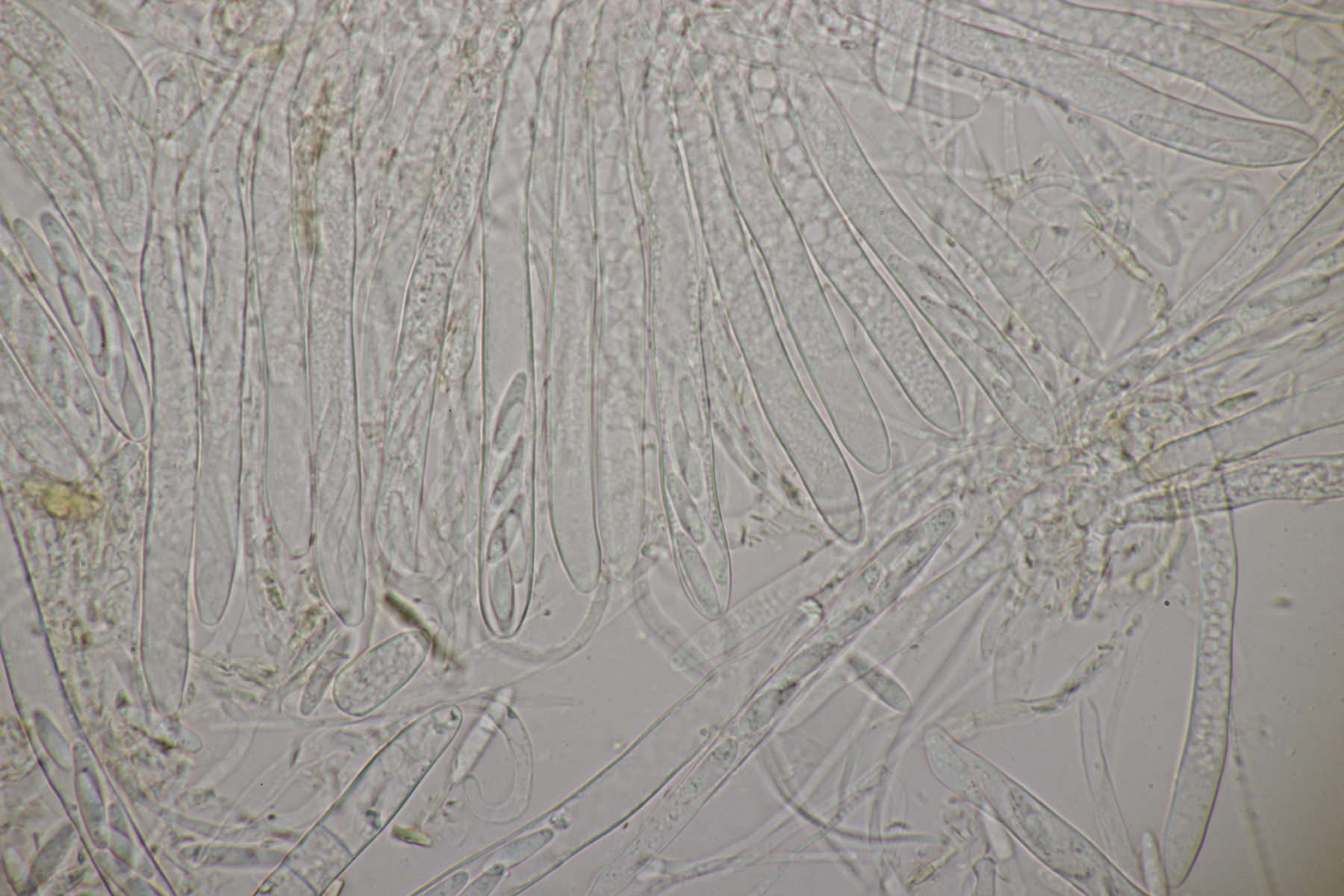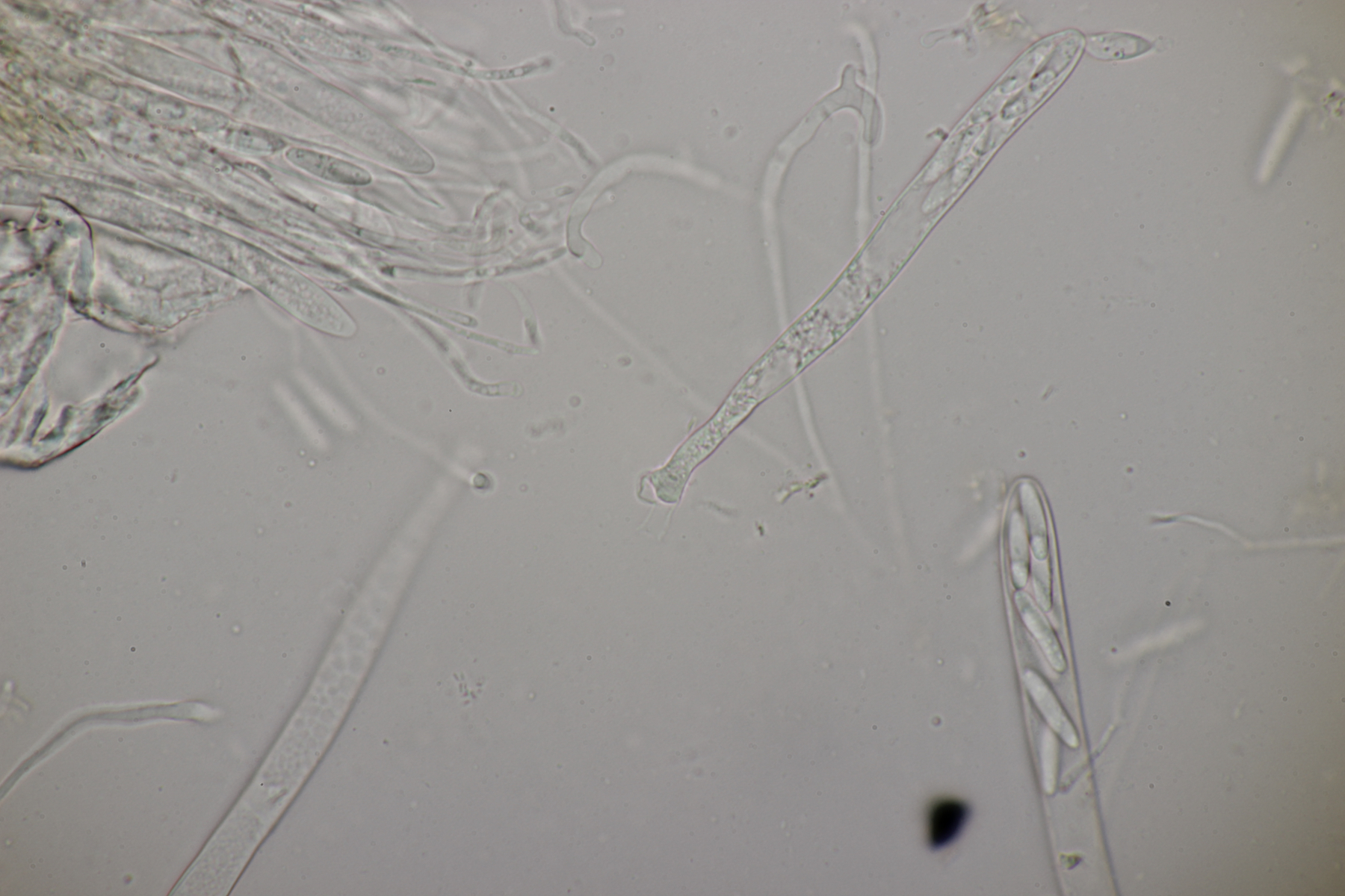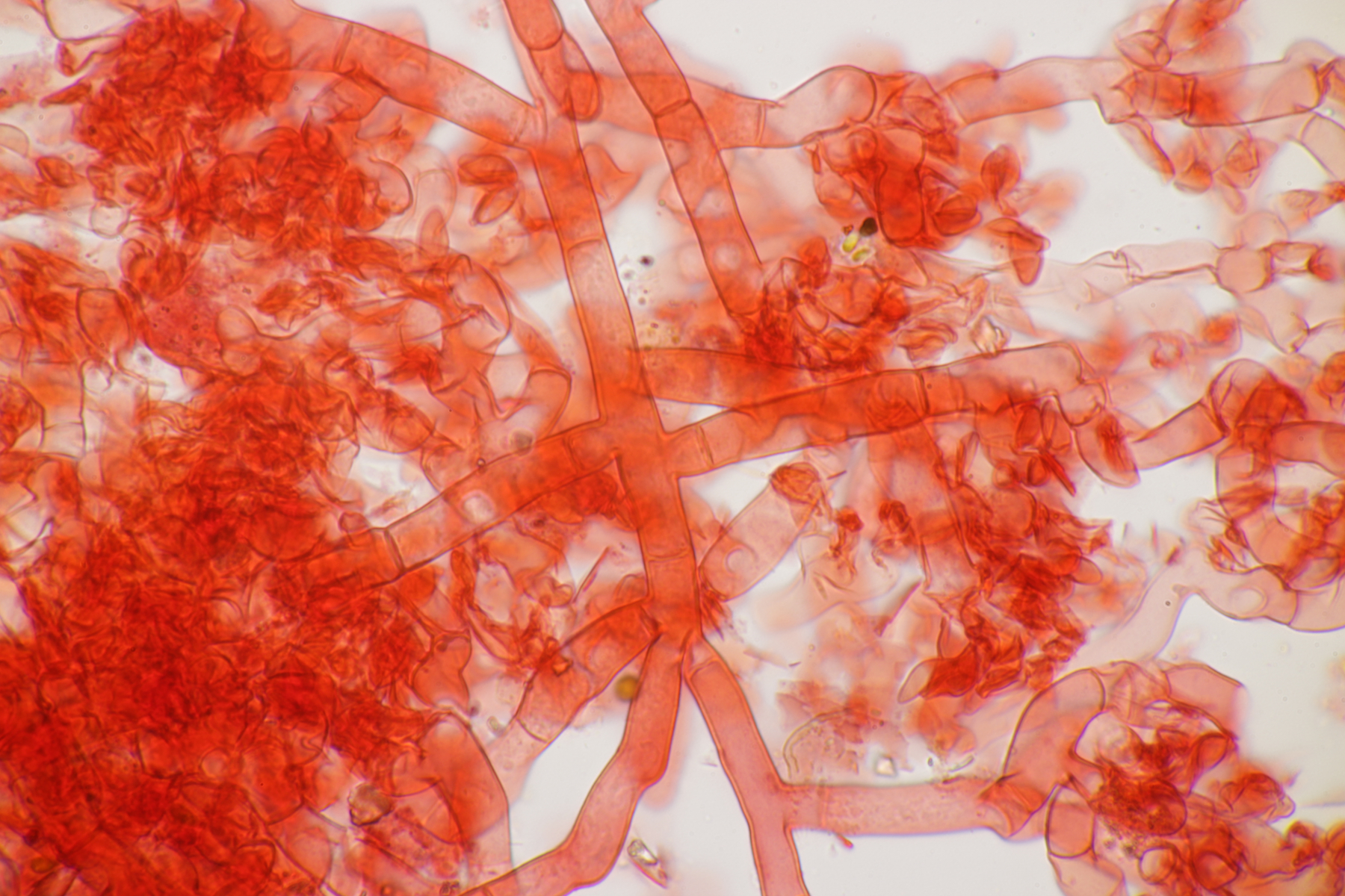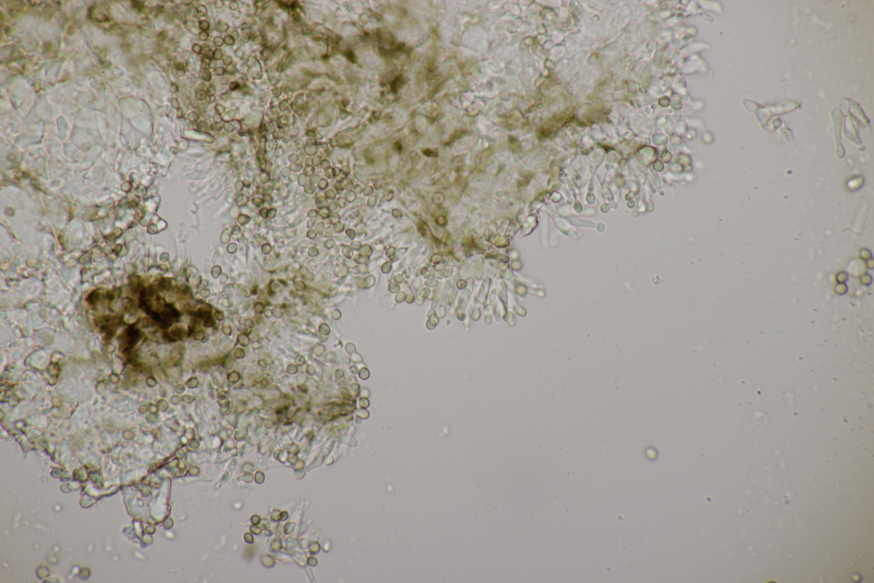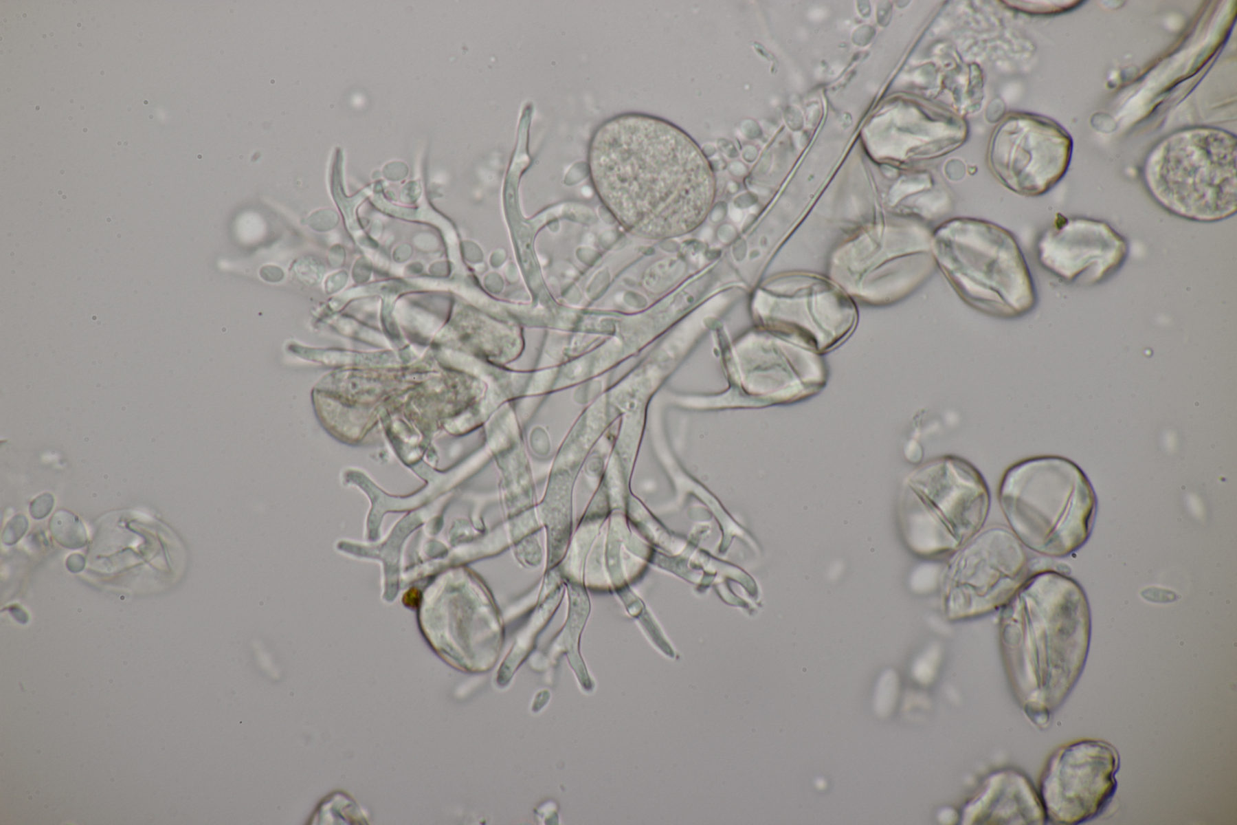 2. Ein Rindepilz auf Kiefer. Leider waren keine Sporen zu sehen. Schnallen waren vorhanden, Basidien viersporig mit Basalschnalle. Gewisse Strukturen würde ich als Zystiden interpretieren, die septiert wirkten (allerdings ohne Schnalle). Aber so ohne Sporen fehlt mir da jegliche Idee.