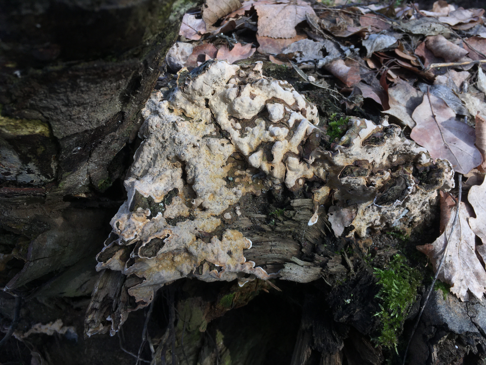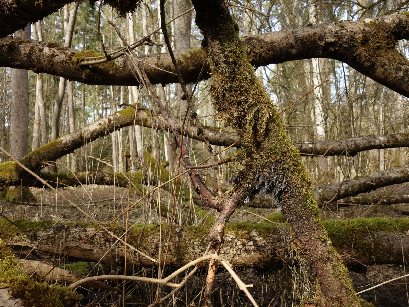 • Hier die Auflösung des Kriminalfalles: die auf dem Boden stehende Baumkrone, die dem Getöteten angeblich auf den Kopf geflogen ist zeigt bei näherer Betrachtung einen pilzlichen Bewuchs. Soweit so gut. Wenn man sich den wiederum genauer anschaut stellt man fest, dass die Fruchtkörper geotrop angeordnet sind (mit ein paar Grad Abweichung). Nun gibt es zwei Möglichkeiten: 1) die FK waren bereits am stehenden Baum vorhanden und sind zufällig genau auf dem Kopf gelandet als er abbrach. 2) Sie sind erst nach dem Abbrechen der Krone erschienen. Weiter kommt man hier mit Spekulationen über die Art. Zugegeben der Größenvergleich ist schwierig aber ich denke man erkennt sie sind relativ groß und recht dunkel. Es kommen dort in Gewässernähe hauptsächlich zwei Arten an Weide in in Frage:Trametes suaveolens und Daedaleopsis confragosa. Für die erstere sind die FK zu groß und zu dunkel. (ok. ja, sind könnten auch einfach alt sein..;) Nun muss man sich den Wuchs von Daedaleopsis vergegenwärtigen. Er ist nämlich entgegen der Wuchsform vieler "Porlinge" umgekehrt glockenförmig. Heisst die flache Seite ist oben und die schräge Seite unten. Leider habe ich davon kein Bild auf dem Rechner und traue mich wegen Copyright keins aus dem Web zu posten. Vielleicht hat ja jemand von euch zufällig eins zu Verdeutlichung. Wenn man sich nun den Stamm genau ansieht sind die FK mit der flachen Seite nach oben angeorndet. Der Wuchs von so ausgeprägten FKs wird sicherlich wenige Monate in Anspruch nehmen. 2 Wochen sind dafür selbst bei besten Bedingungen zu wenig. Somit ist an Jack R.'s Geschichte etwas faul...