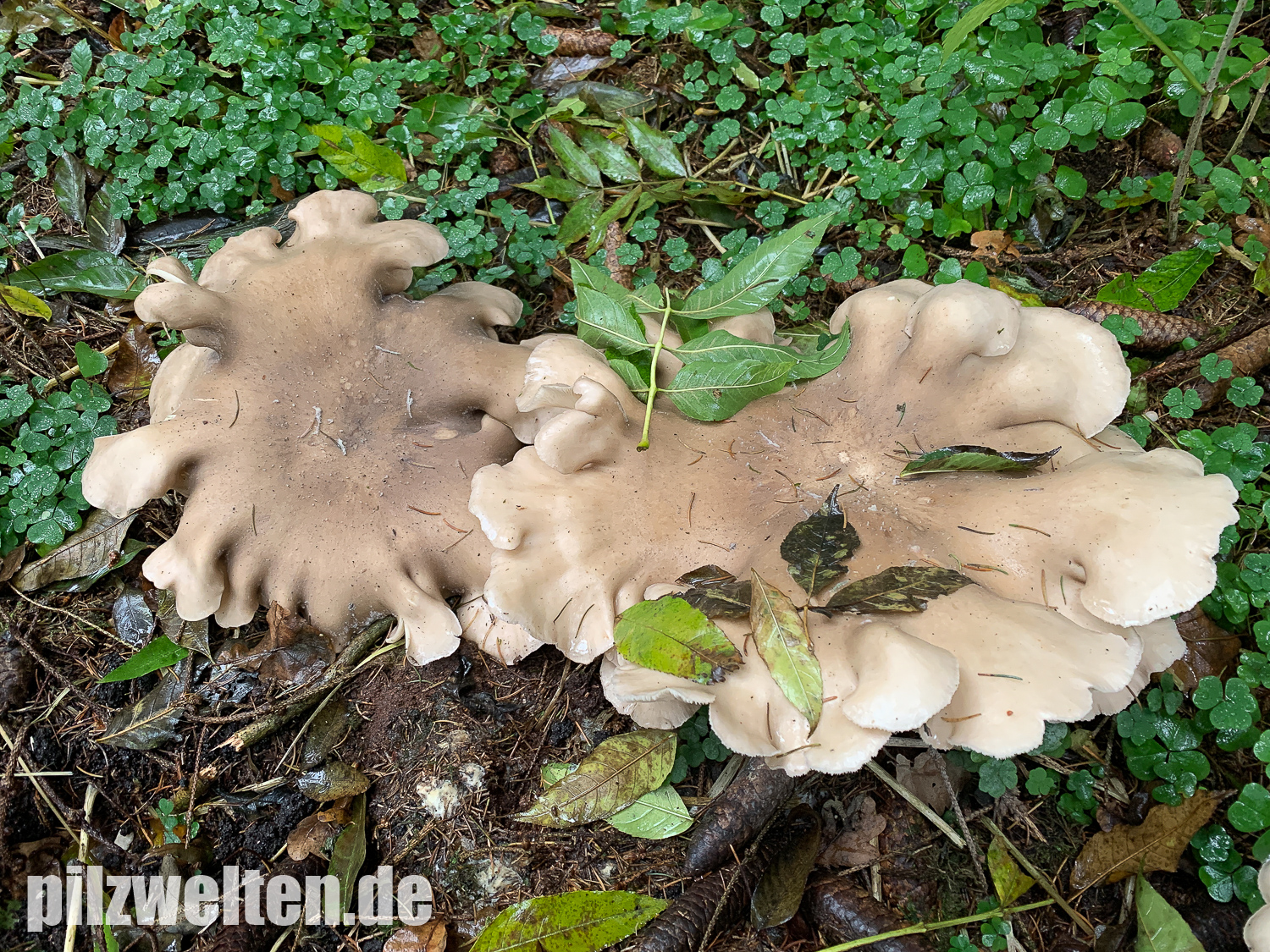 Der Dung scheint übrigens nicht nur den typischen Dung- / Mistarten (z. B. Dungtintling, Mistborstling, Blasiger Becherling, etc.) zu gefallen. Das übergroße Nährstoff-Angebot gefällt wohl auch den Nebelkappen enorm. Wir haben dort um den Misthaufen herum die letzten beiden Jahre mehrmals Nebelkappen mit einem Hutdurchmesser von über 30-40cm finden können - wirken auf den Bildern zwar schon groß, in der Realität waren die aber nochmal deutlich wuchtiger: