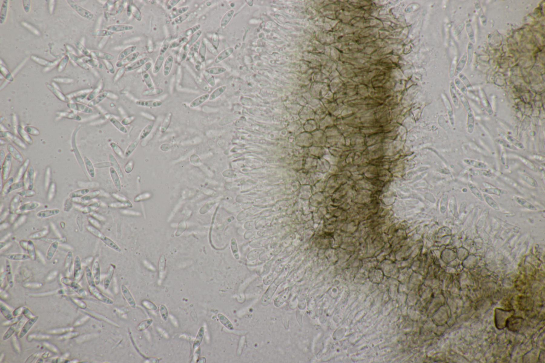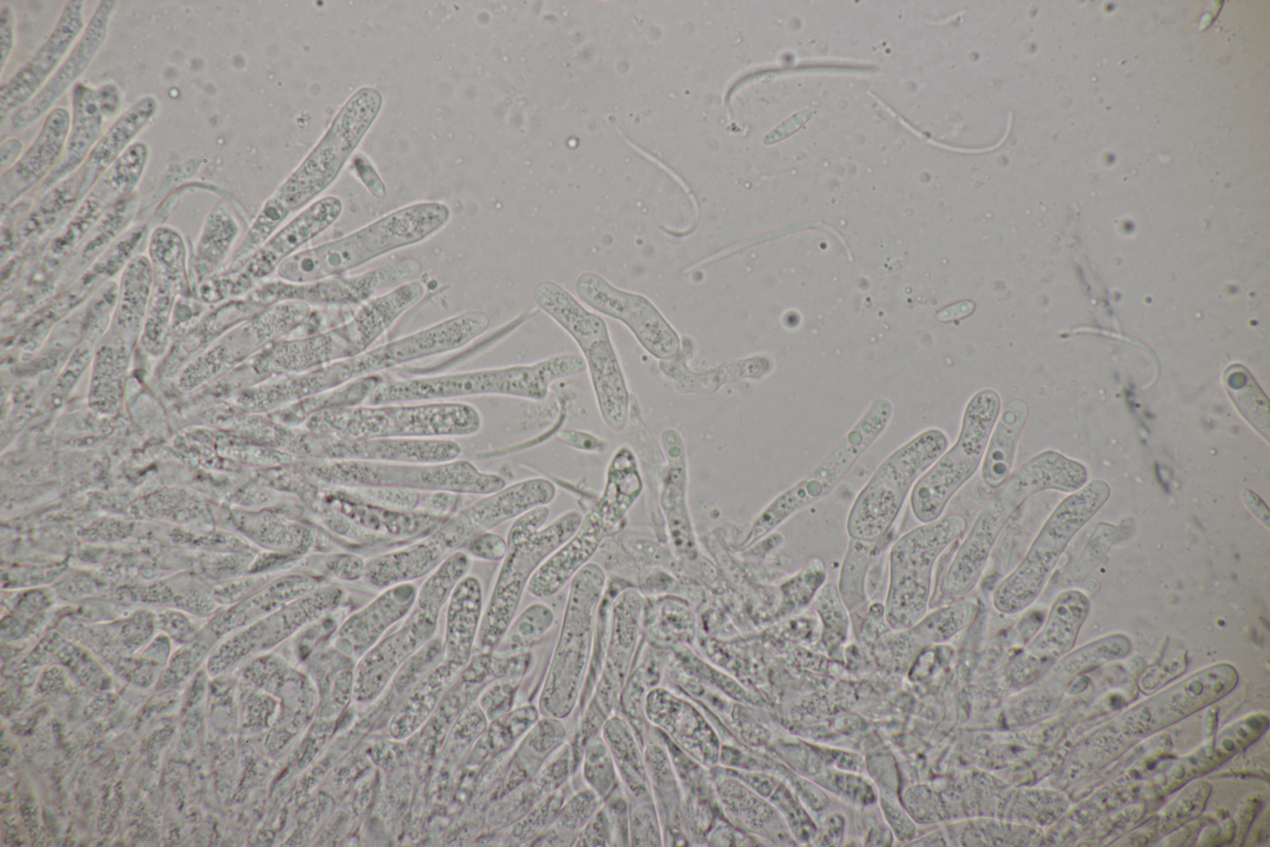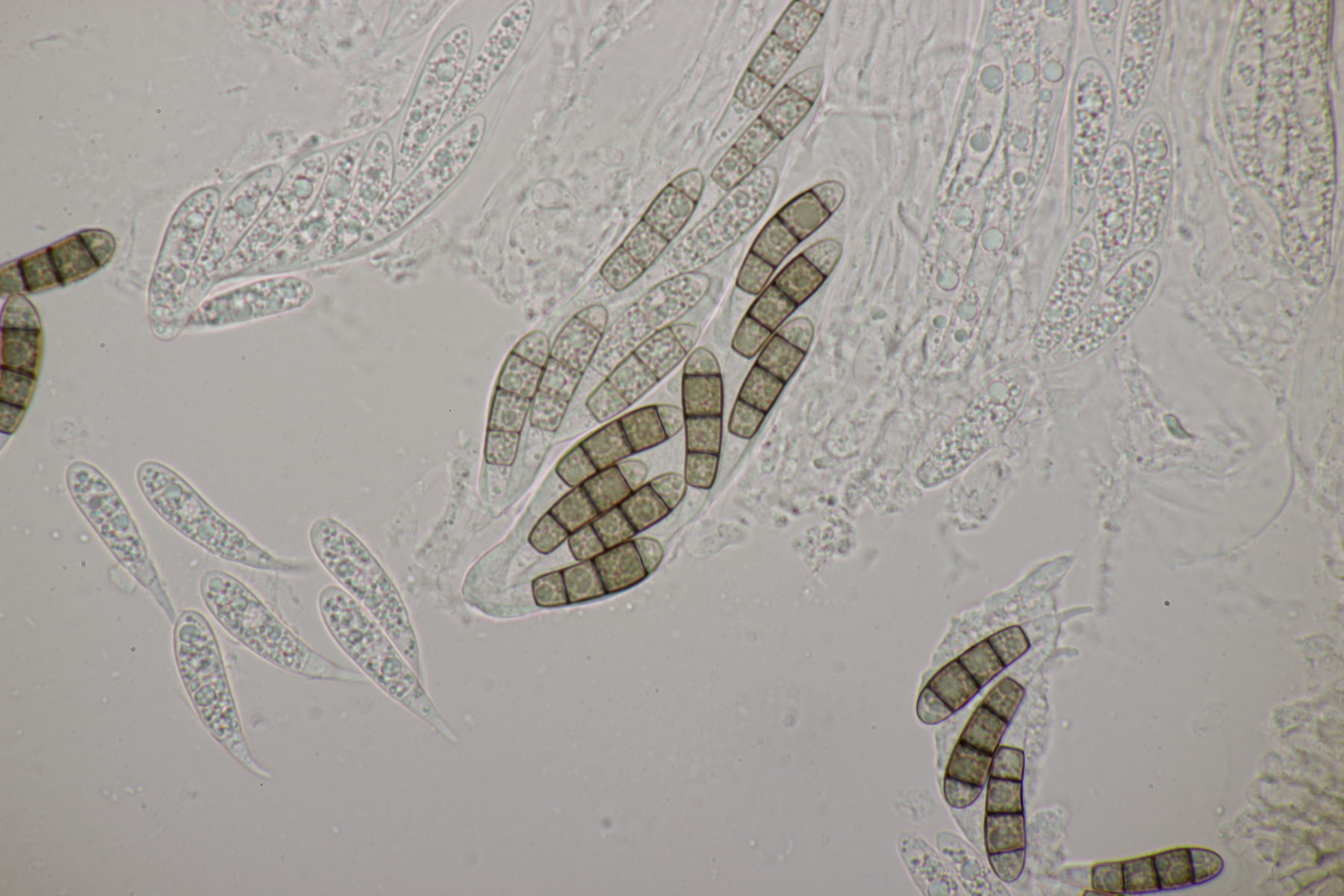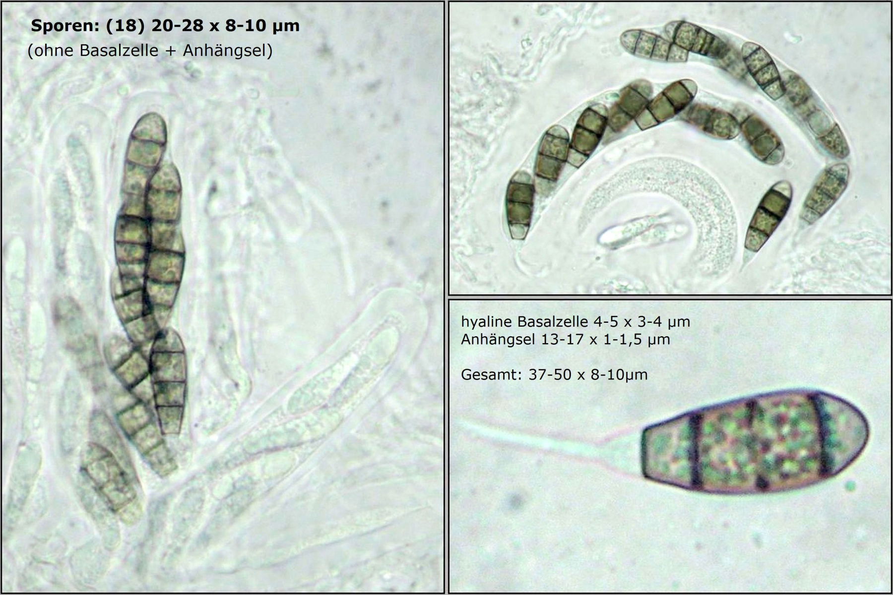 ich habe mal ein paar Sporen gemessen und komme auf (22-25) µm x (6-7) µm, was sich erstmal nicht groß von deinem Fund unterscheidet. Björn Wergen gibt in seinem Buch aber für R. unicaudata 21,5-28 x 6-7 an. Da scheint keine Unterscheidung möglich zu sein. Zu R. massalongii konnte ich jetzt leider im Internet wenig bis gar nichts finden. Kann es sein, daß man die Arten evtl. über das Substrat trennt? R. unicaudata ist bei Björn und Ellis & Ellis explizit für Clematis angegeben.