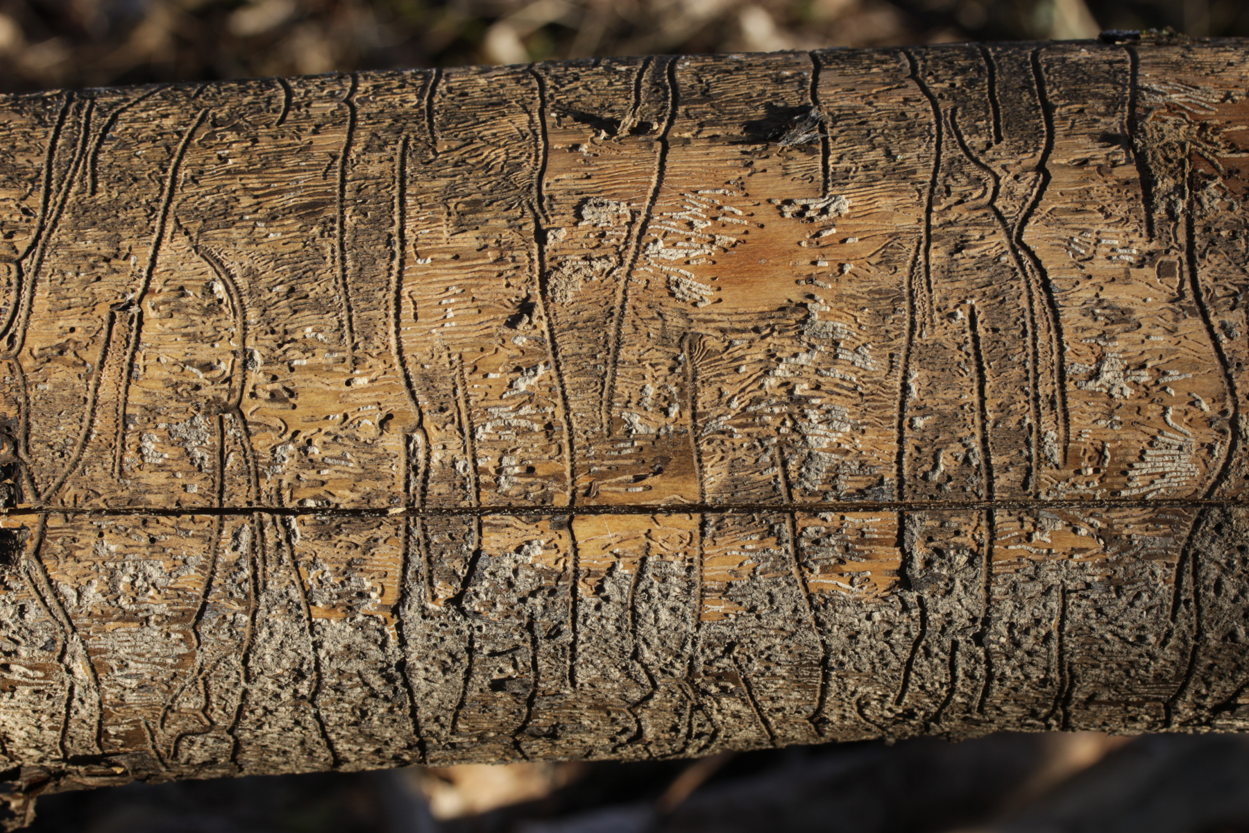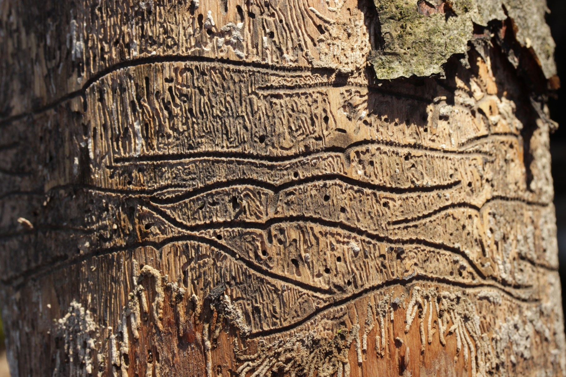 1. Den Anfang macht aber ein Käfer: Hylesinus fraxini. Dieser Borkenkäfer befällt Eschen und hinterläßt dabei ganz charakteristische Fraßspuren, die an stilisierte Zeichnungen von Möwen erinnern.