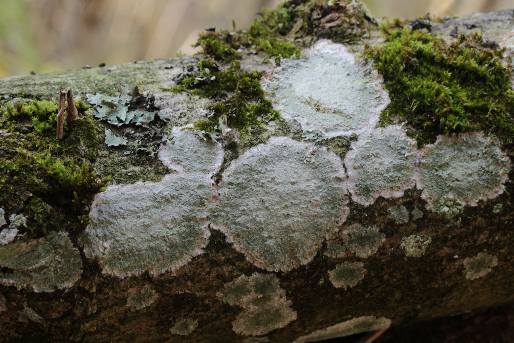 3. Diese Flechte, ebenfalls auf Esche, reagiert mit K zunächst gelb und dann rot und mit P gelb: Phlyctis argena
