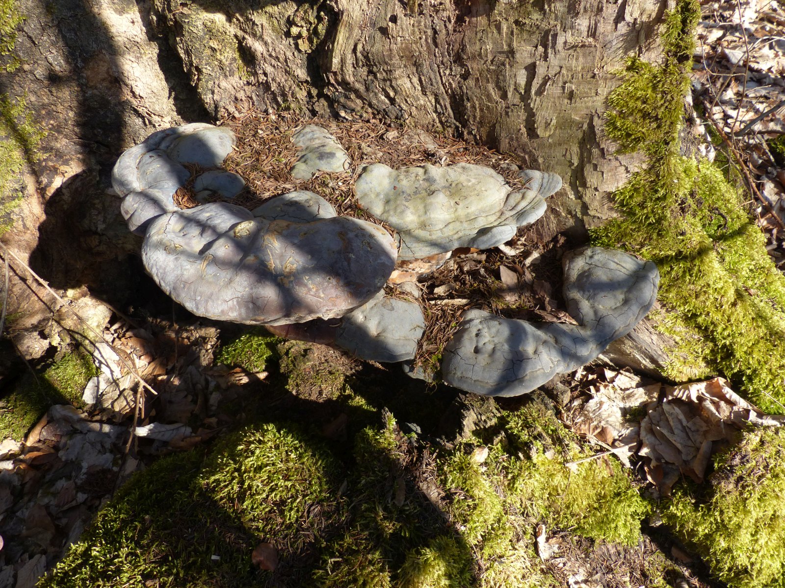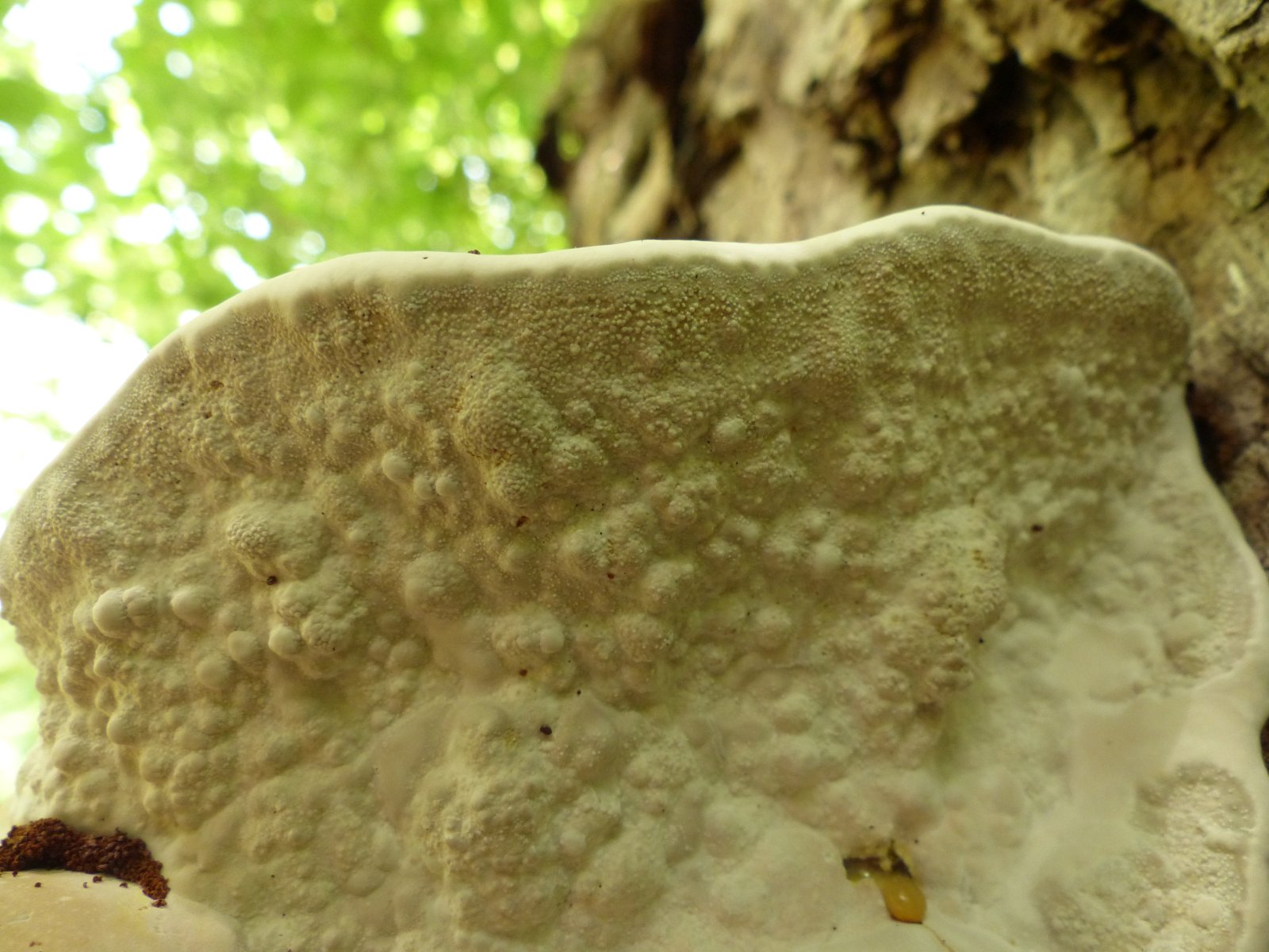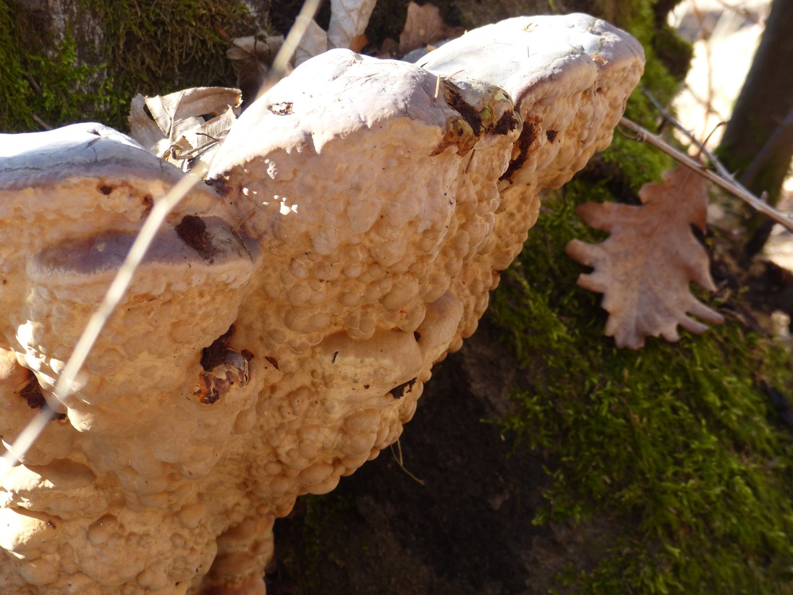 Ich habe an einen Grauen Feuerschwamm gedacht. Nur zeigt die Unterseite keinerlei Poren. Alles sieht aus wie Knubbel.