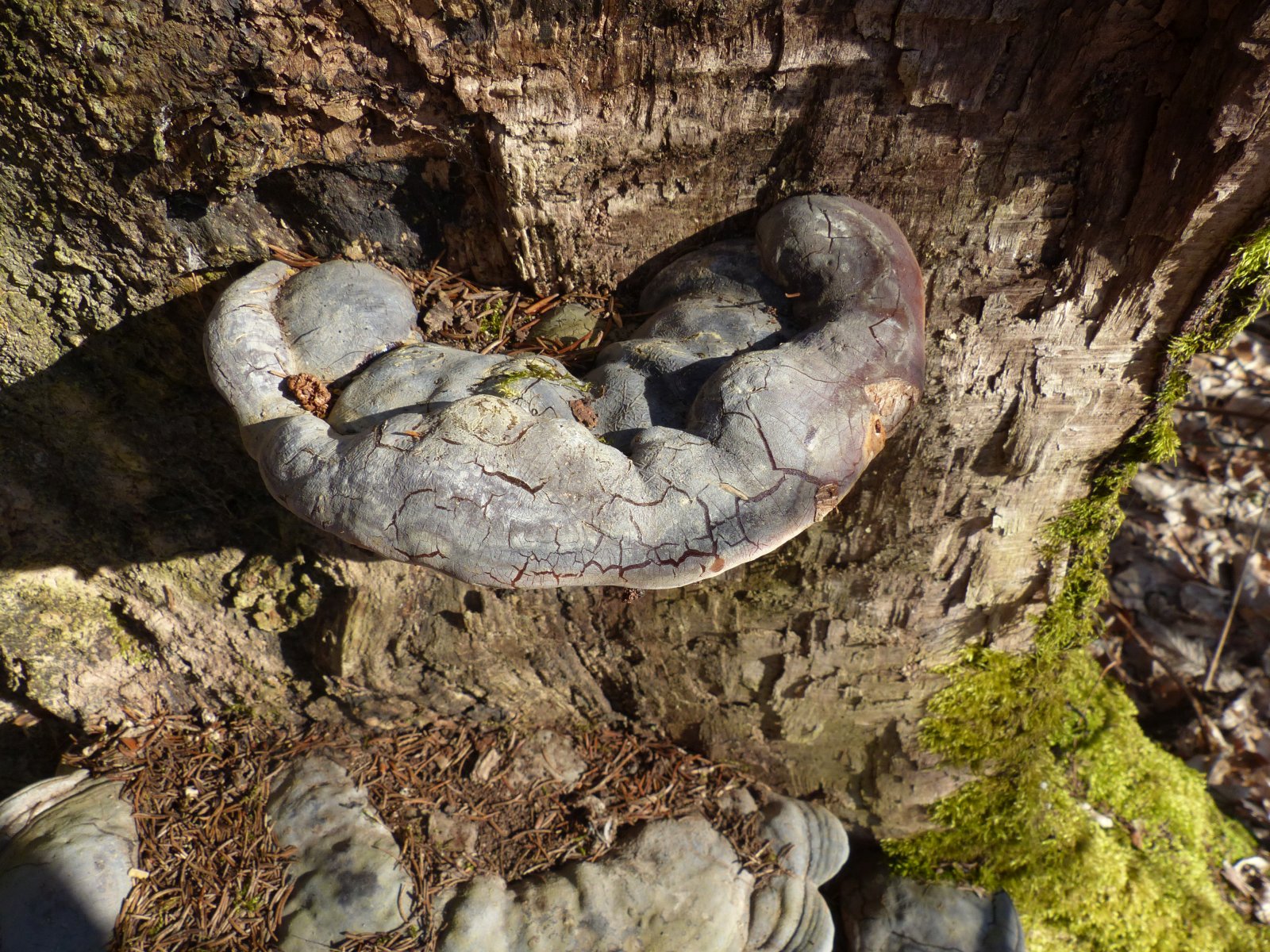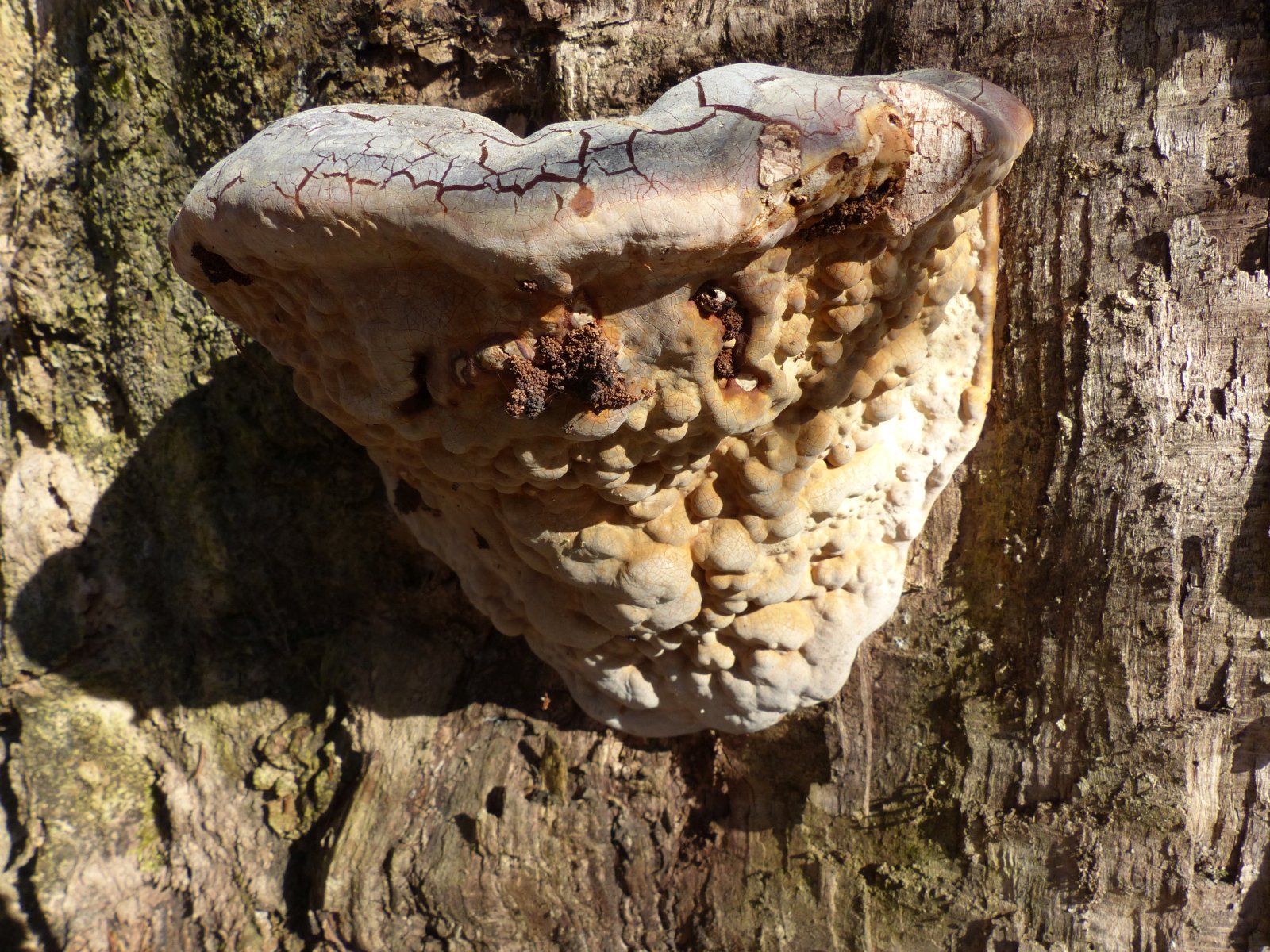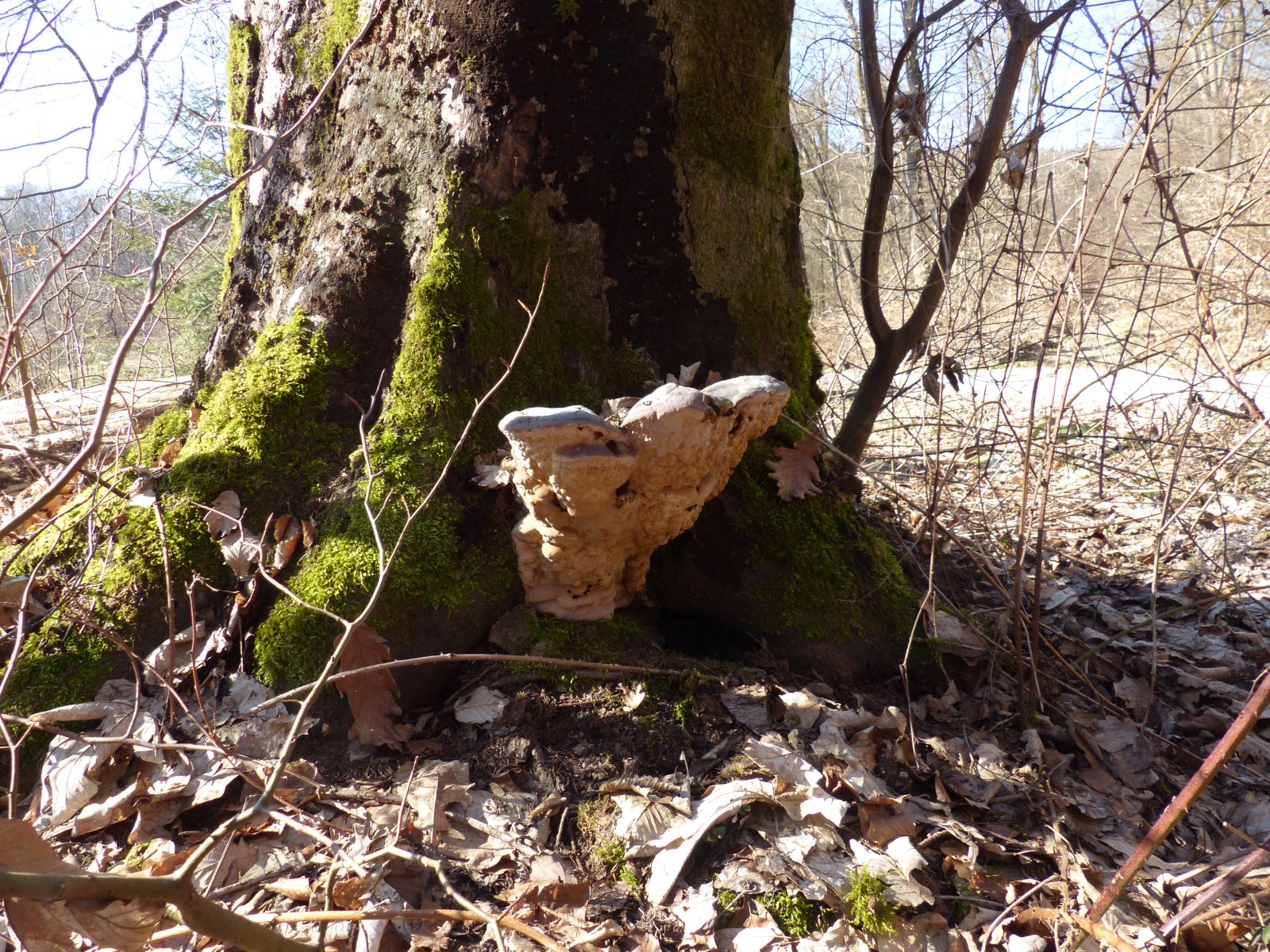 Ich habe an einen Grauen Feuerschwamm gedacht. Nur zeigt die Unterseite keinerlei Poren. Alles sieht aus wie Knubbel.