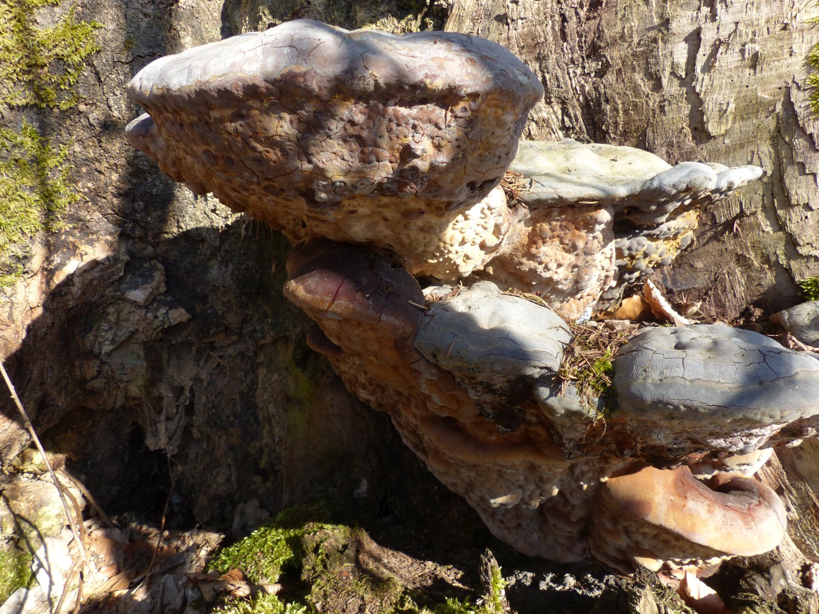 Ich habe an einen Grauen Feuerschwamm gedacht. Nur zeigt die Unterseite keinerlei Poren. Alles sieht aus wie Knubbel.