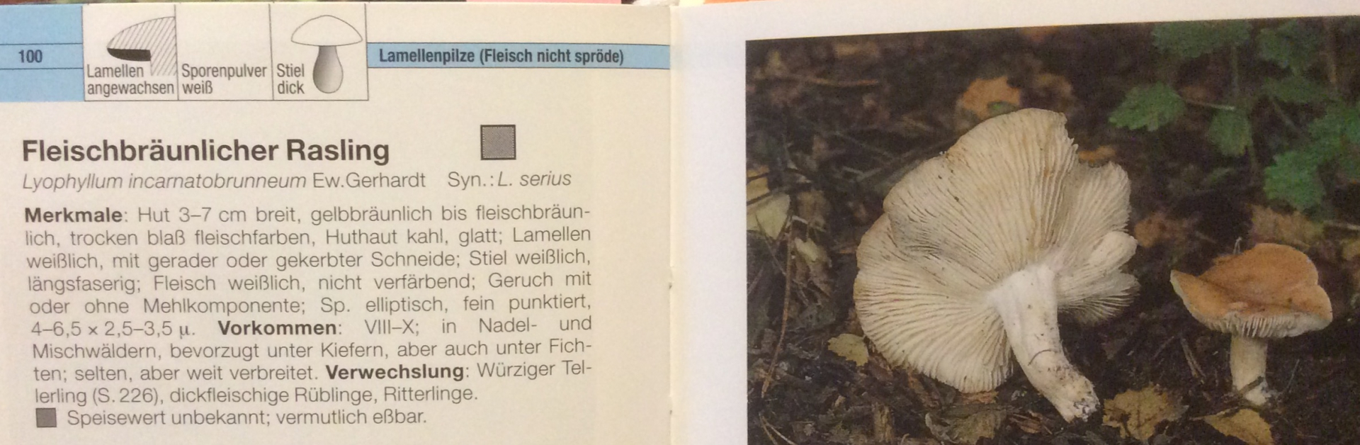 Den hatten vier Teilnehmer richtig. Natürlich habe ich auch die alte Bezeichnung (Lyophyllum incarnatobrunneum) oder den Mix aus alle dem gewertet. Für den fleischfarbenen Schönkopf - 2 x geraten - gab es noch zwei Gnadenpunkte. Obwohl der wo ganz anders hingehört.