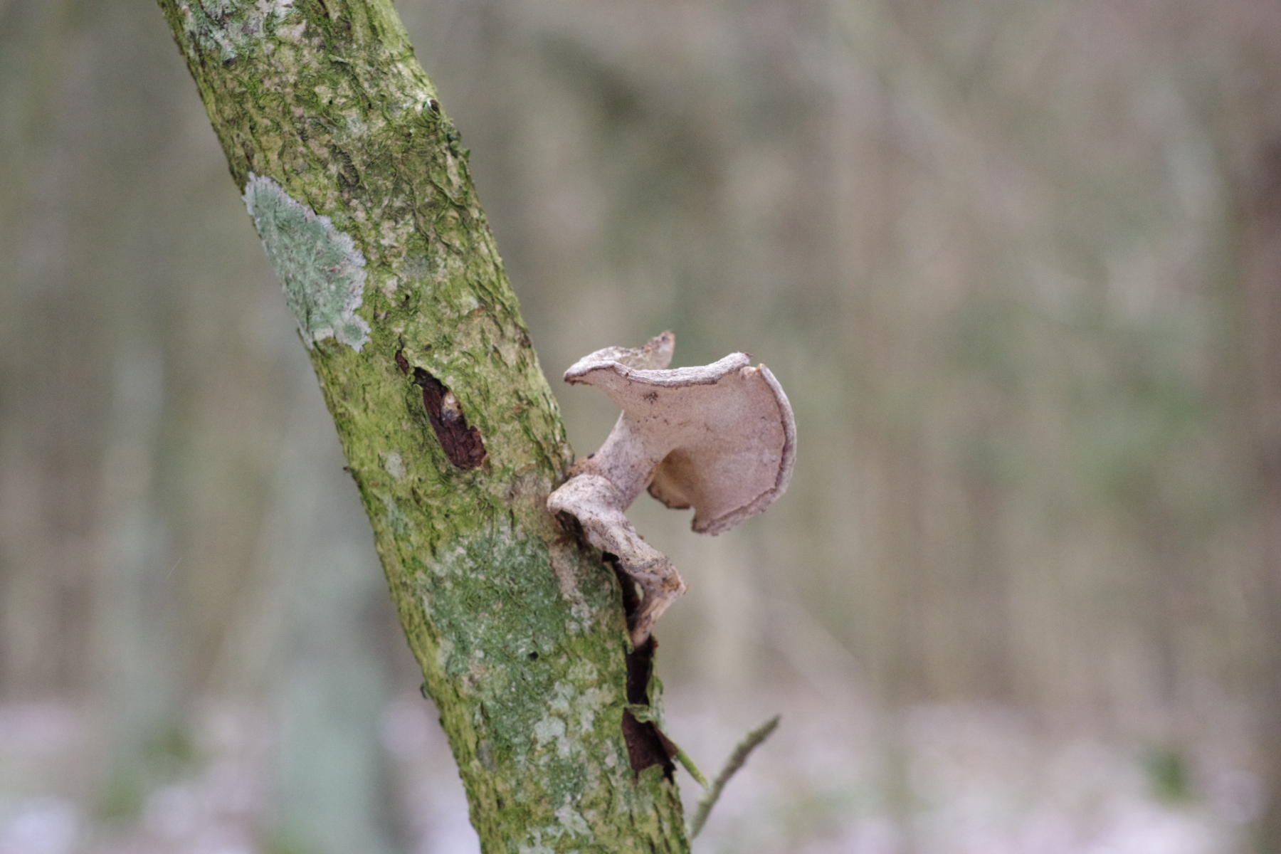 Polyporus siecher . Zu feine Poren , kaum zu sehen . Wenn Hypomyces Befall dann sind Poren nicht zu sehen ( auch Lamellen nicht ) aber in Bernds fall bin nicht so siecher das um starke Hypomyces Befall gehet nur vertrocknet - Mumie . Es gibt noch ein Möglichkeit , mit so feine Poren , Picipes tubaeformis , auch an Haselbaum vorkommen ( Weichlaubholz ) .