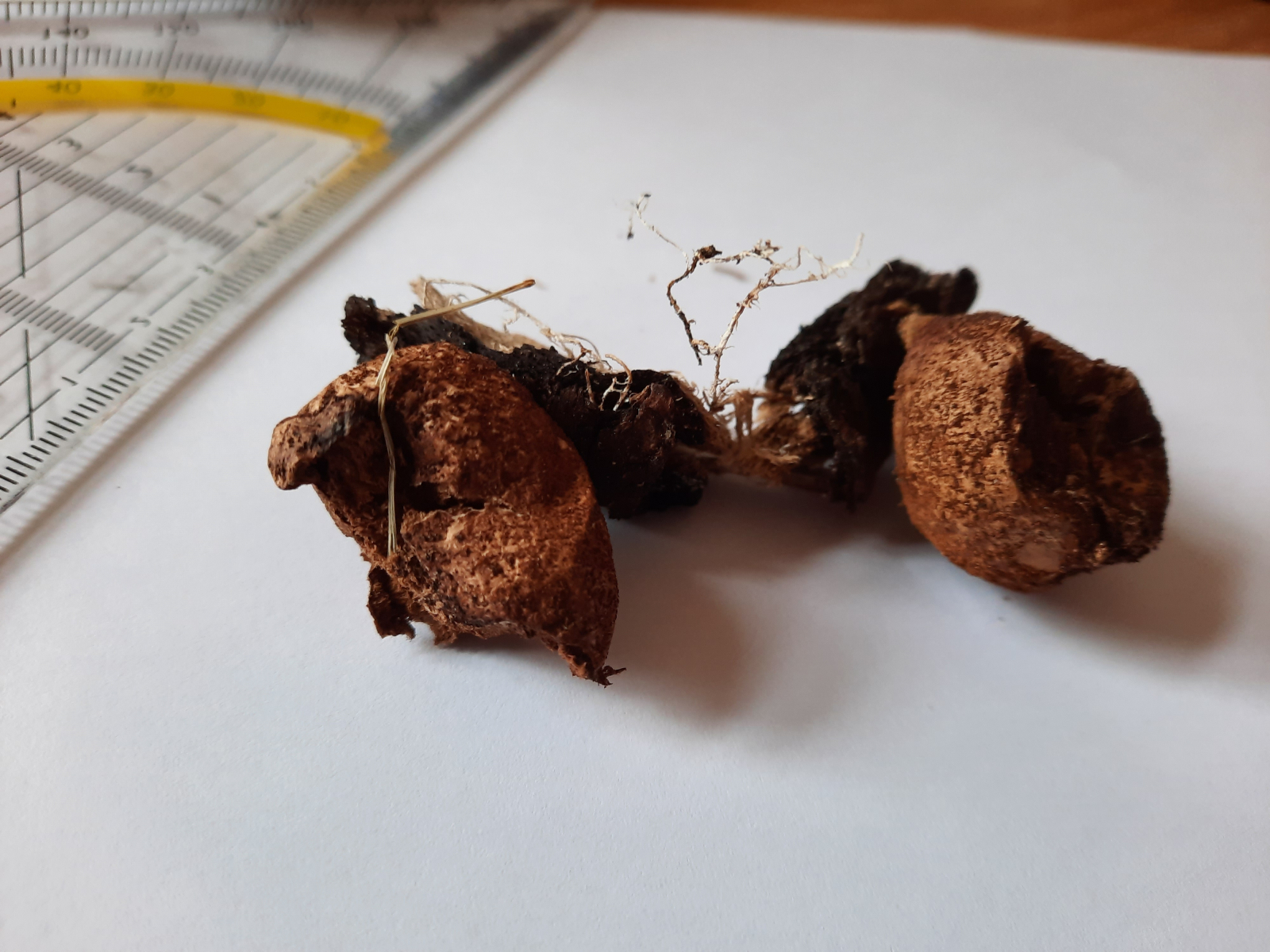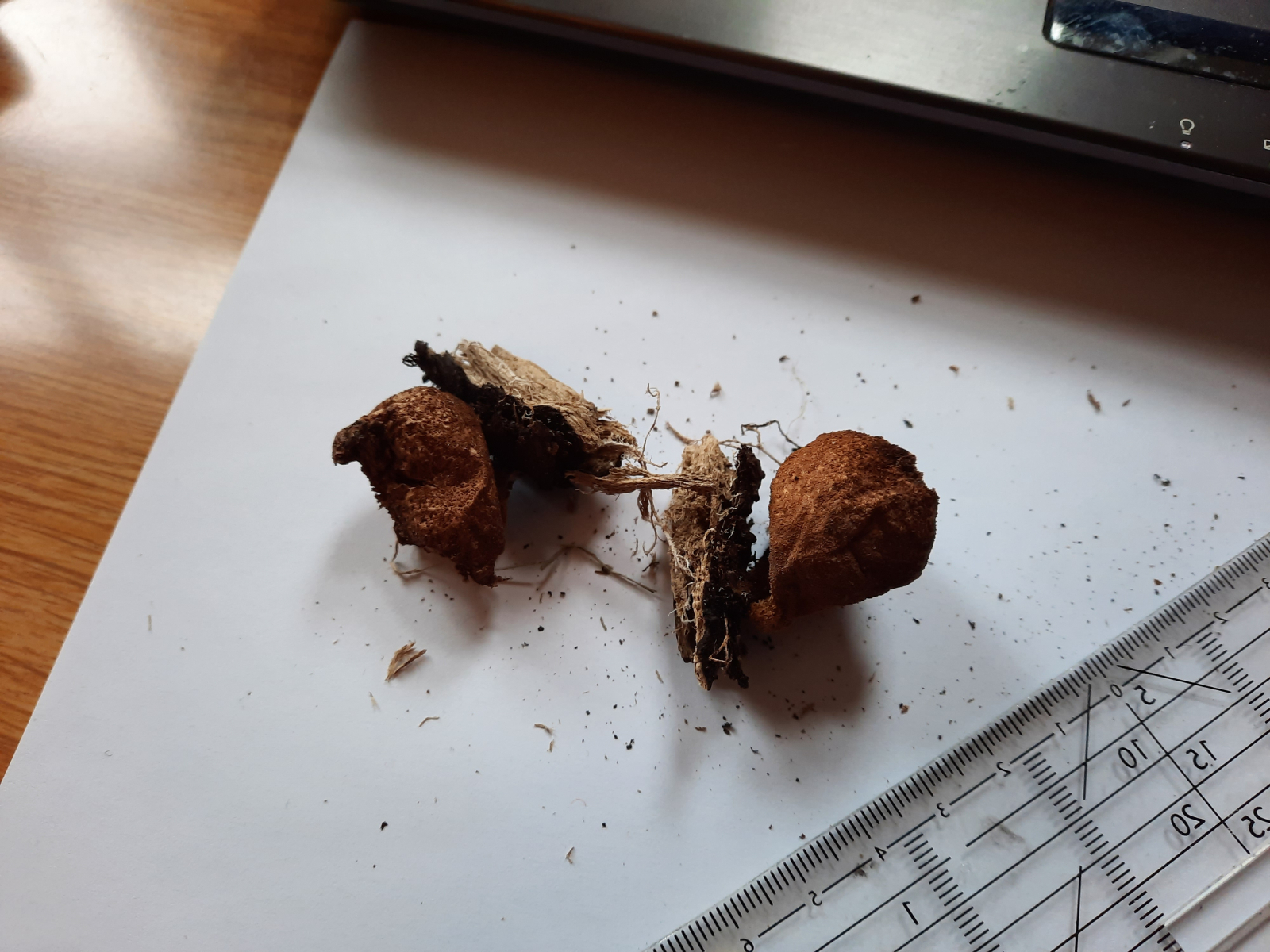 Es handelt sich um zwei links und rechts aus einem morschen Stück Holz (Laubgewächs, höchstwahrscheinlich Linde) herauswachsende Pilzkörper, die jeweils so ca. 2-3 cm Durchmesser hatten, und von oben ein wenig wie Boviste aussehen (ich habe aber absolut keine Ahnung von Pilzen, daher ist die Aussage von mir nix Wert^^). Auf jeden Fall scheinen sie ursprünglich rundlich, geschlossen und oben etwas "fleckig" gewesen zu sein. Das Innere ist durchgehend porös und im nun getrockneten Zustand genauso Braun wie das äußere - ein helles Haselnussbraun würde ich sagen.