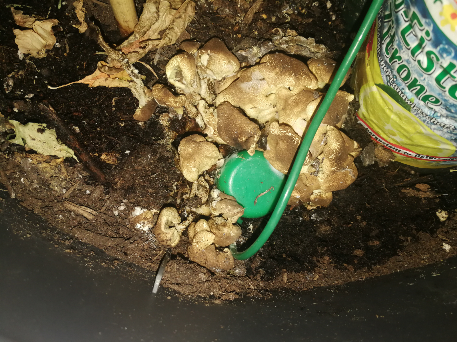 ich beobachte seit Wochen dass sich Pilze in meinem Blumentopf rund um ein Bewässerungs-Ding bilden. Nachdem sie nicht wieder von selbst verschwunden sind wollte ich sie nun Besteimmen um sie als Freund oder Feind zu Klassifizieren. Nachdem der Topf sehr groß ist würde ich das ganze Substrat nicht leicht austauschen können.