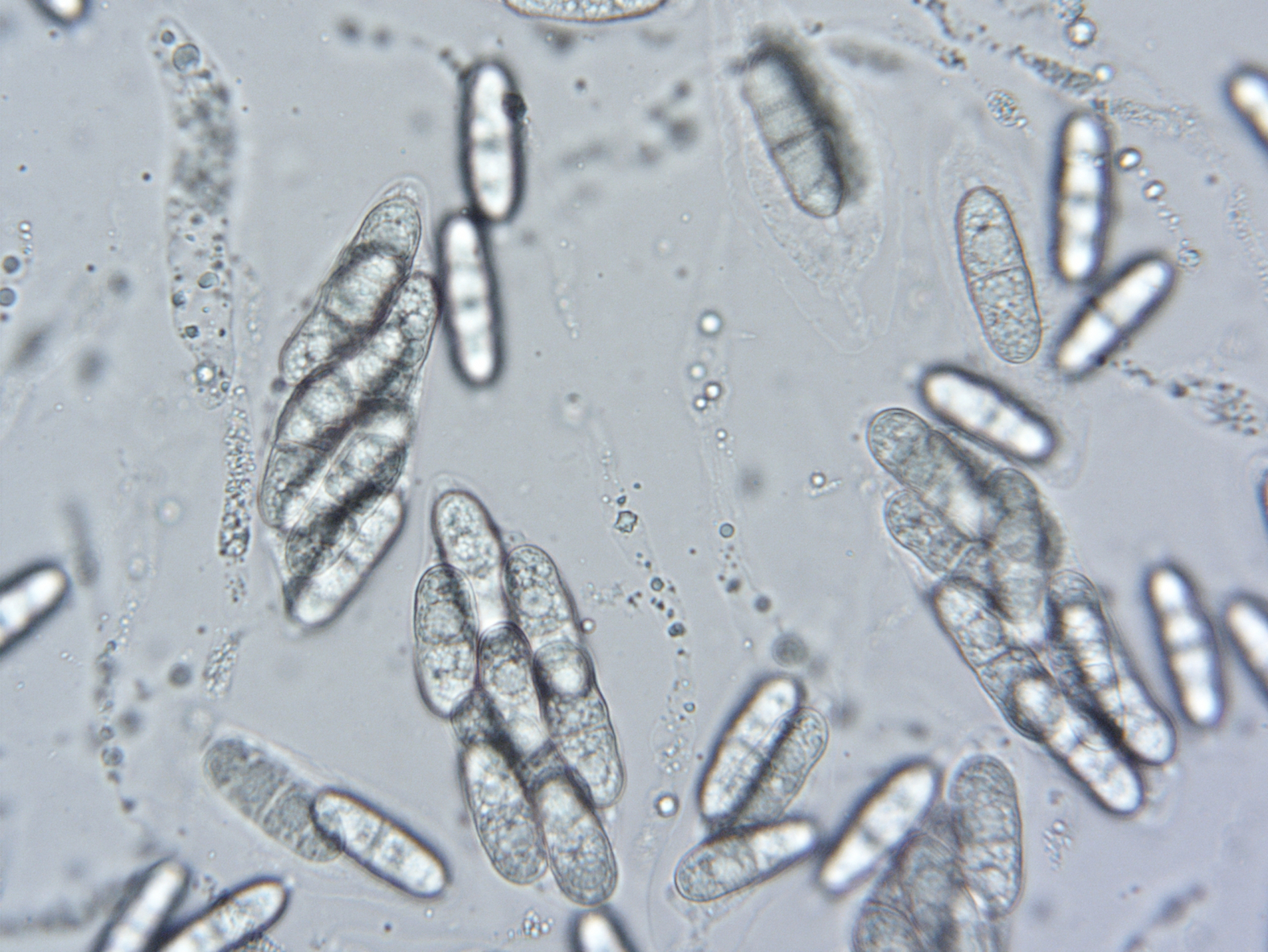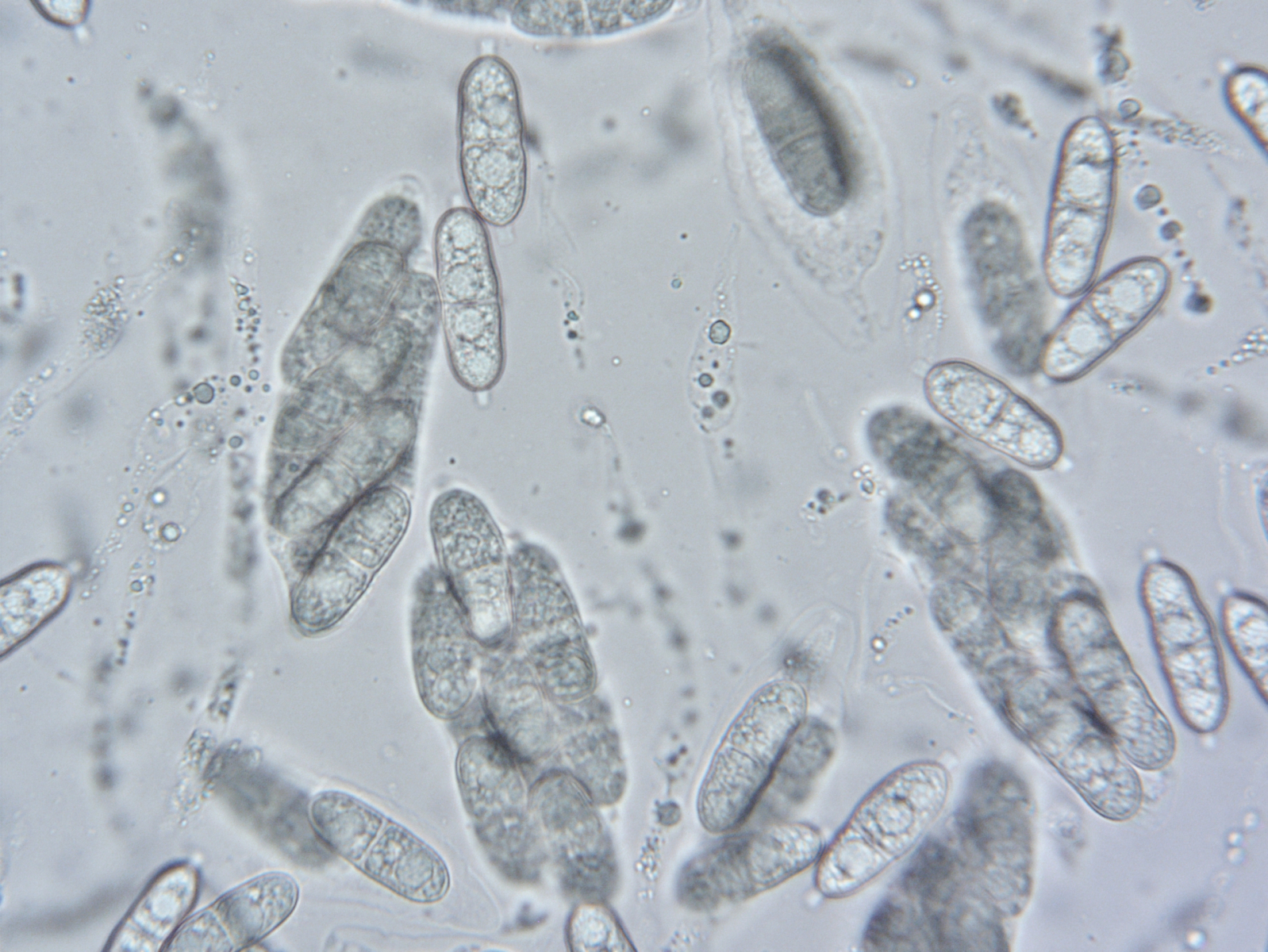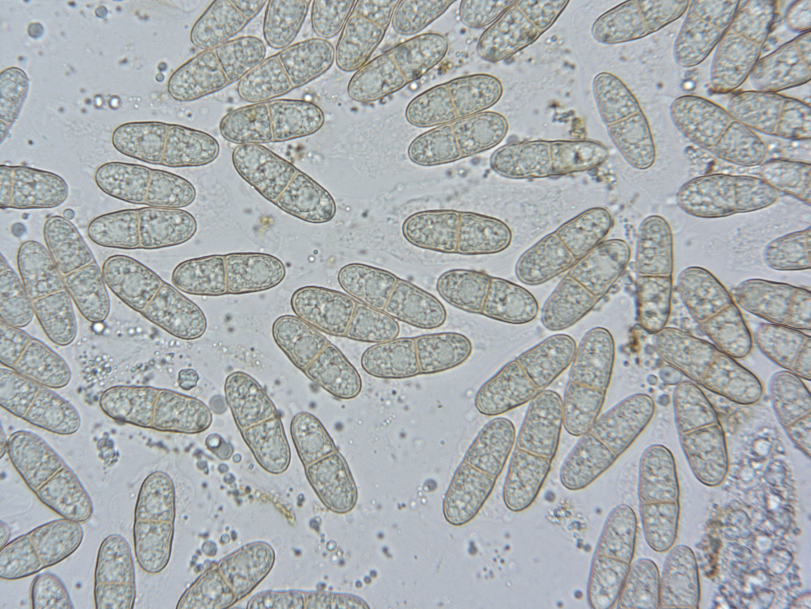 Die Sporenmaße sind 37,94 x 12,51 / 34,79 x 15,50 / 37,66 x 12,30 / 389,04 x 12,39 / 37,50 x 12,6 / 39,74 x 12,53 (µm). Auffällig finde ich die ziemlich konstante Breite. Einfach septiert. Das letzte Sporenbild ist in Kongorot, die anderen in Wasser.
