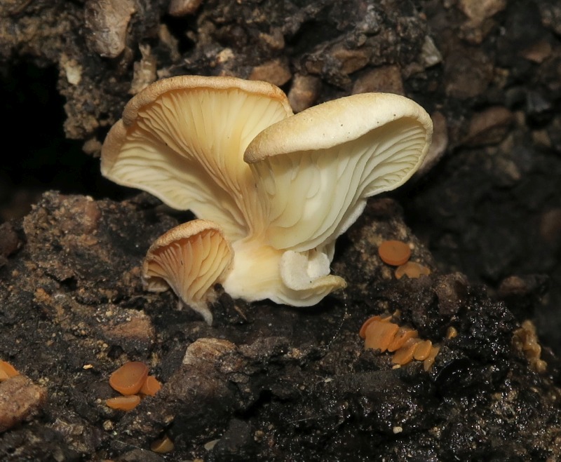 even more interesting to me would be the ascomycete on the wood (?) beneath the Pluerotus
