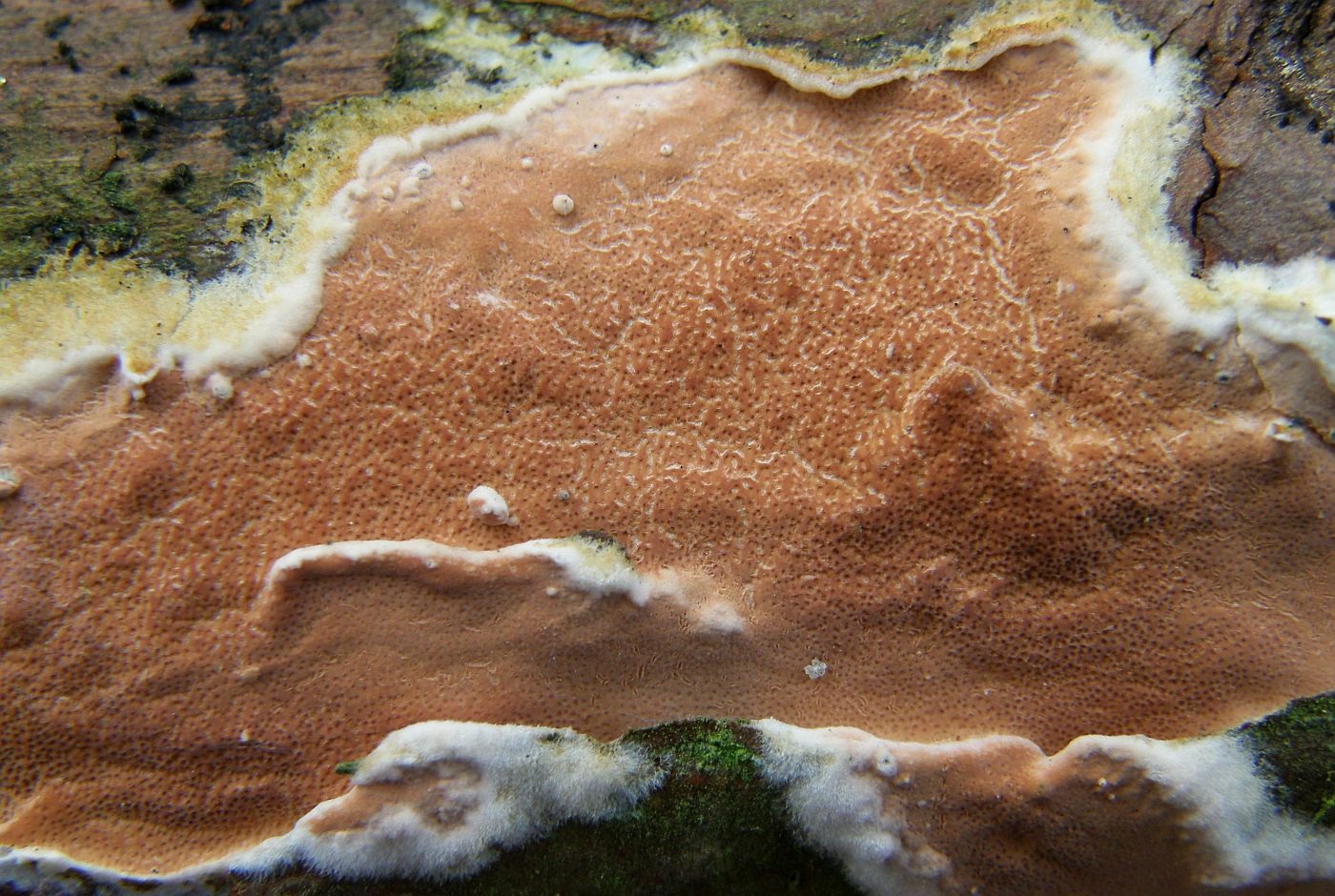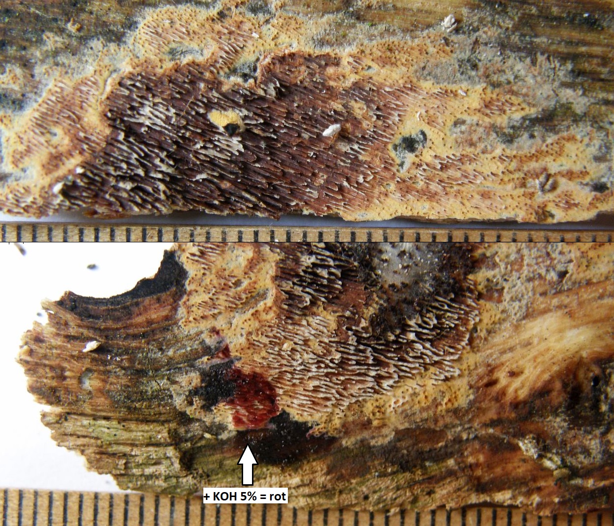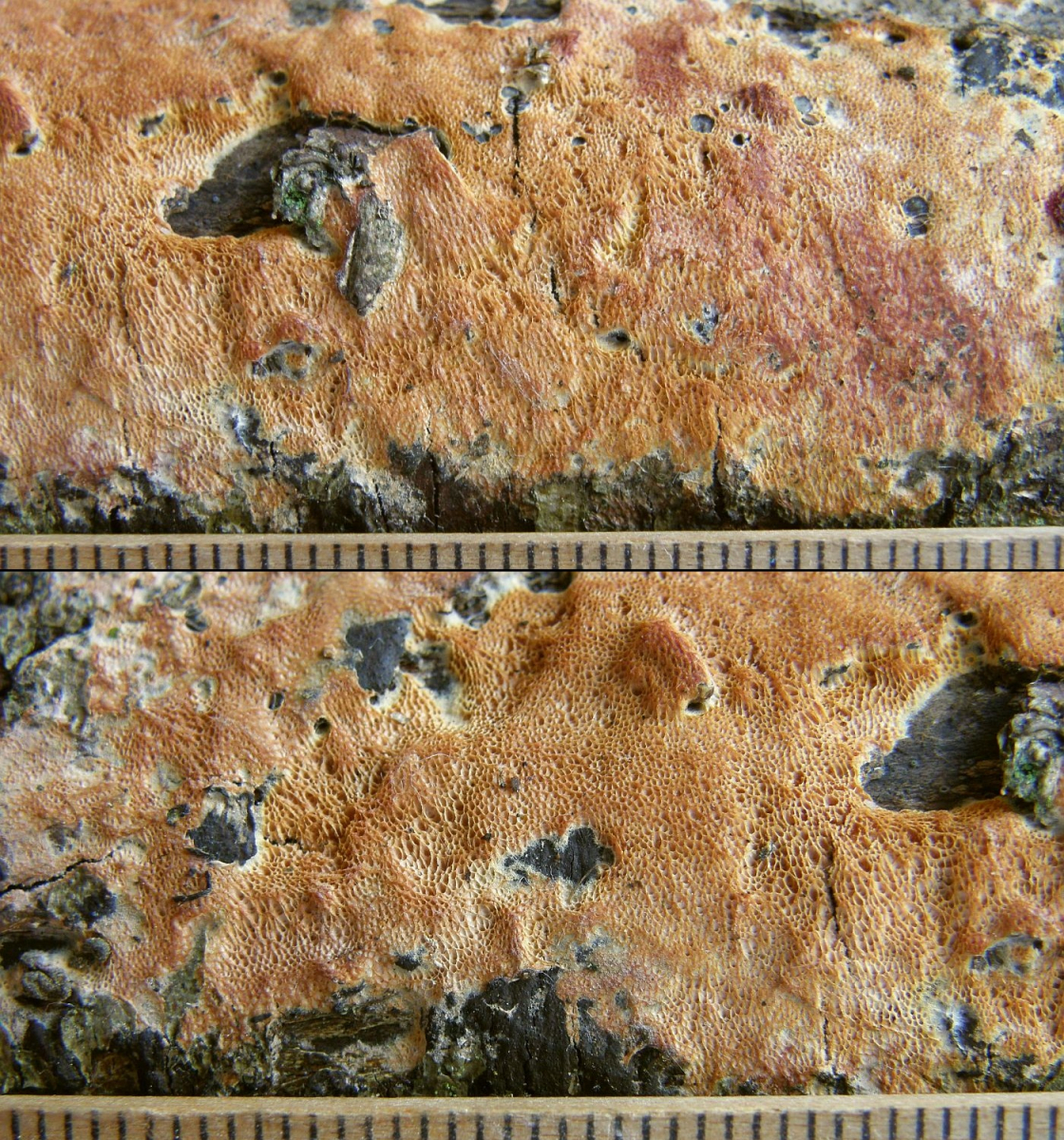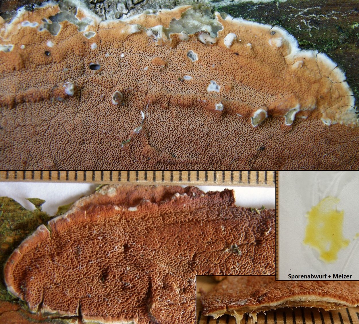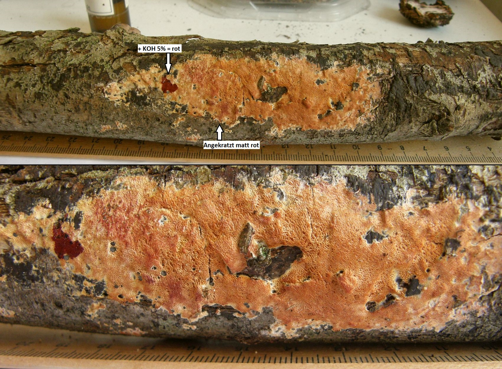an einer sehr morschen umgestürzten Fichte war ein ca 10- 15 cm langer, geschlitztporiger, dunkel-oranger Überzug