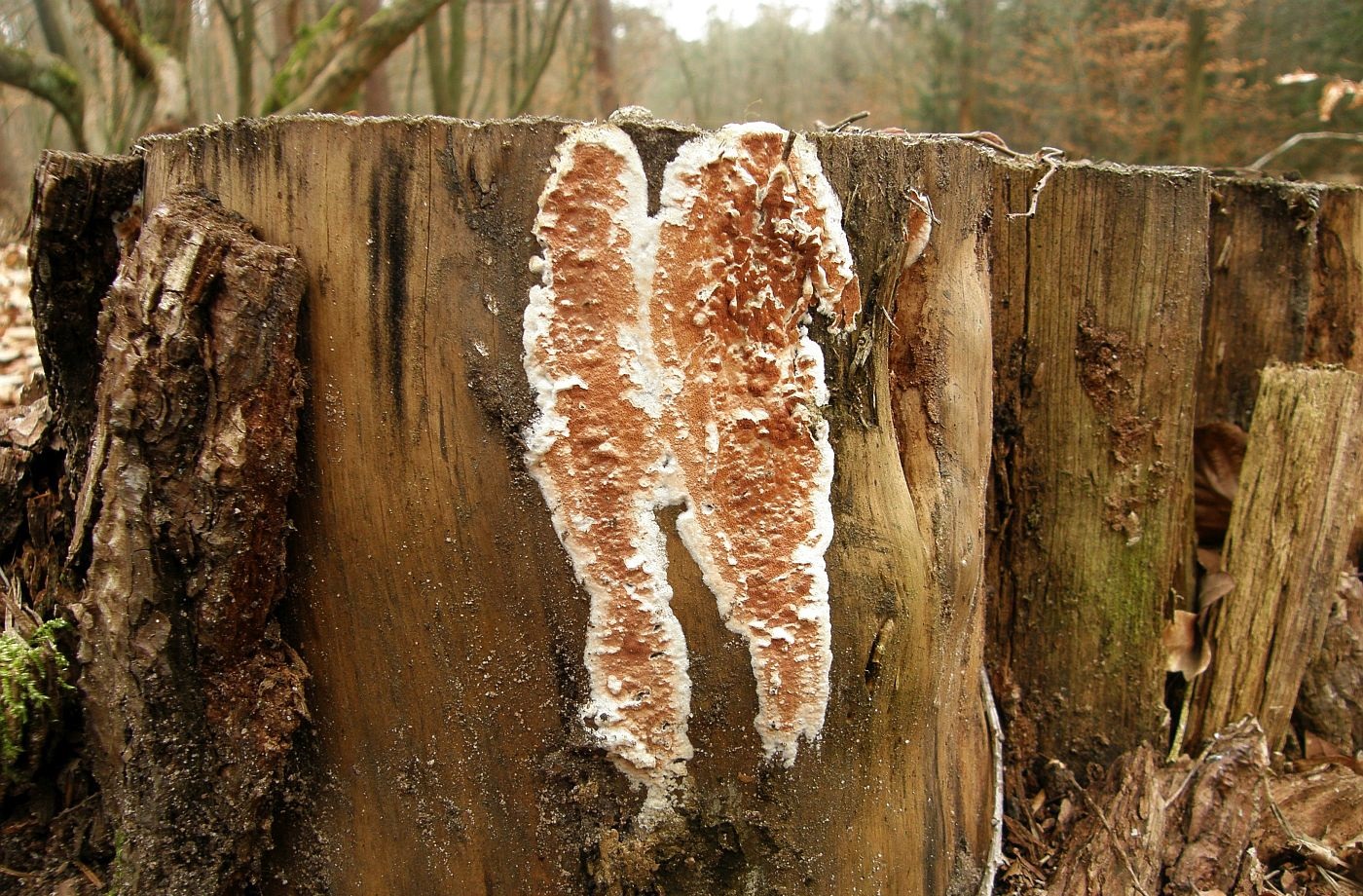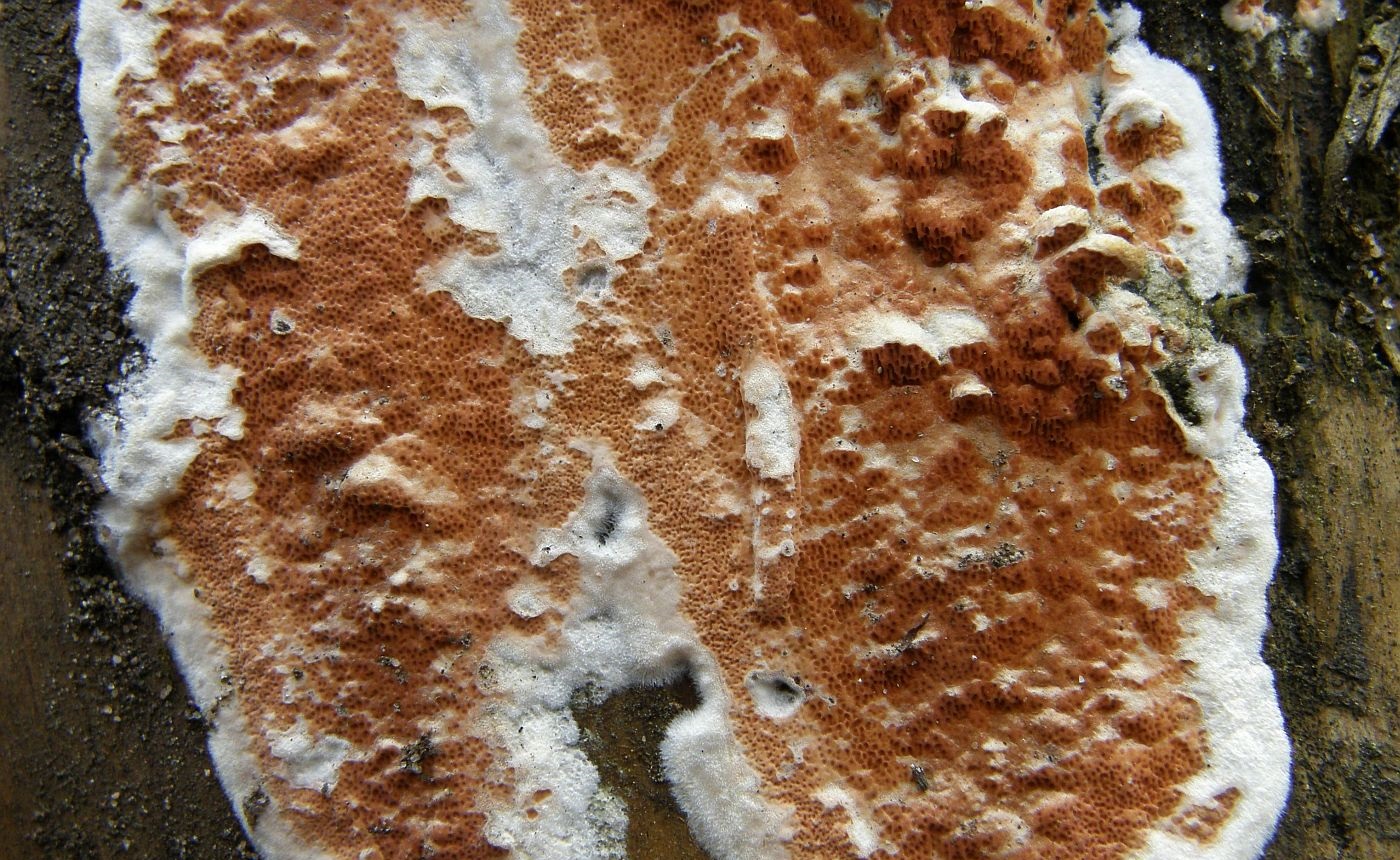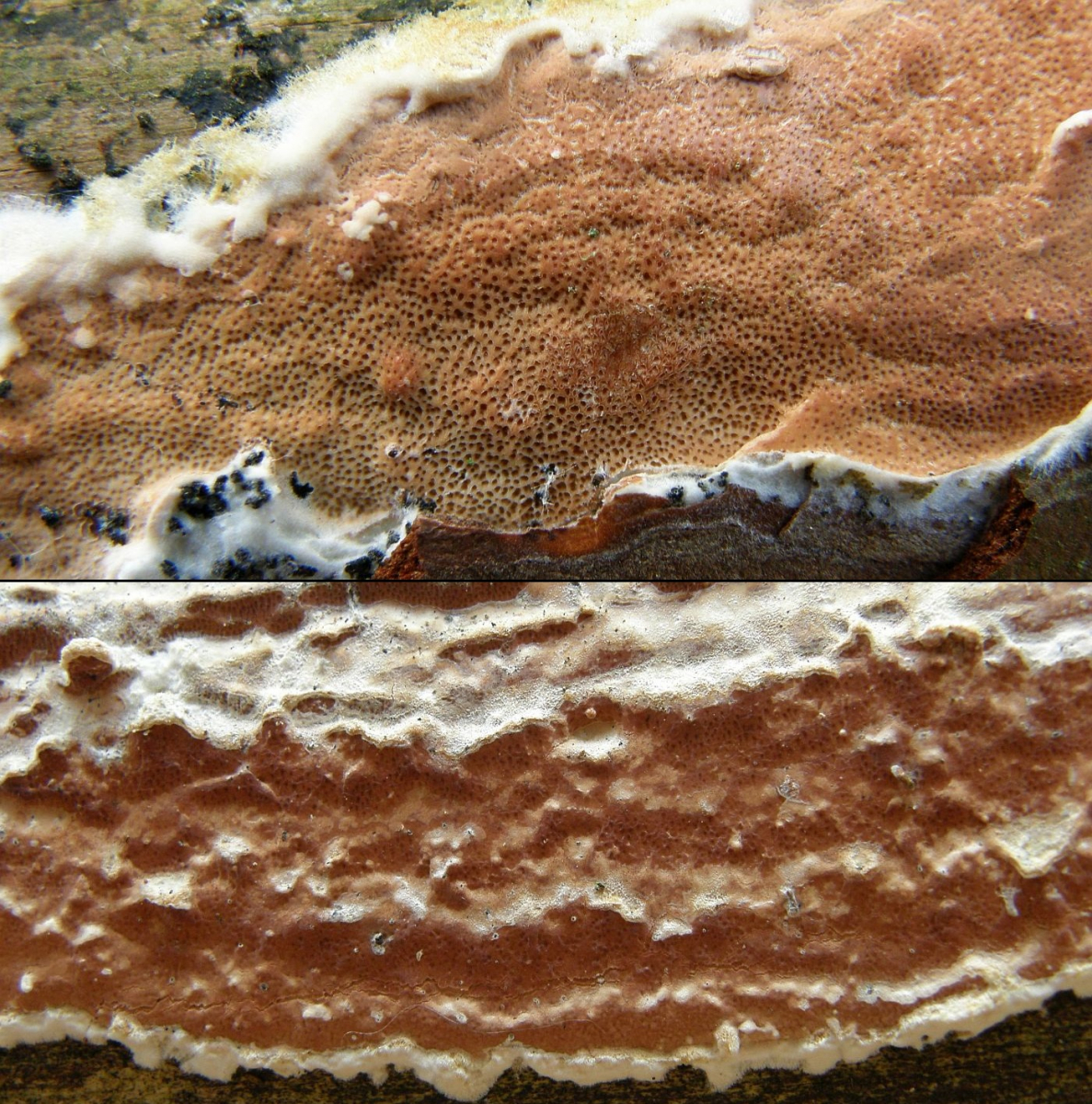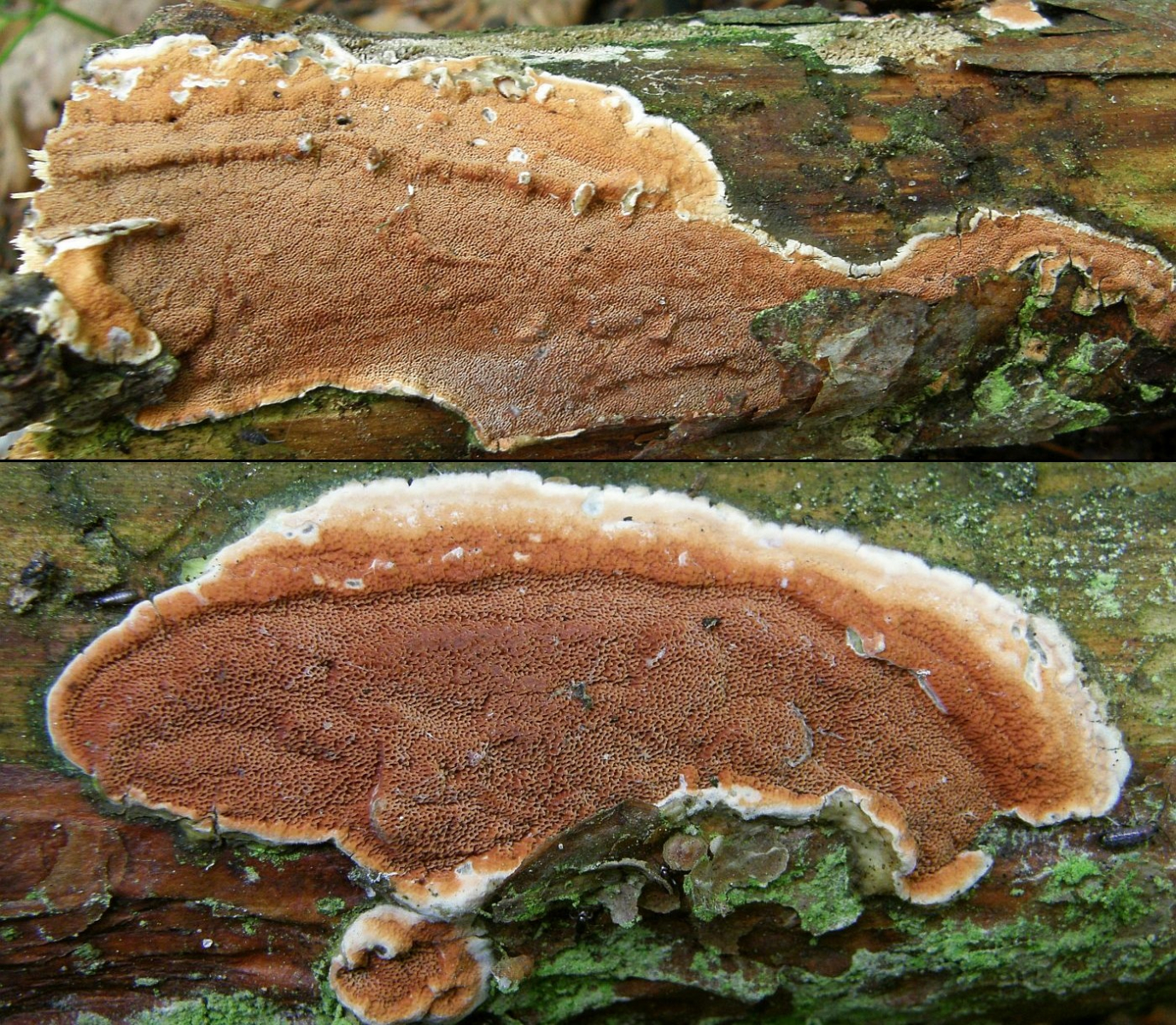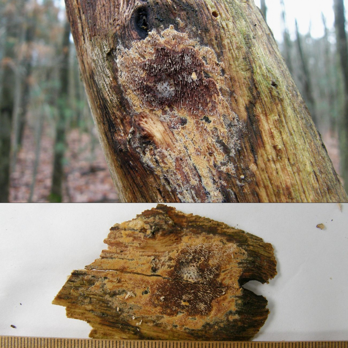 an einer sehr morschen umgestürzten Fichte war ein ca 10- 15 cm langer, geschlitztporiger, dunkel-oranger Überzug