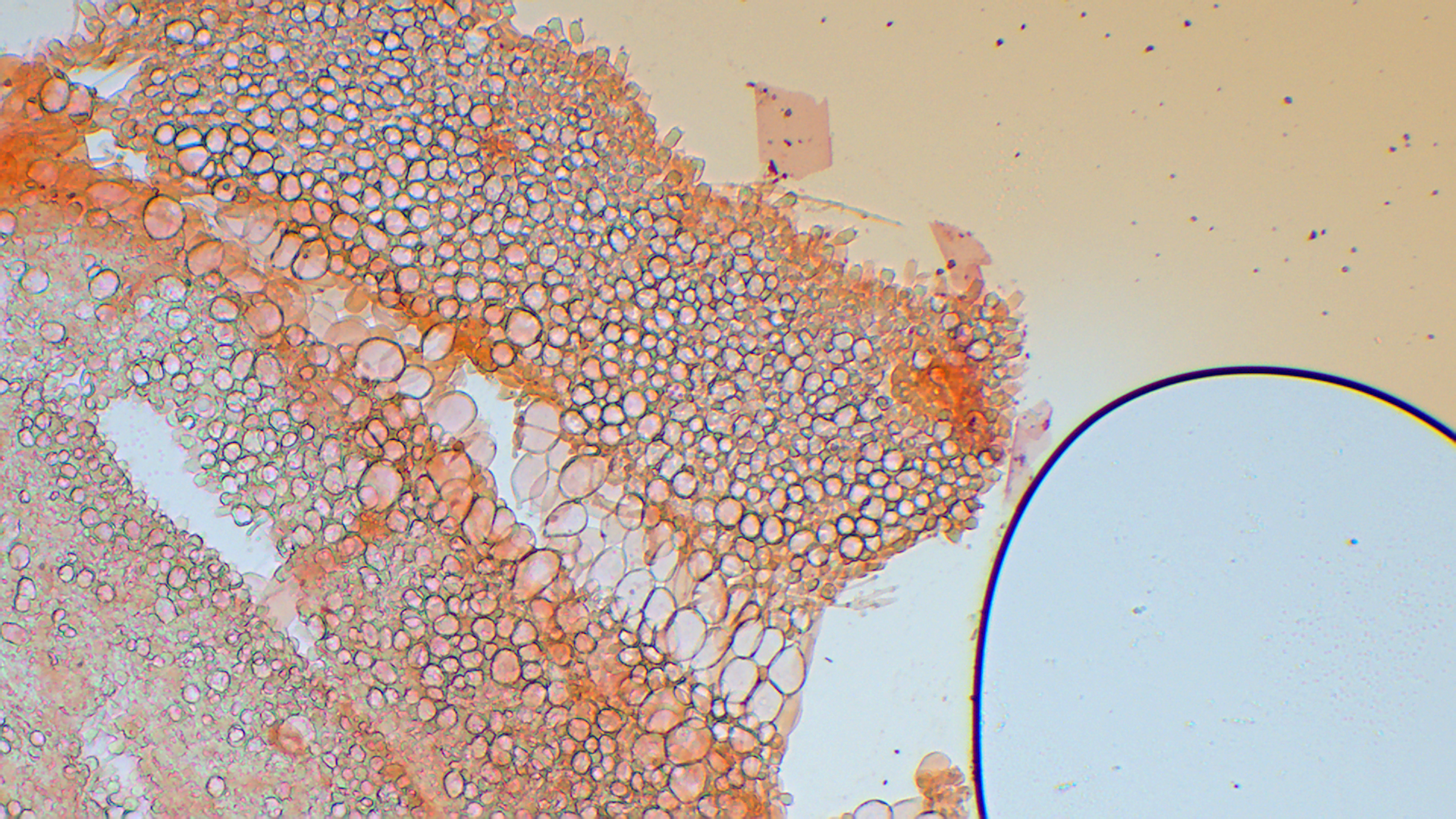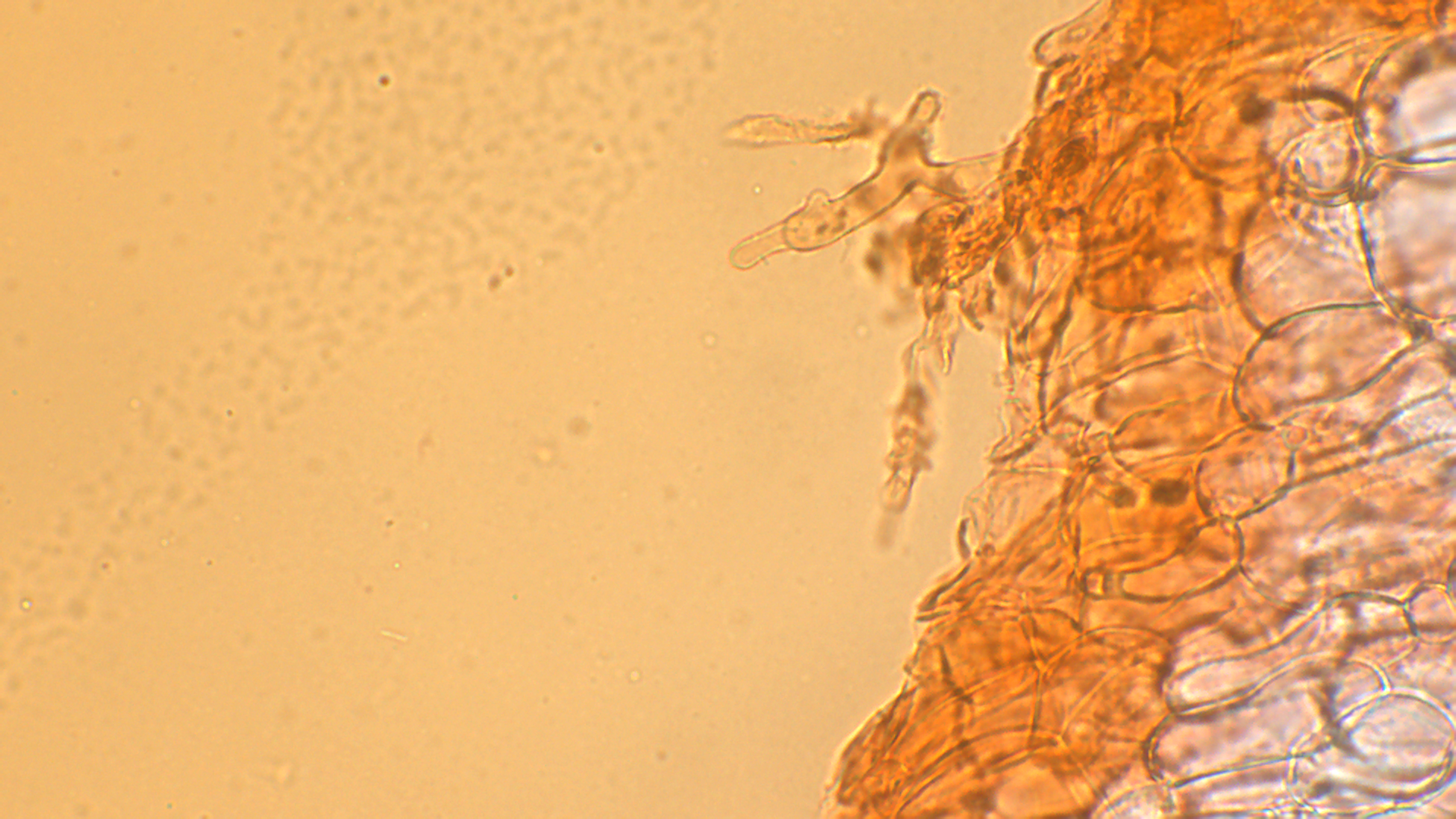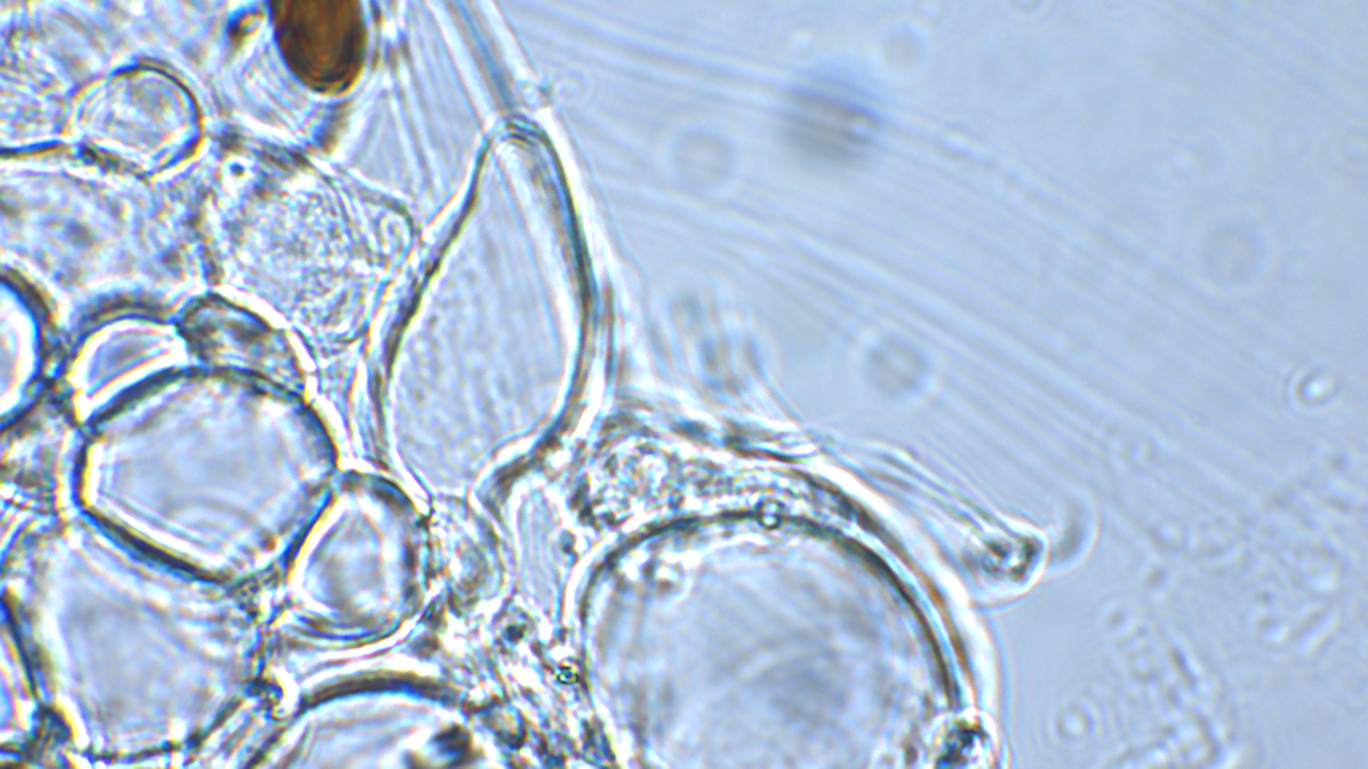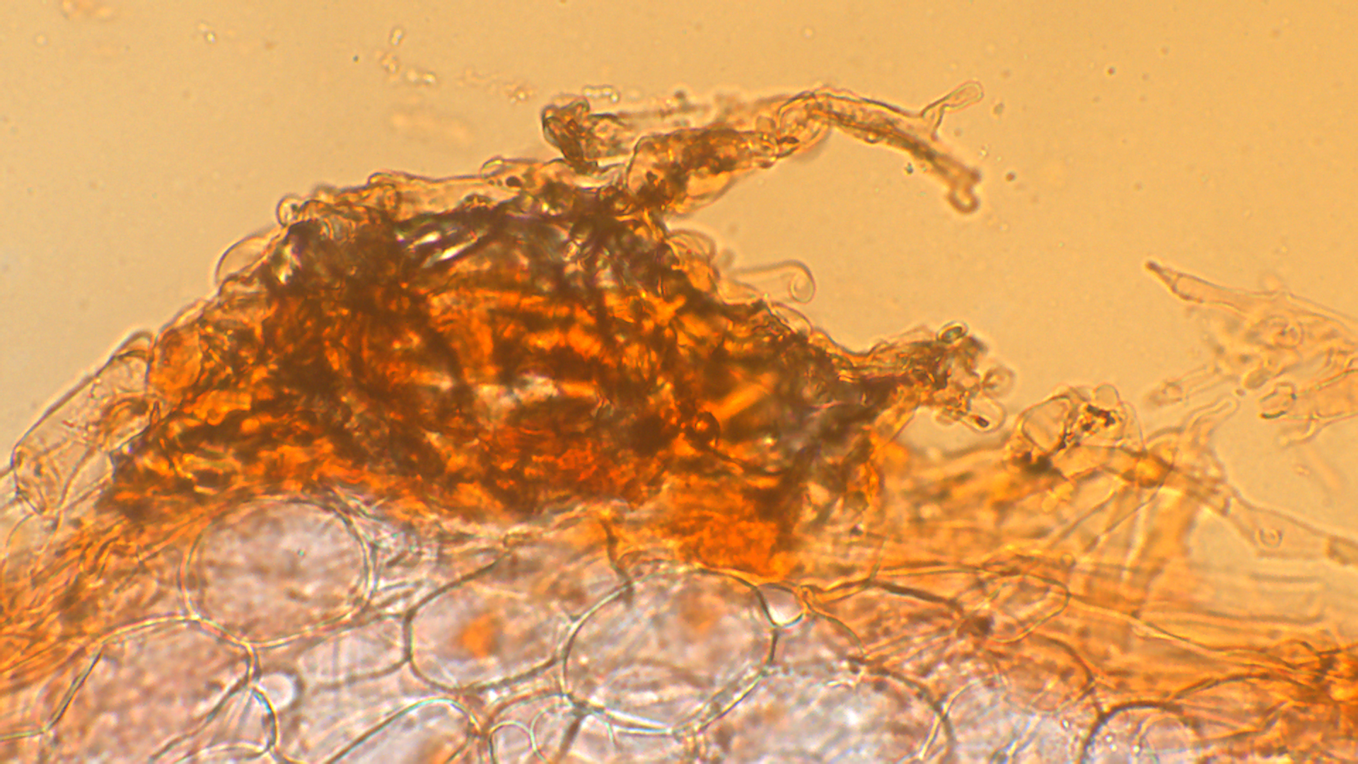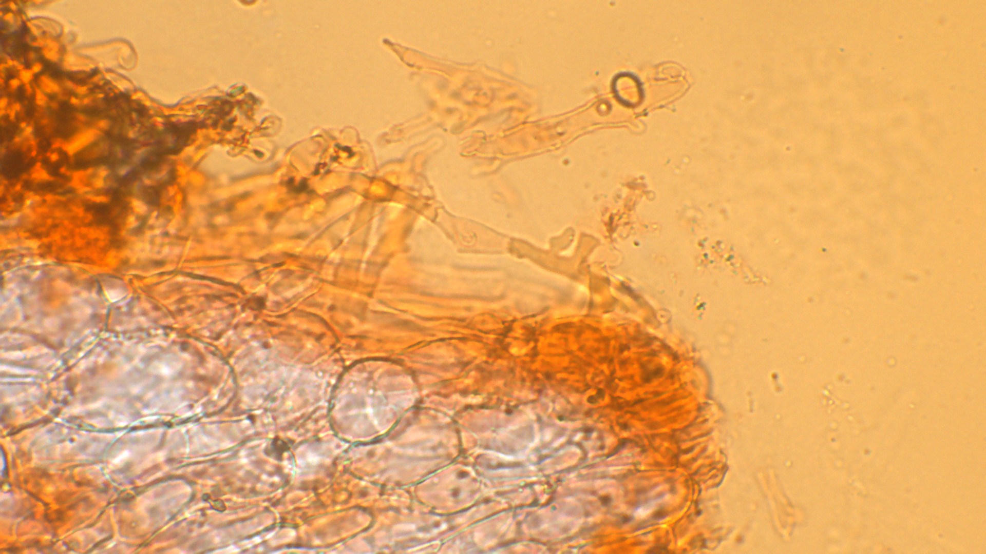 In der Mitte (die größeren Zellen) müsste es sich um die Cheilozystiden handeln. (Bei dem Fruchtkörper, den ich untersucht habe, haben die Lamellen zusammengeklebt, weshalb hier bestimmt mehr als ein Lamellenstückchen zu sehen ist)