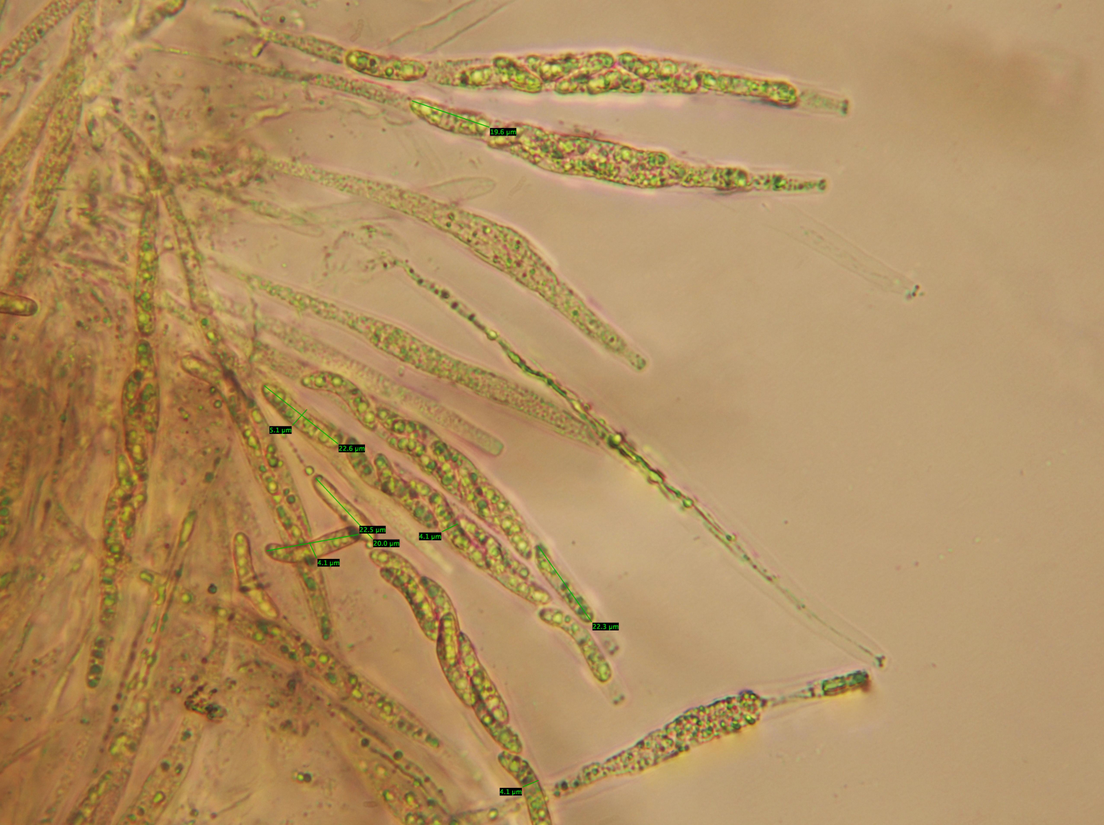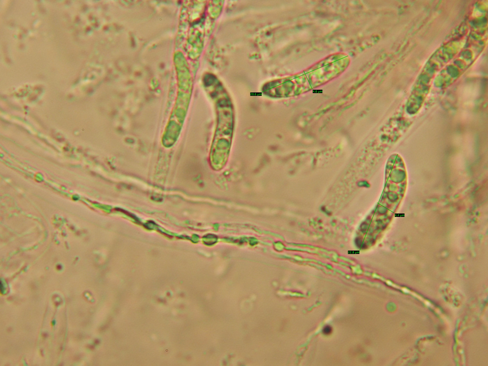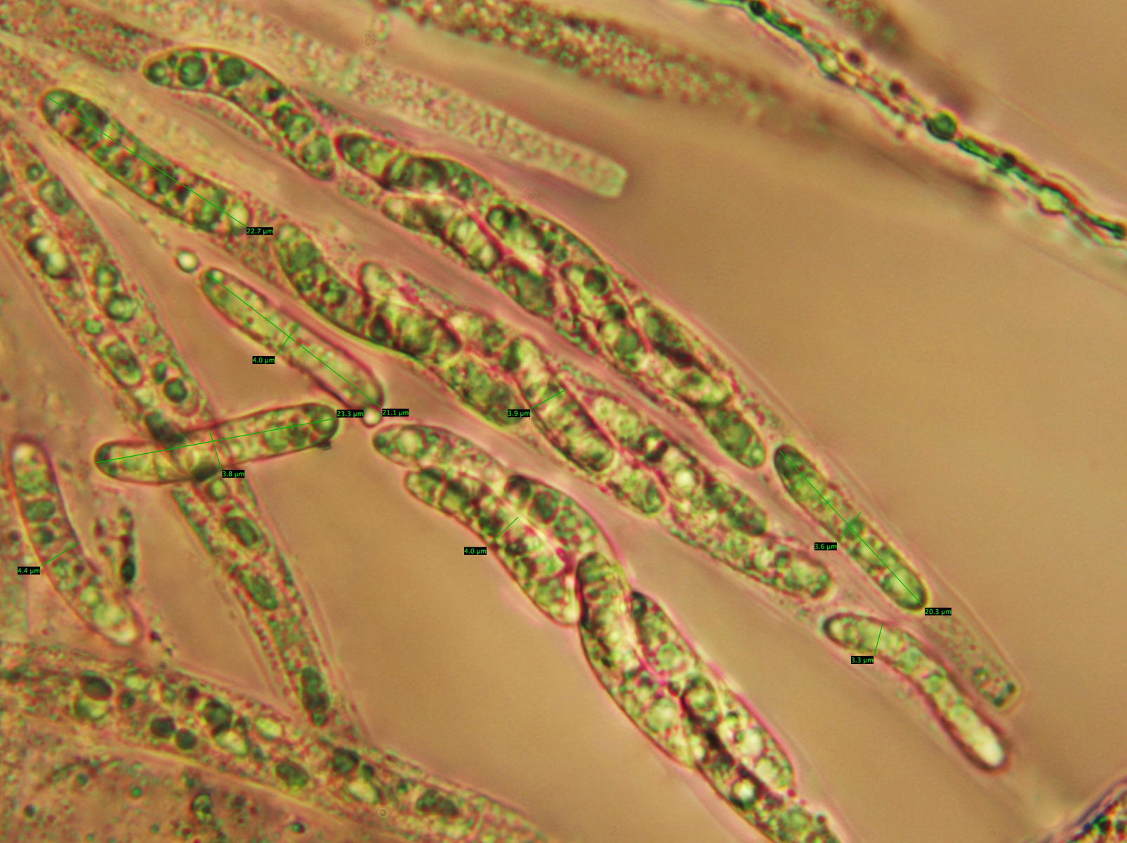 Dann habe ich sie mir mal unter dem Mikroskop angeschaut. Die Sporen waren 19,6-23,3 μm lang und 3,8-5,1 μm breit. Siehe Bilder: