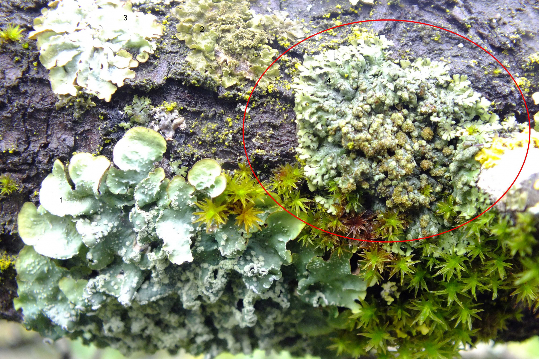 Auf dem Foto, das ich anhänge, meine ich neben einer punctelia jeckeri (mit 1 beschriftet, links unten) auch eine melanohalea exasperatula (mit 2 beschriftet, oben Mitte) zu erkennen. Nummer 3 ist überbelichtet. Was mich besonders interessiert - weil ich sie gar nicht zuordnen kann - ist die grüne Flechte rechts oben (mit 4 beschriftet, rot umrahmt). Welche mag das denn sein? Ich habe sie bisher nur einmal auf meinen Aufnahmen entdeckt.