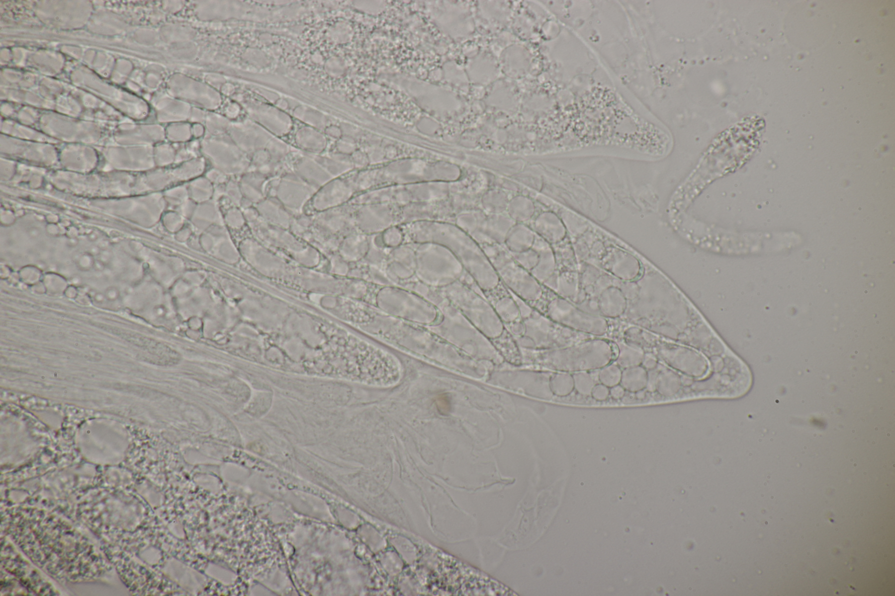 Die intakten, nicht so sehr gequetschten Asci sind uniseriat. Also für mich eindeutig Lasiobolus ciliatus!