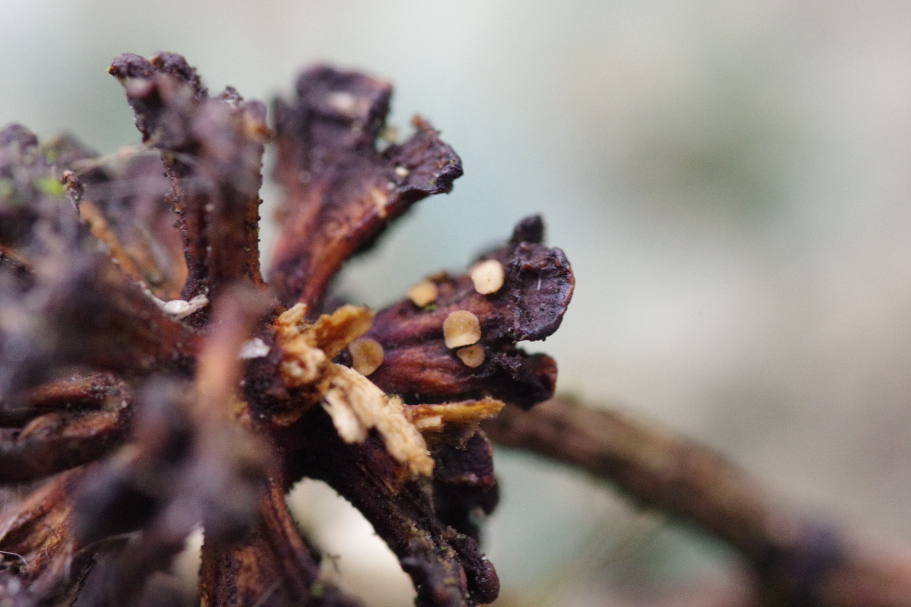 12) Mollisia amenticola an abgefallenem aber in der Luft hängenden Schwarzerlenzapfen