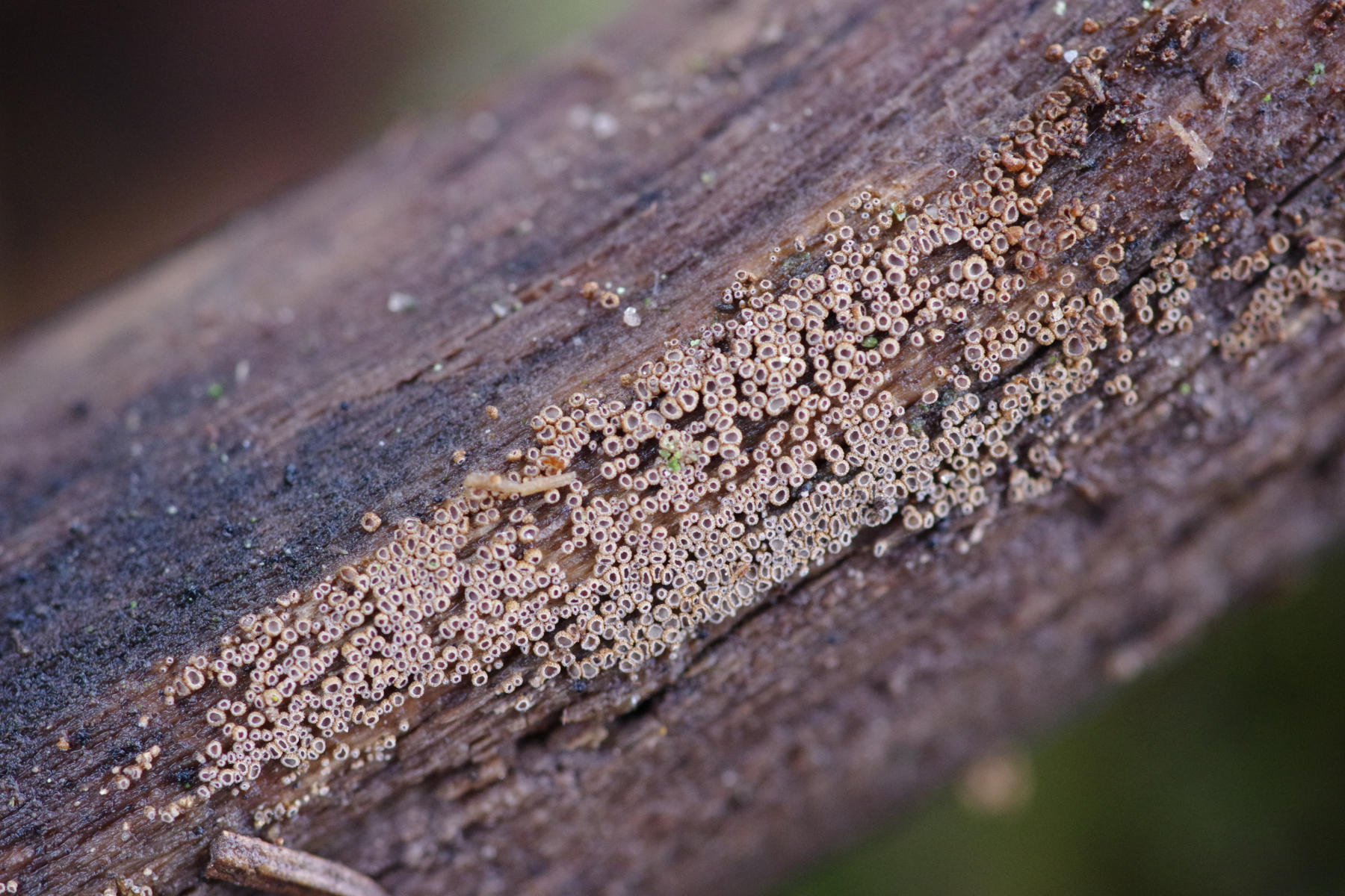 12) Mollisia amenticola an abgefallenem aber in der Luft hängenden Schwarzerlenzapfen