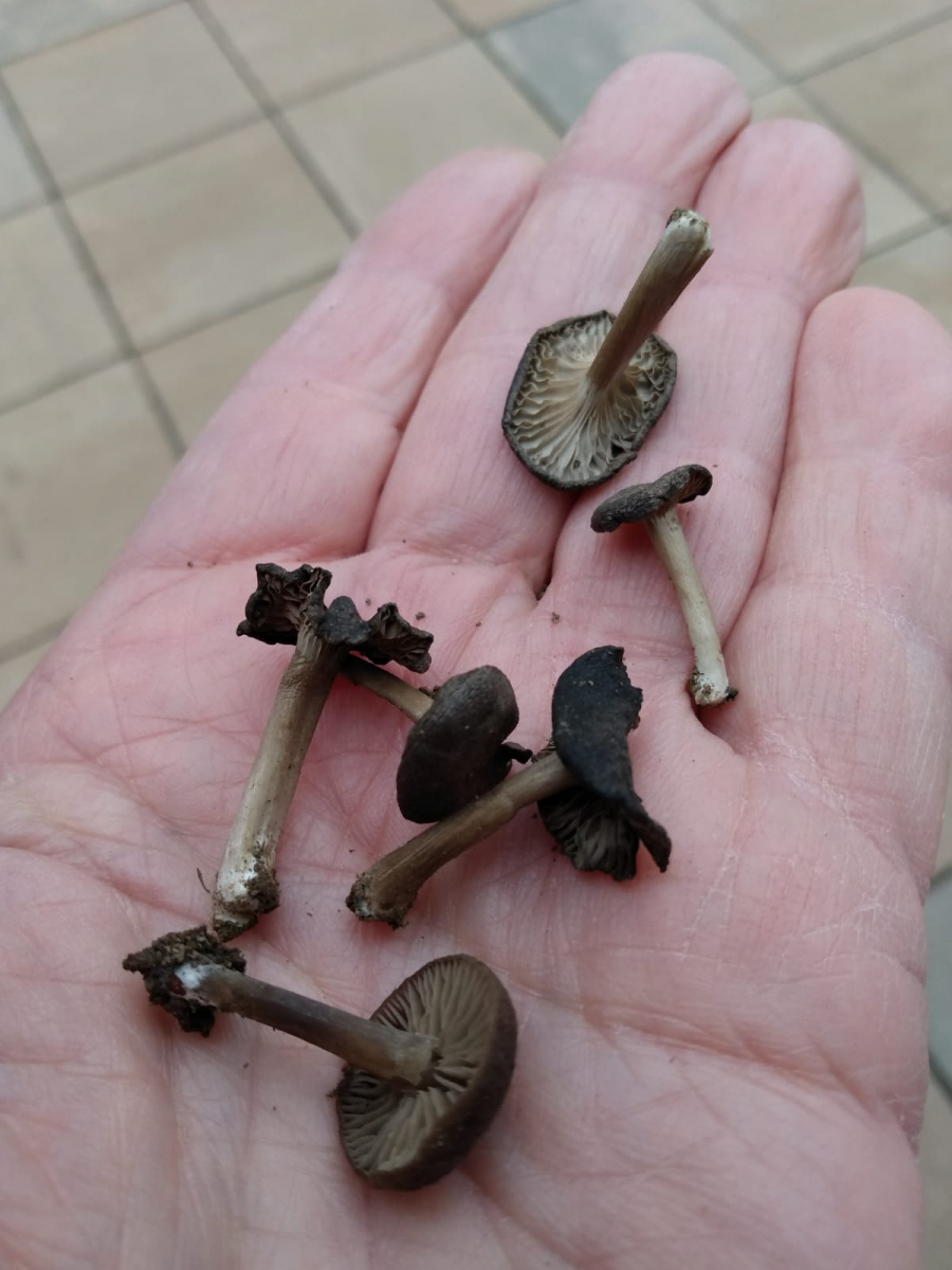 nicht bei mir am Thüringer Kältepol wo es gerade ein Schneetreiben allererster Güte gibt, sondern im Raum Saalfeld hat ein Pilzfreund vor einer Woche diesen Pilz in seinem Garten entdeckt, dem er nicht auf die Spur gekommen ist. Daher frage ich euch, ob ihr eine Idee habt. Mir ist klar, dass die Informationen sehr dürftig und die Fotos wenig aussagekräftig sind. Aber da es euch gelingt, sogar aus vergammelten Pilzfragmenten die richtige Art herauszubekommen (FPPR), bin ich optimistisch, dass ihr das bei diesem kleinen grauen trichterlingsähnlichen Pilzlein auch schafft.
