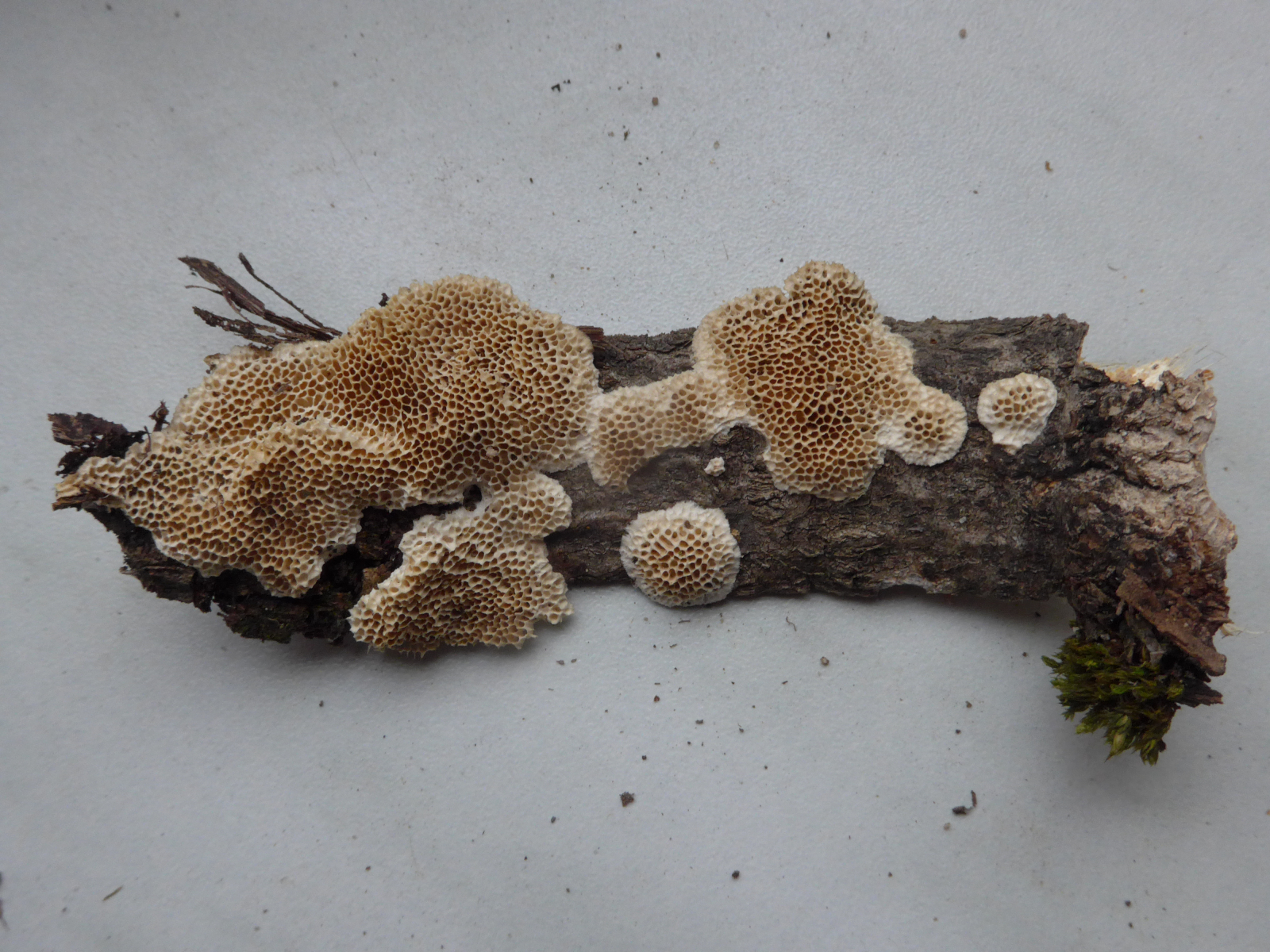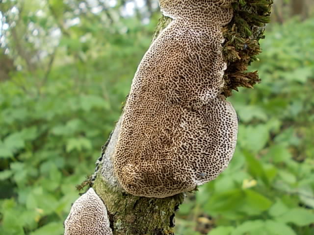 2.frisch cremefarbener resupinater Porling (durch Trocknung etwas nachgedunkelt) an Laubholz. Rissige Borkenstruktur; d.h. es käme vom Standort her Quercus oder Alnus in Frage. Gefunden im gleichen Bachgrund, wie den Inonotus.