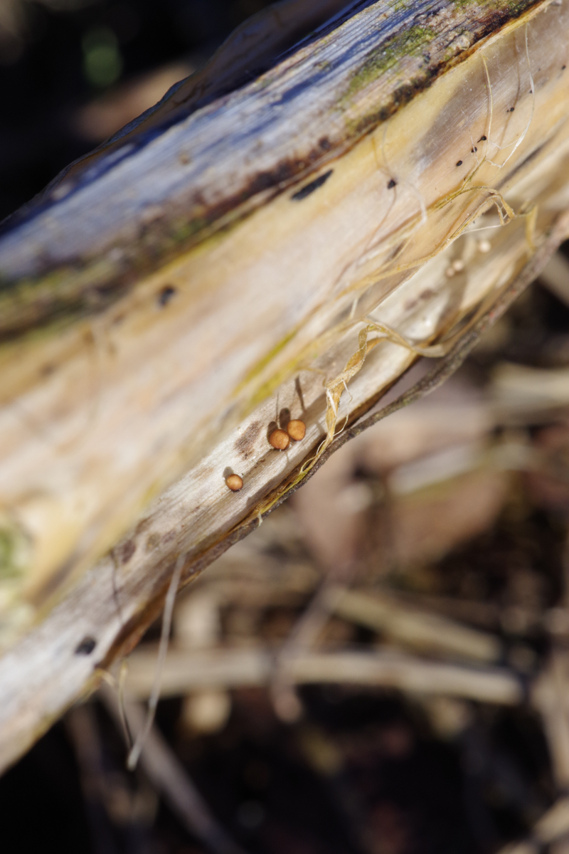an kräftigen Stängeln von vorjährigem Hanf, die über 3,5 m hoch waren, finden sich jetzt diese Gnubbels an der Rinde, sowohl von außen als auch innen, wo diese sich abgelöst hat. Der größte ist so etwa 3 mm im Durchmesser, gemessen. Im Schnitt, ziemlich feste Substanz, weiß mit schwarzer Haut, wie Xylaria longipes. Eine Probe habe ich für Björn schon eingepackt. Die braunen könnten die selbigen sein nur in jung, oder was ganz anderes.