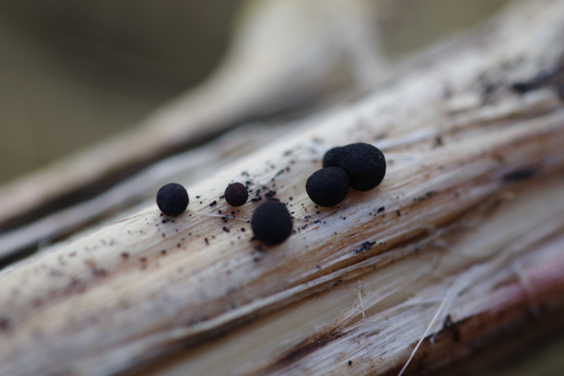 an kräftigen Stängeln von vorjährigem Hanf, die über 3,5 m hoch waren, finden sich jetzt diese Gnubbels an der Rinde, sowohl von außen als auch innen, wo diese sich abgelöst hat. Der größte ist so etwa 3 mm im Durchmesser, gemessen. Im Schnitt, ziemlich feste Substanz, weiß mit schwarzer Haut, wie Xylaria longipes. Eine Probe habe ich für Björn schon eingepackt. Die braunen könnten die selbigen sein nur in jung, oder was ganz anderes.