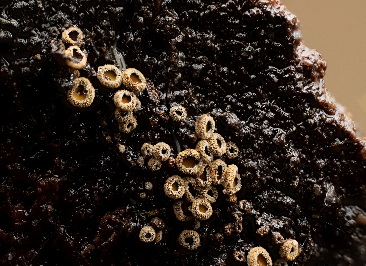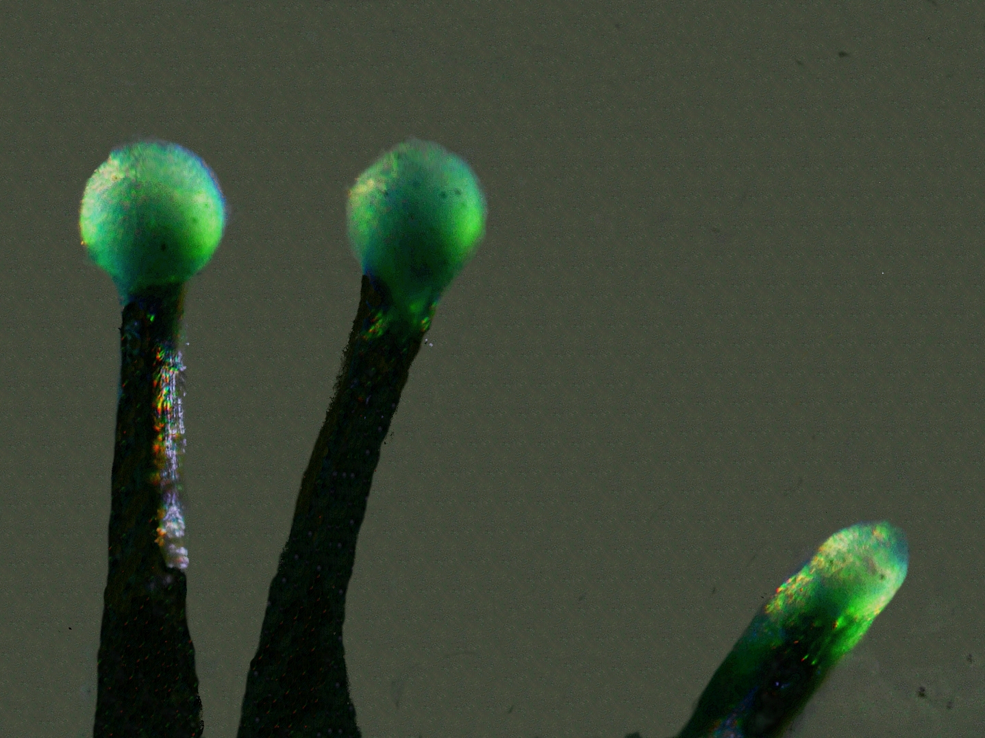 Zum Schluß, bei den ganzen Winterpilzen, dann nochmal nachgesehen was Dendrostilbella smaragdina macht. So spät im Jahr hatte ich sie noch nicht, aber waren da. Fotografiert habe ich sie heute nicht, aber im Dezember mal eine Test durch Mikroskope mit 200er Vergrößerung - ist noch ausbaufähig...