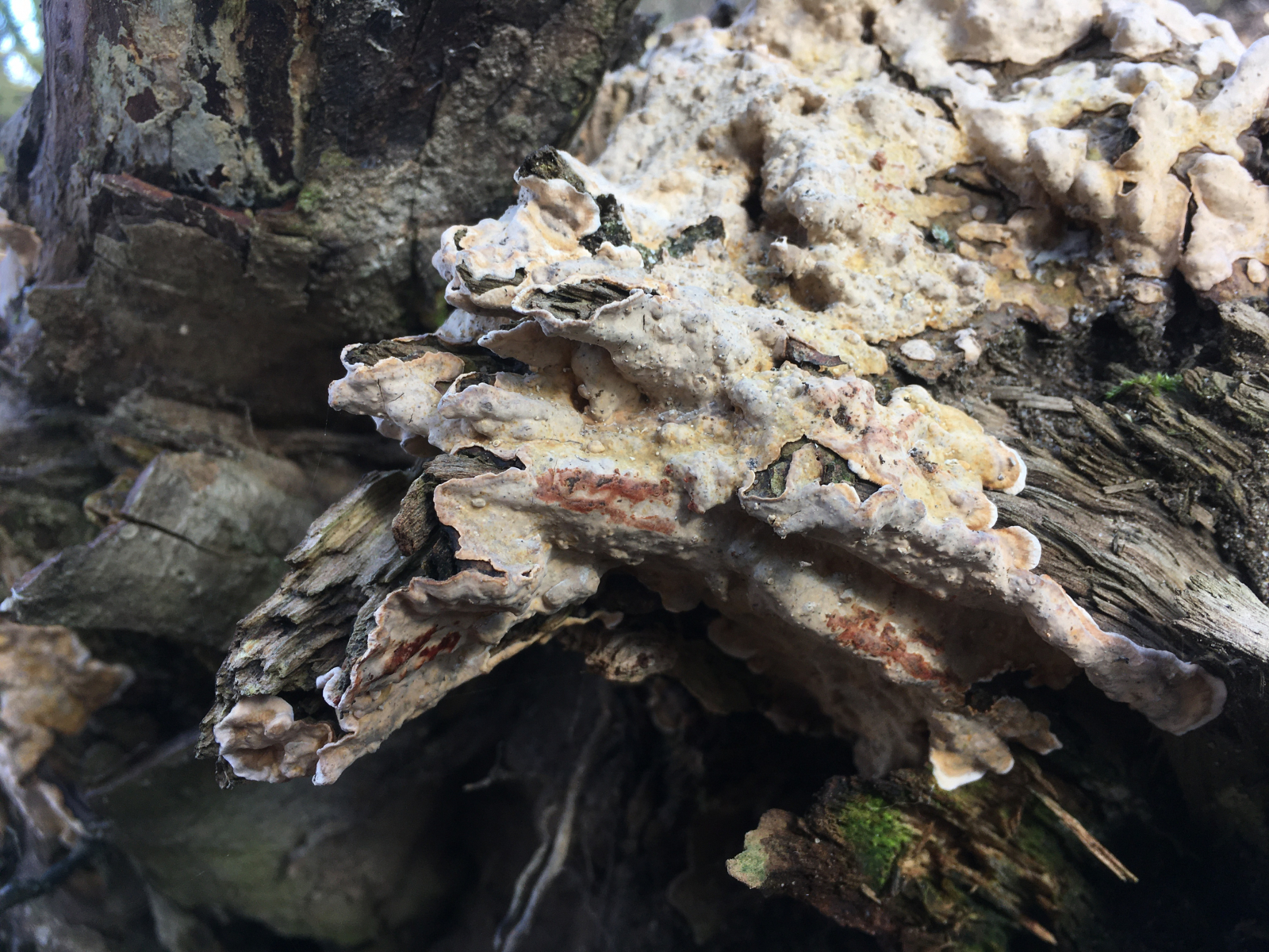 1) den Anfang macht einer den ich schon mal im Krimi gezeigt hatte, an alter Eiche, überwiegend resupinat, auf Kratzen orangerot. Ich hätte ihn mit Stereum gausapatum angesprochen.